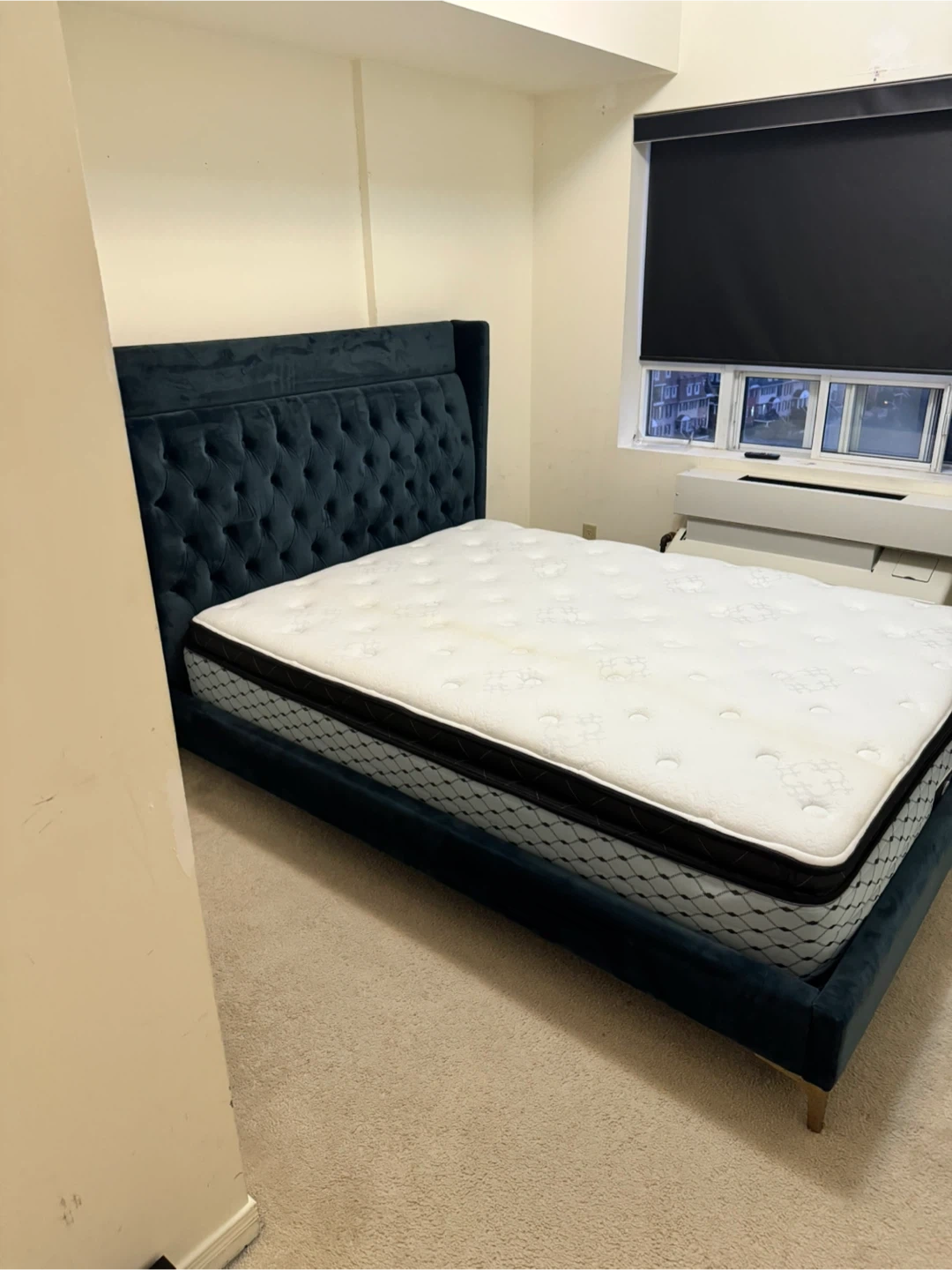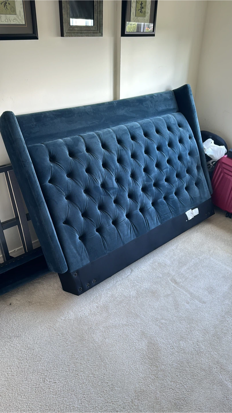 Selling a queen-size headboard with a beautiful tufted blue velvet finish. It's in great condition and would add a touch of elegance to any bedroom