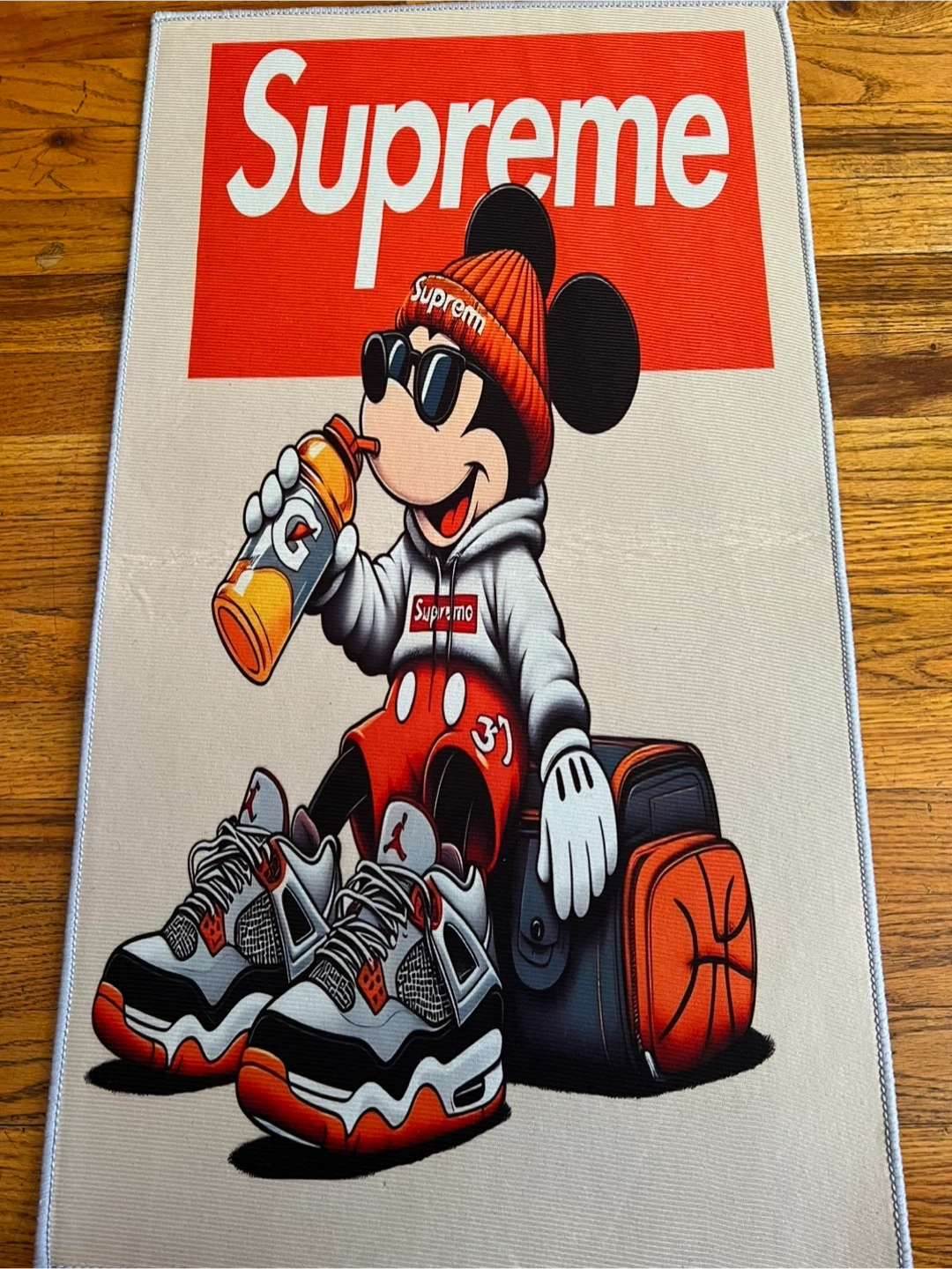 Selling a Supreme wall art/rug featuring Mickey Mouse. The rug has a unique design with Mickey Mouse wearing Supreme gear and drinking Gatorade. It's a fun and stylish piece for any room!