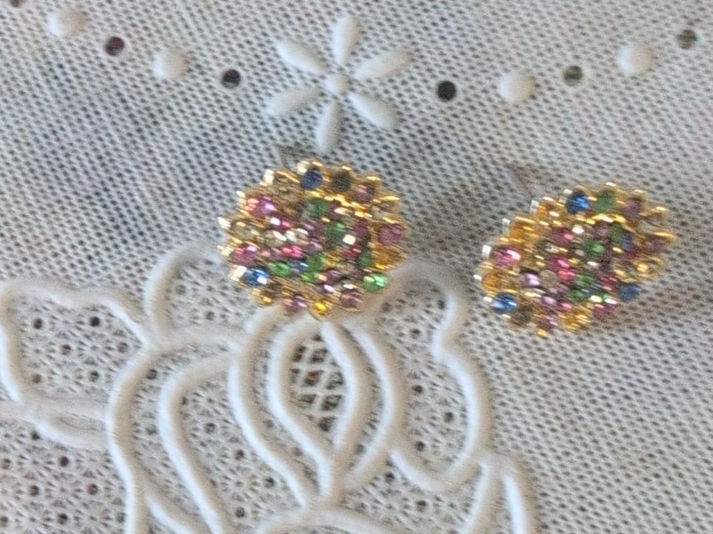 These are a pair of vintage stud earrings. They feature a gold-tone base with colourful rhinestones. They would make a lovely addition to any outfit!