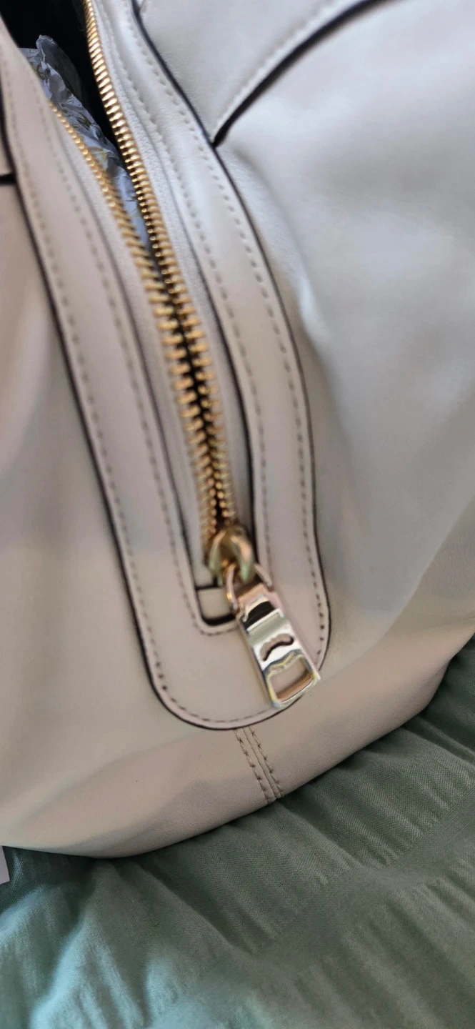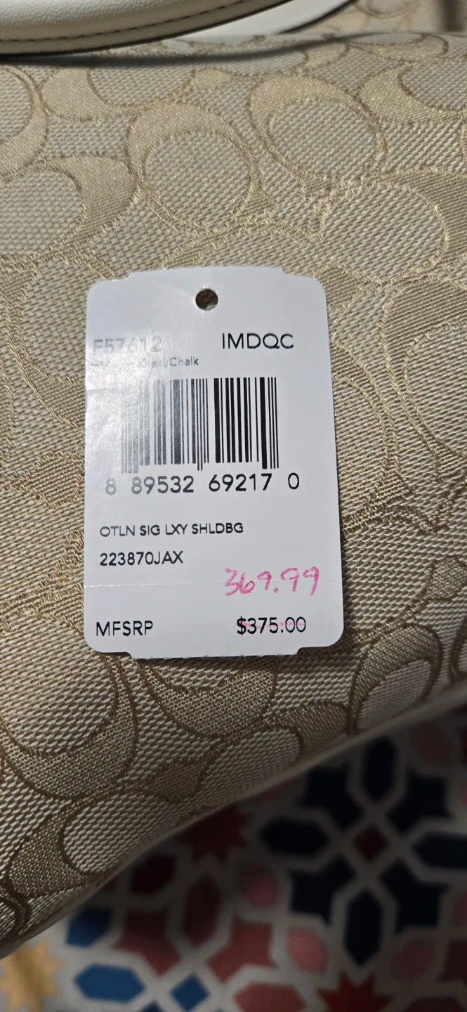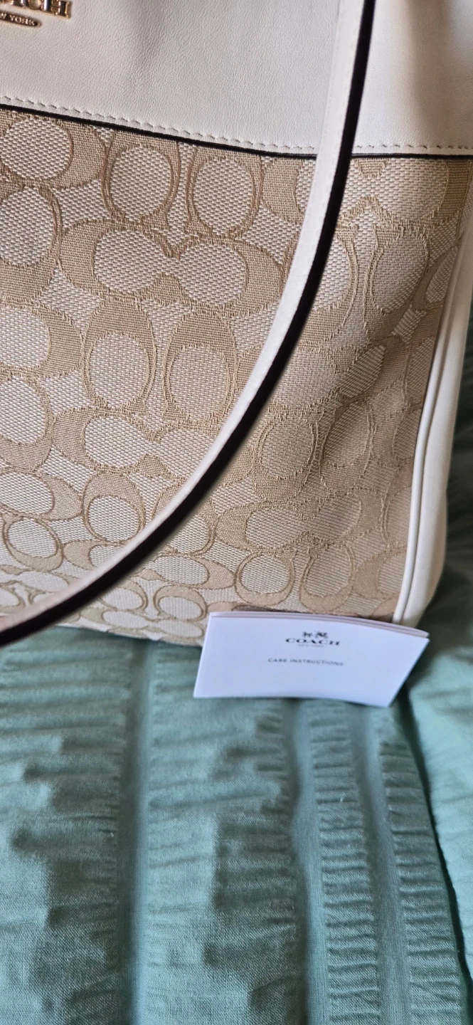 Selling a beautiful Coach handbag in ivory and beige. It's in excellent condition and features the classic Coach logo pattern. The interior is spacious and clean. Comes with care instructions!