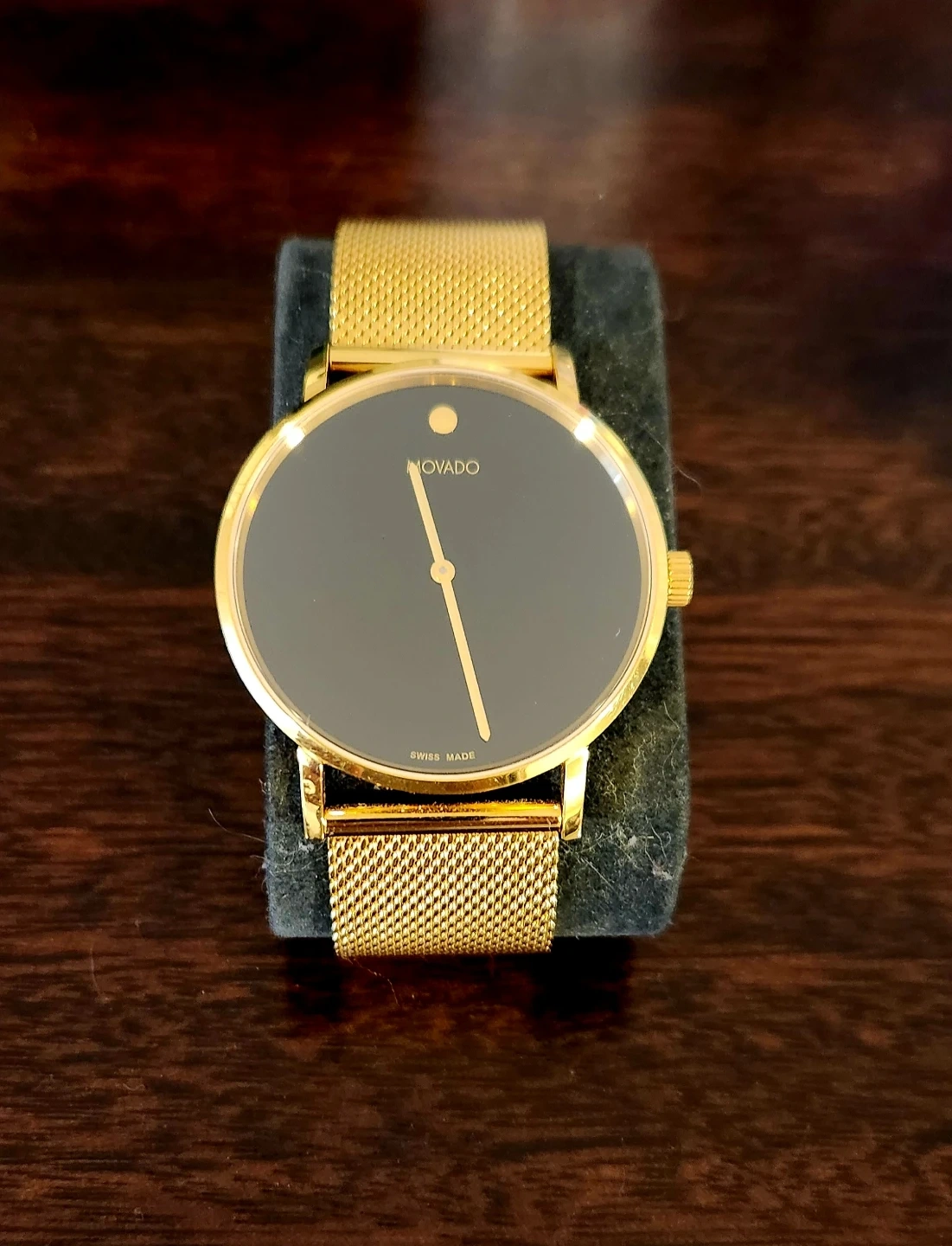 Selling a Movado watch with a gold mesh band. It's in great condition and has a classic, elegant look. The minimalist design and Swiss craftsmanship make it a timeless piece!