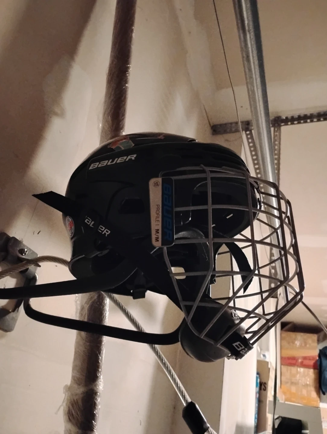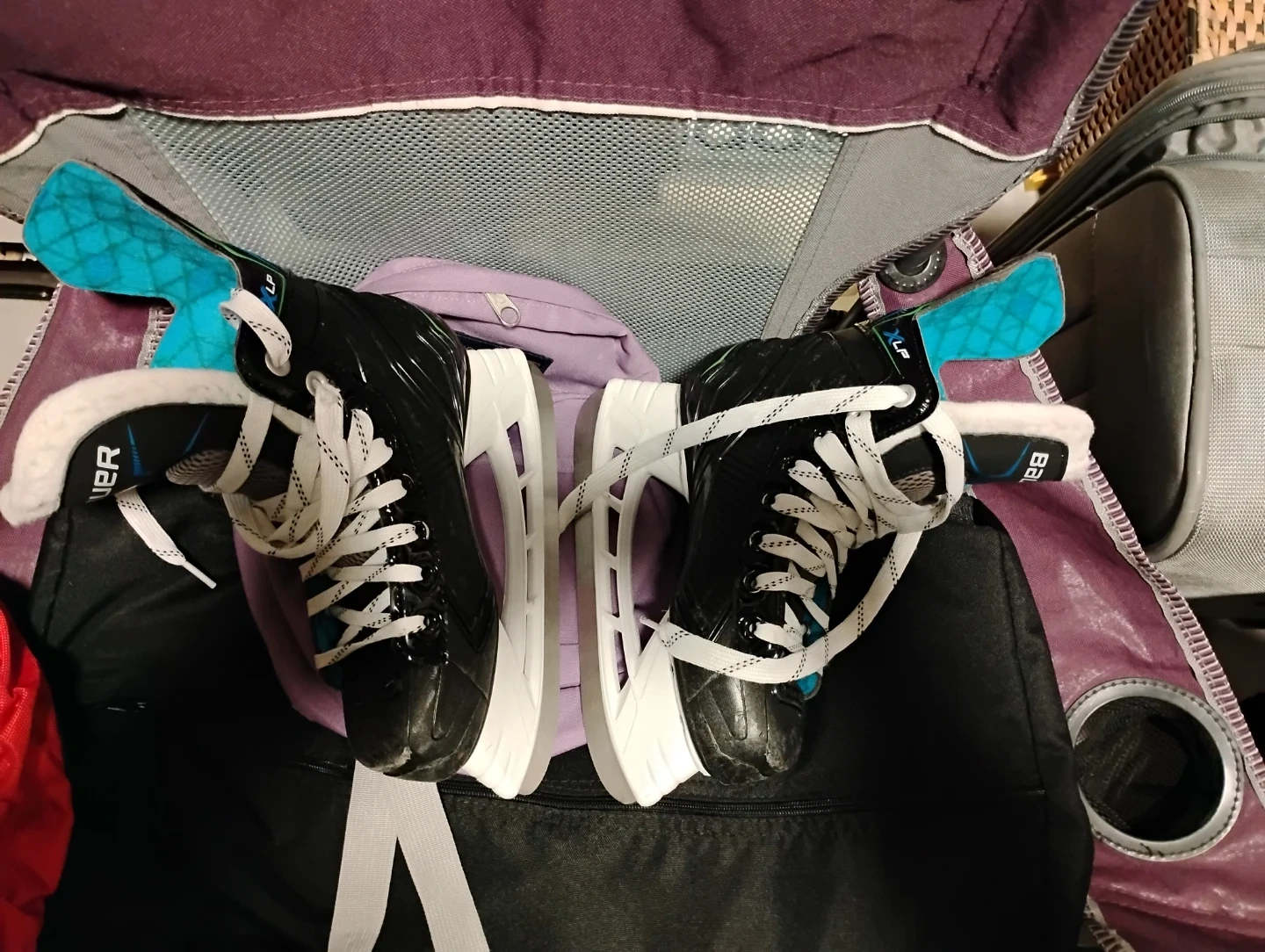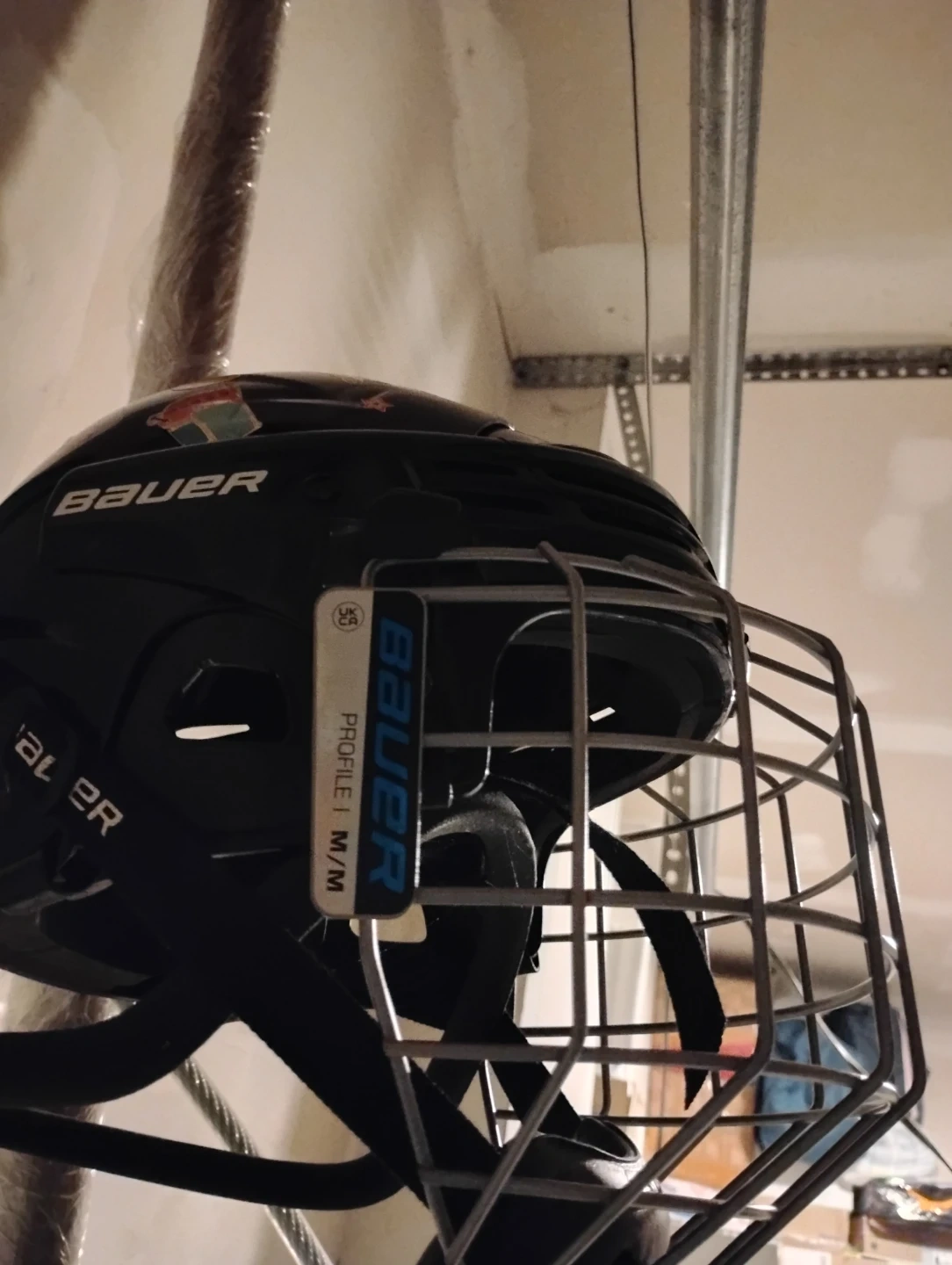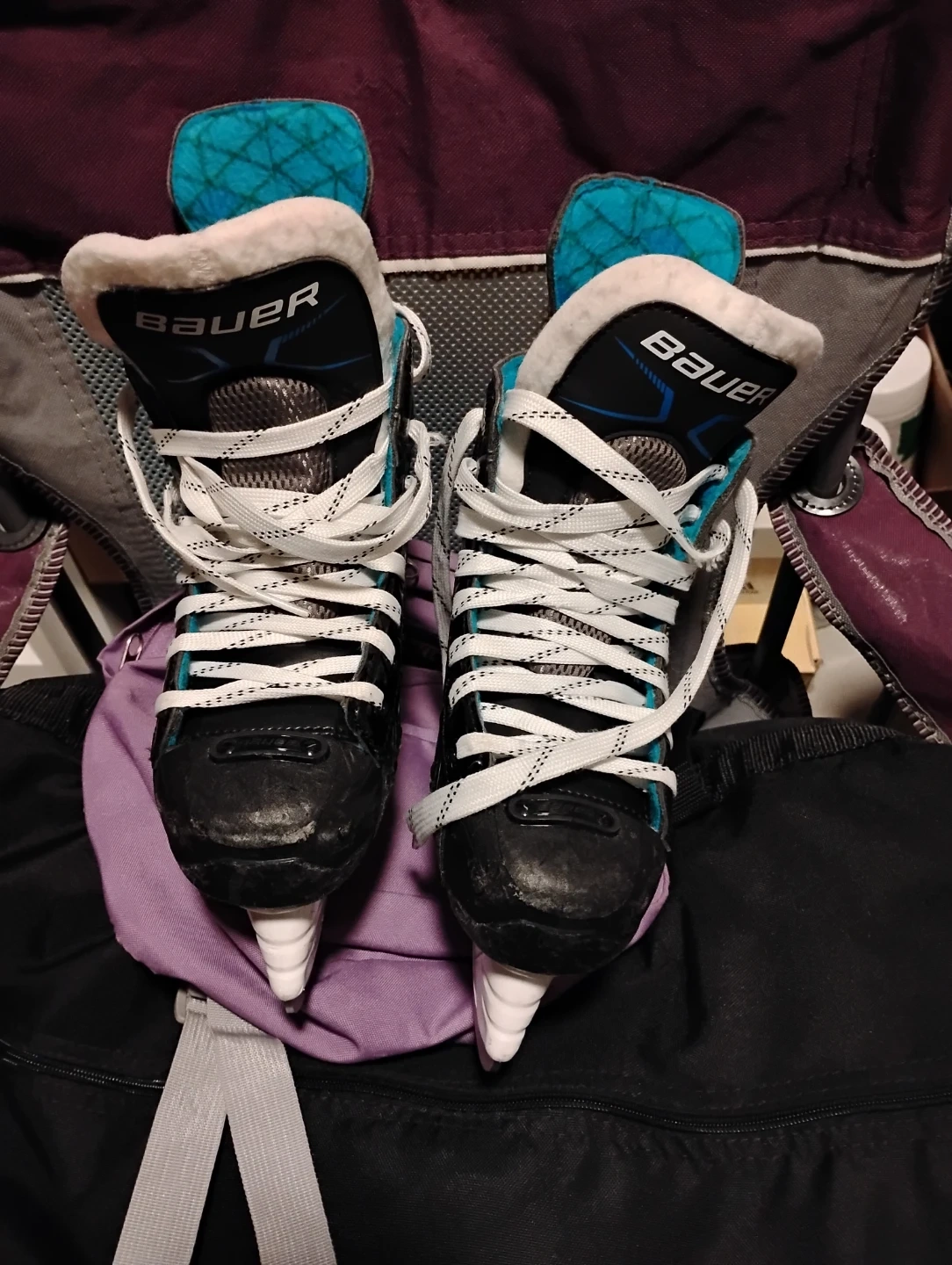 Selling a pair of Bauer hockey skates and a Bauer hockey helmet. The helmet has some fun stickers on it! M size