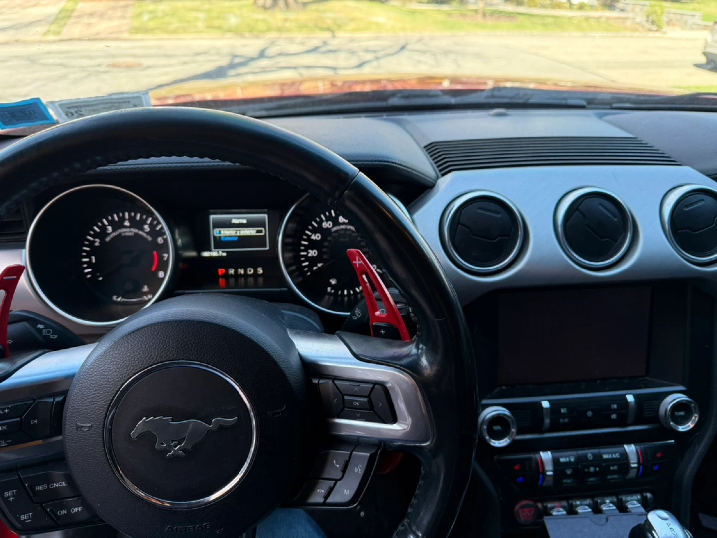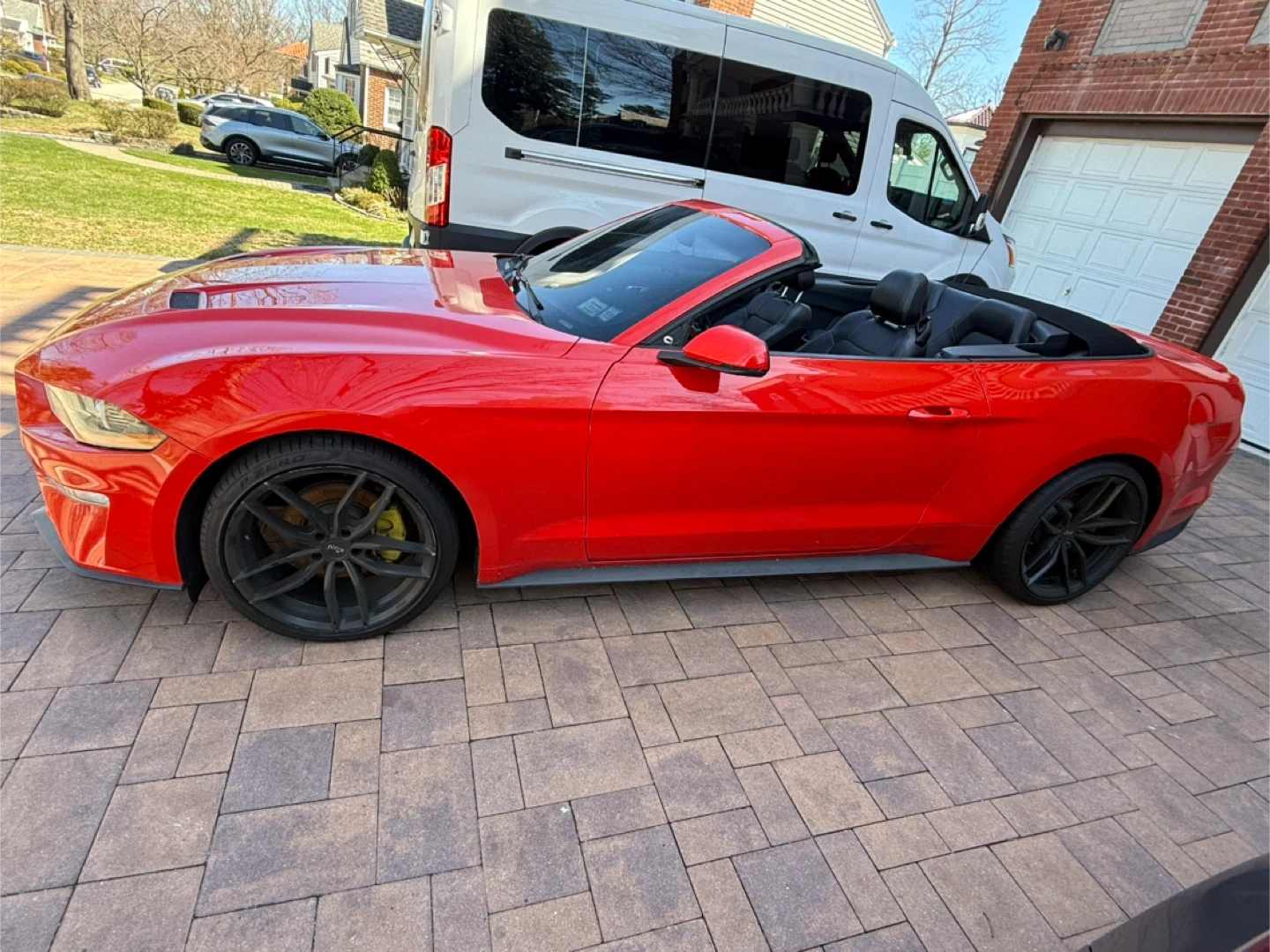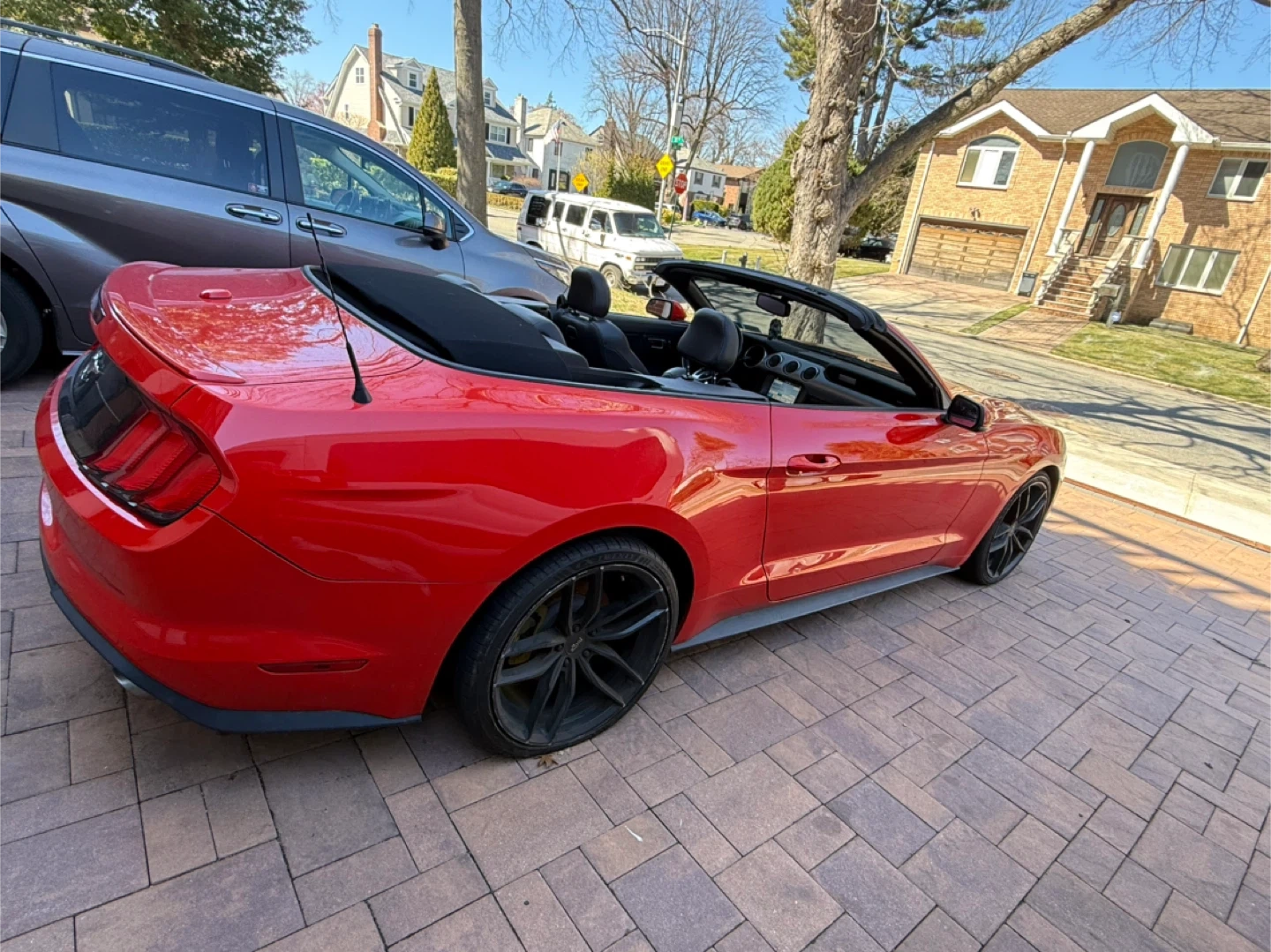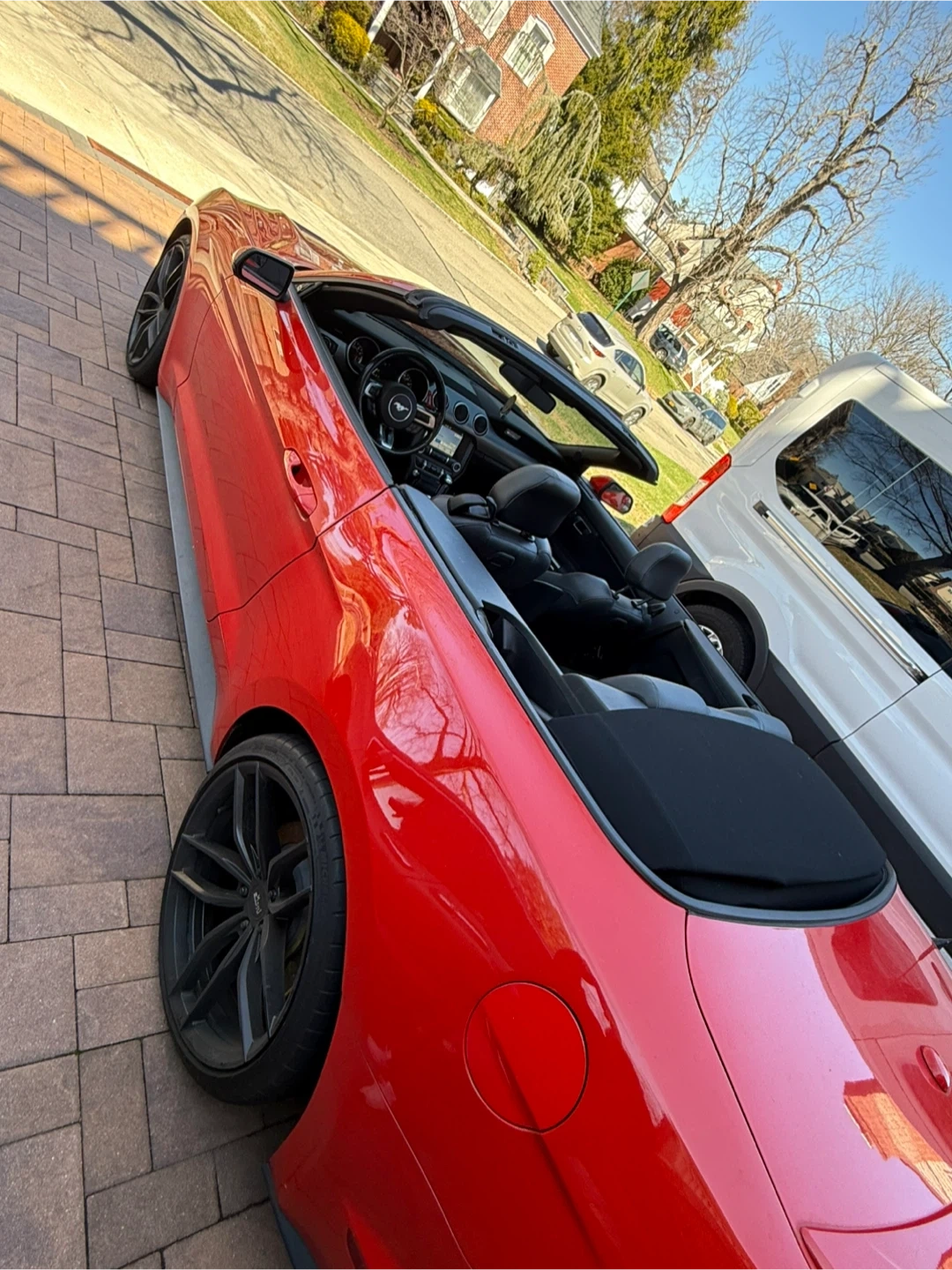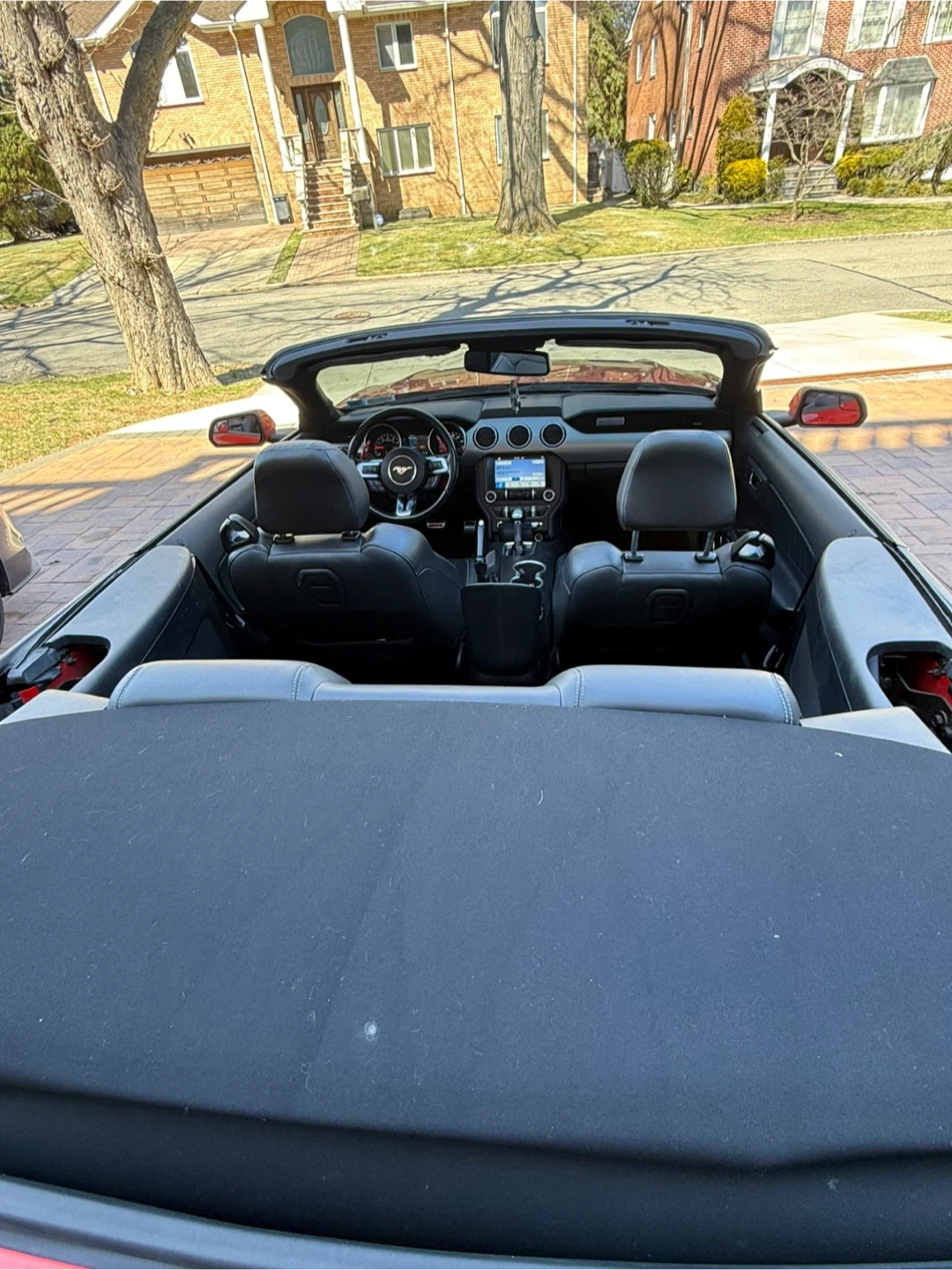 Selling a red Ford Mustang convertible. It's in great condition and ready for a new owner! The interior is black leather, and the car has a sleek, sporty look. Perfect for cruising around town or enjoying a sunny day with the top down