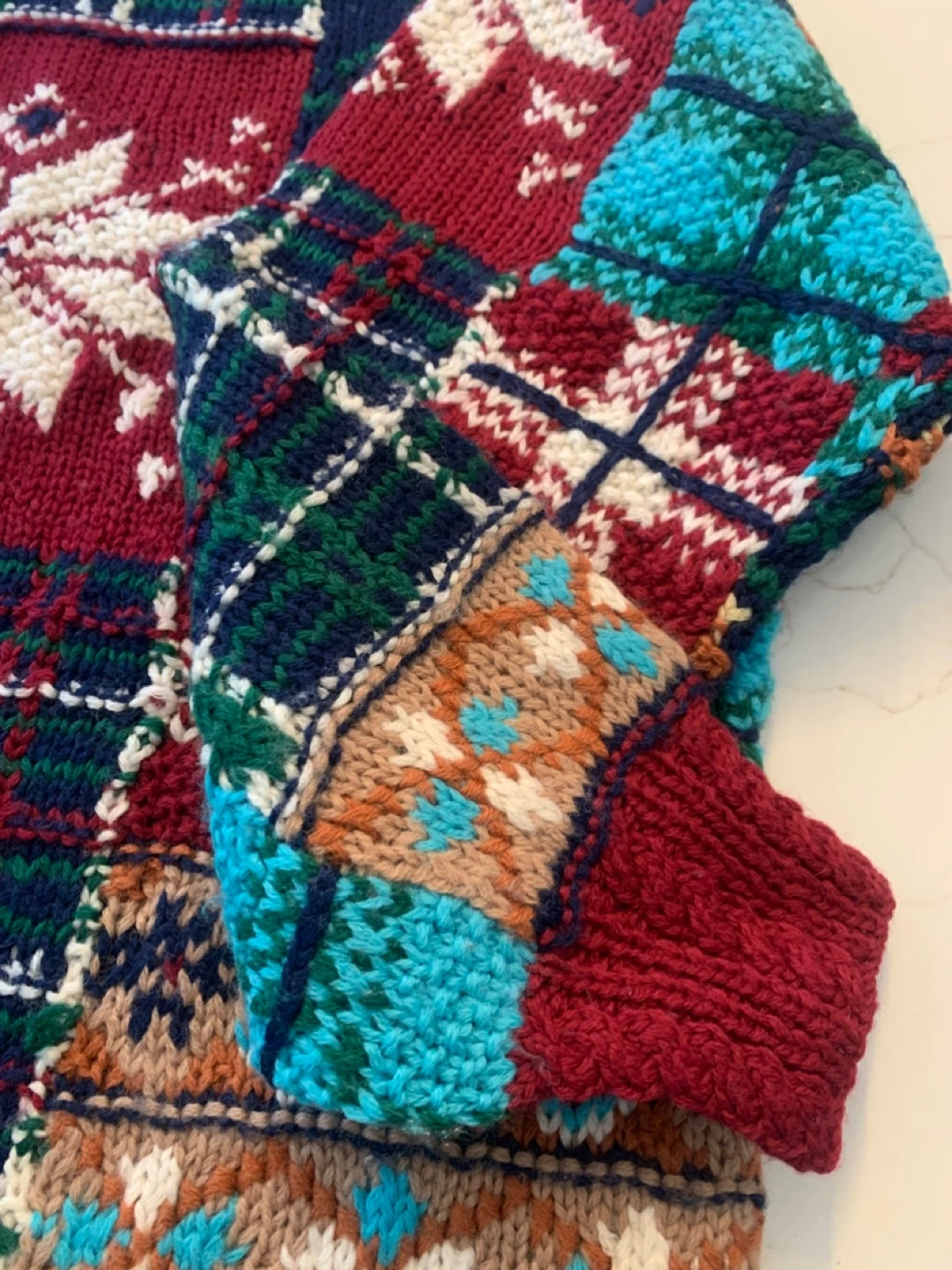 Here’s a colourful Boaz knit sweater! It features a unique patchwork design with various patterns and colours. Perfect for adding a fun, cozy touch to your wardrobe!