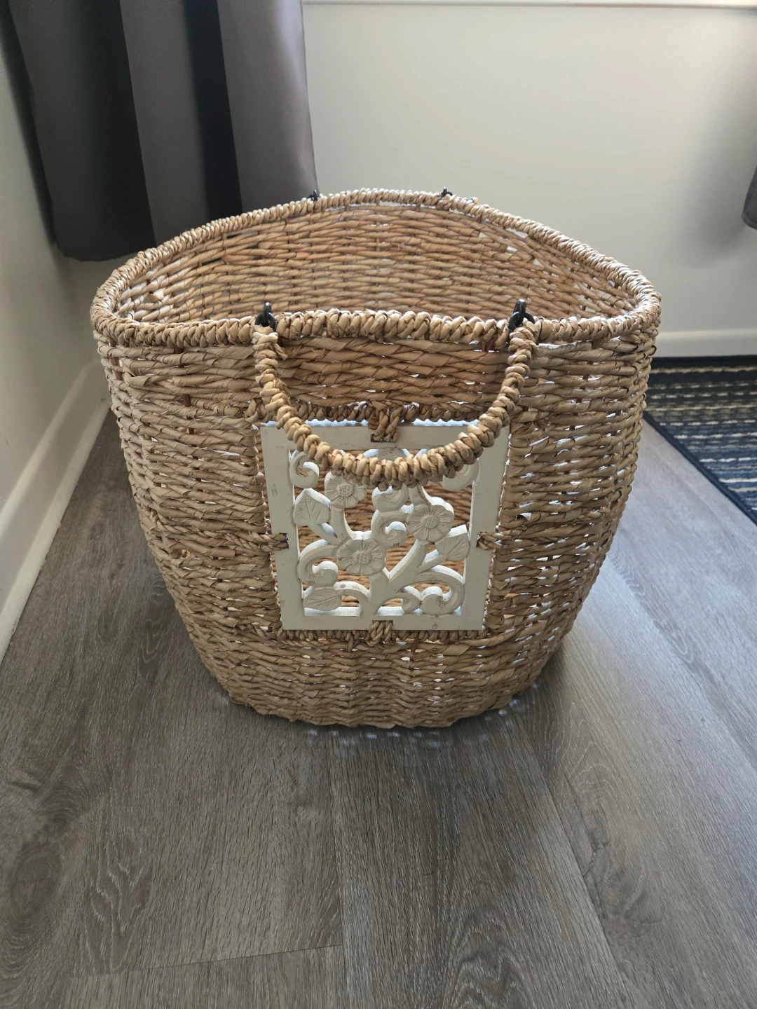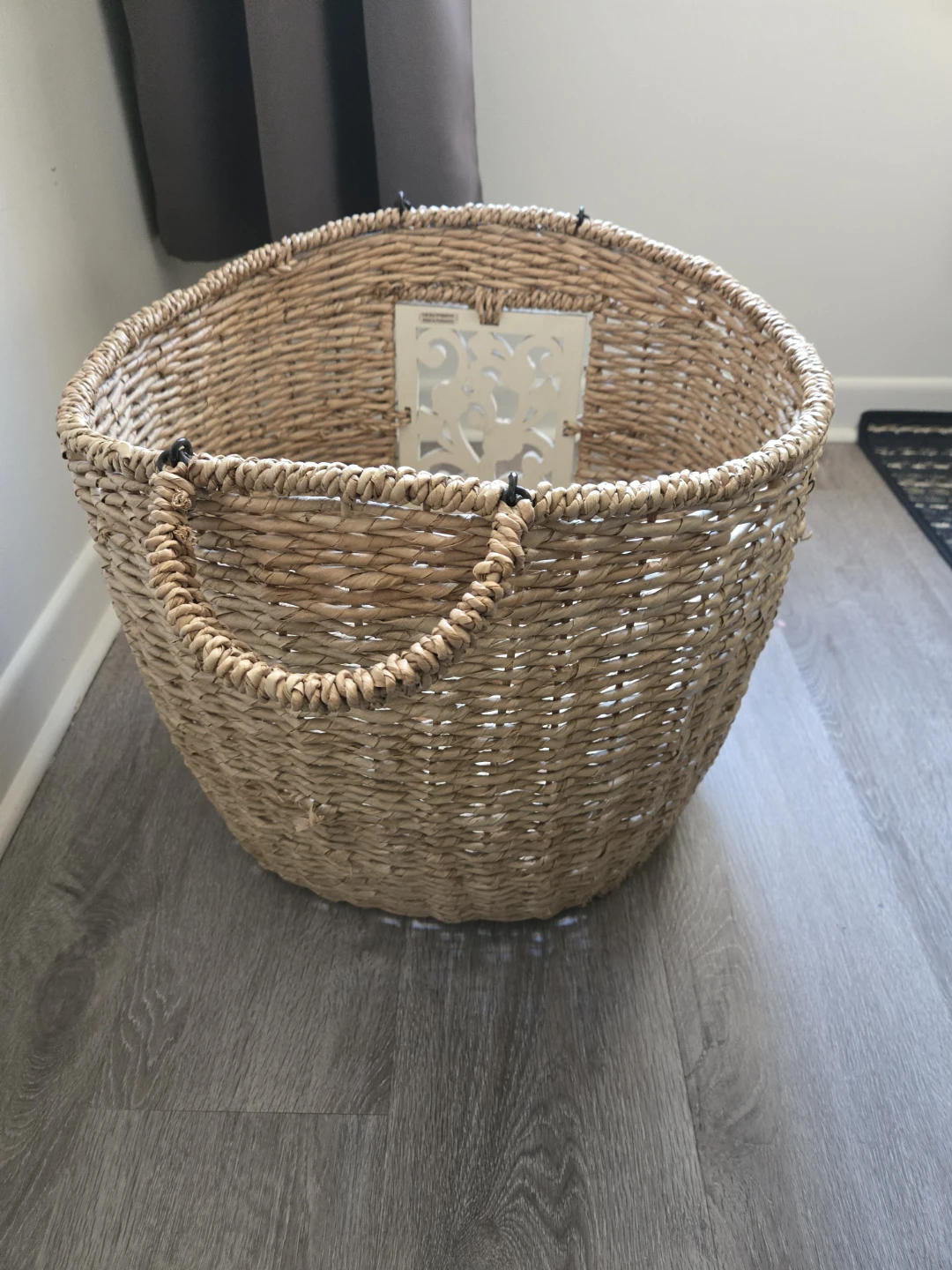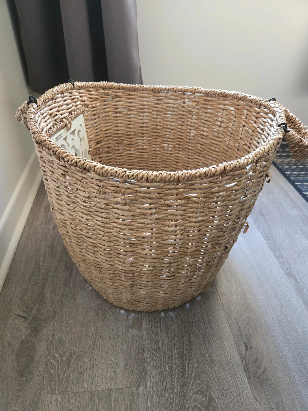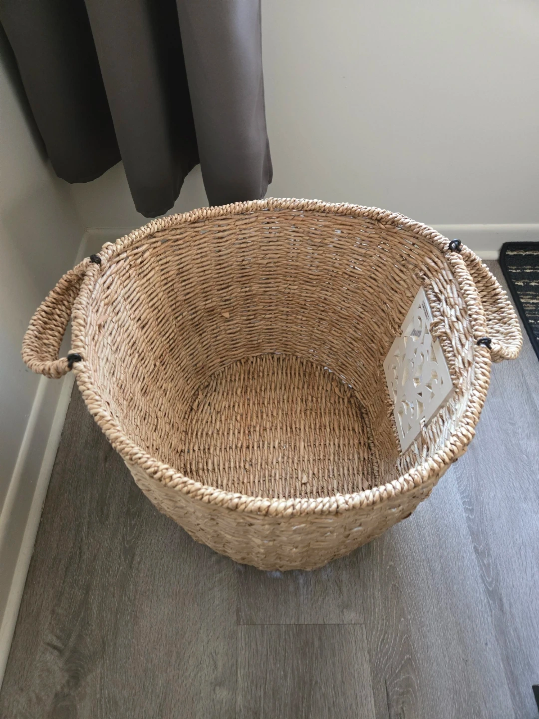 Free sturdy woven basket, perfect for storage or decor! It features convenient handles and a decorative white accent. It's in great condition and ready for a new home!