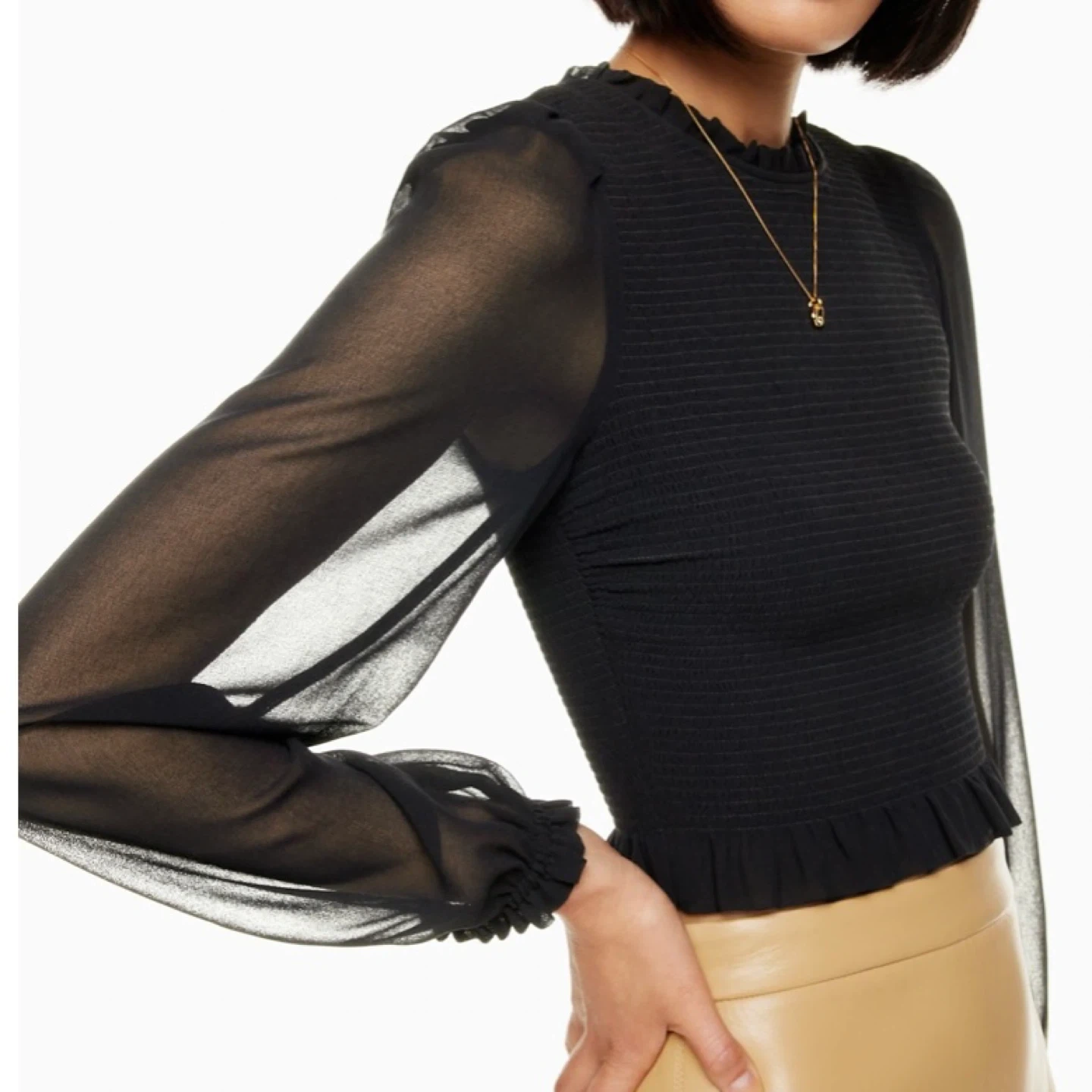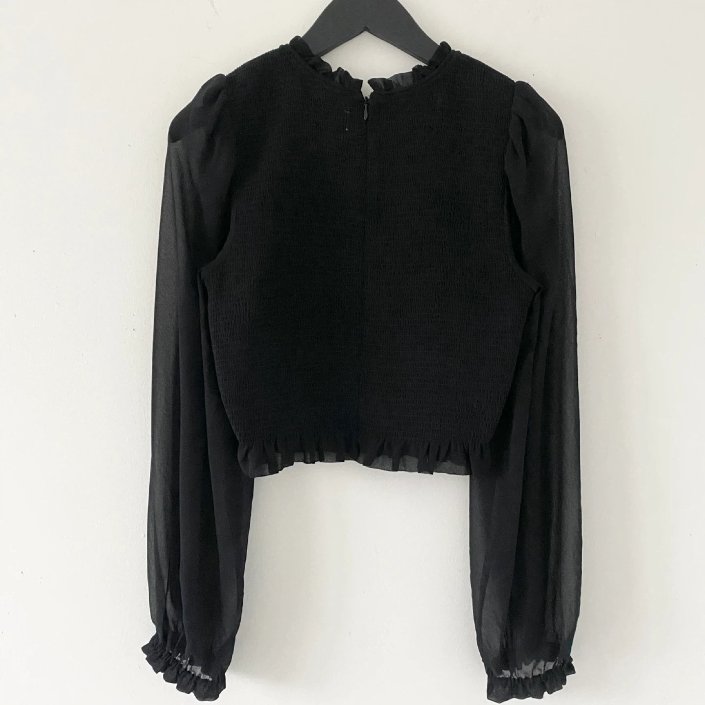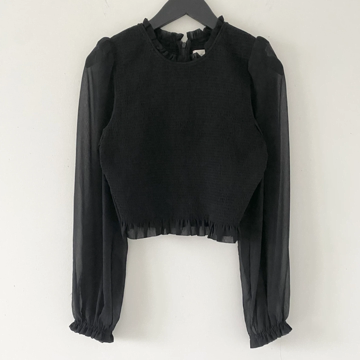 This is a smocked (very stretchy) blouse with sheer puff sleeves and a ruffle trim. It's cut from lightweight, semi-sheer fabric with an ethereal drape that’s made from 100% recycled materials. There's no staining or damage. It's clean and in excellent condition.