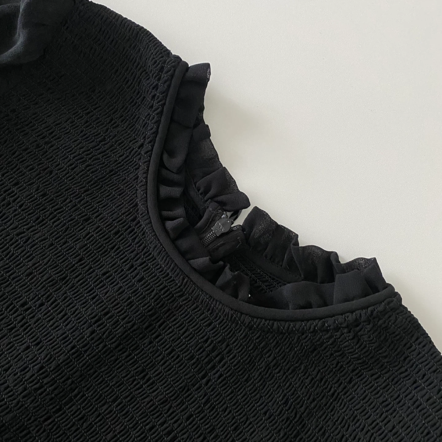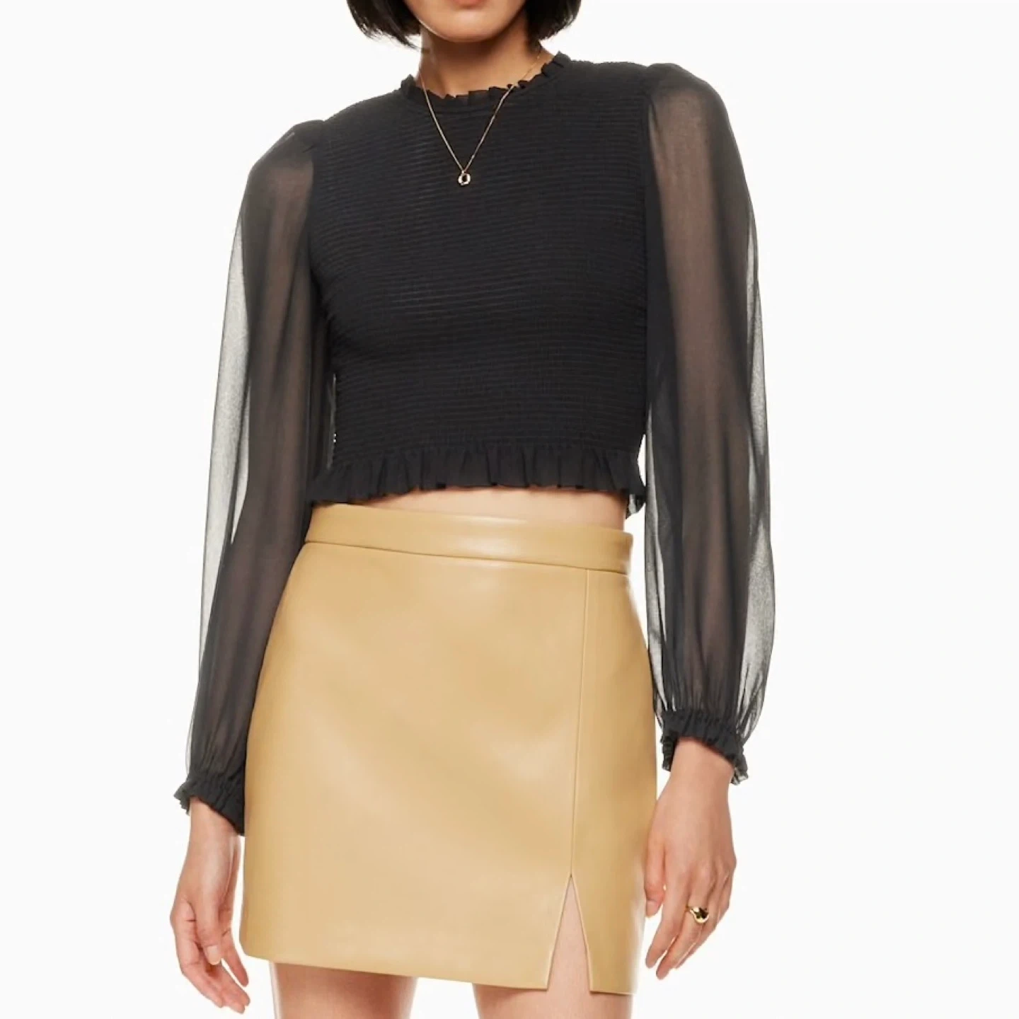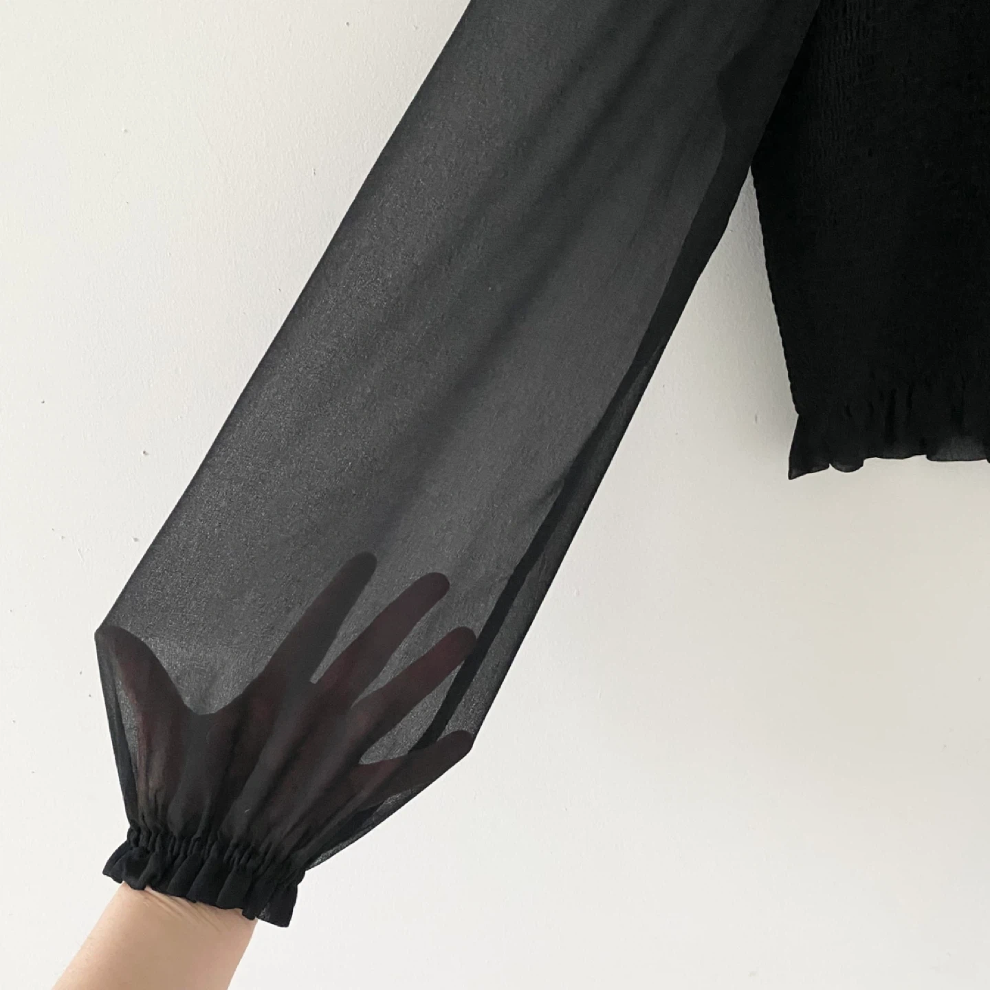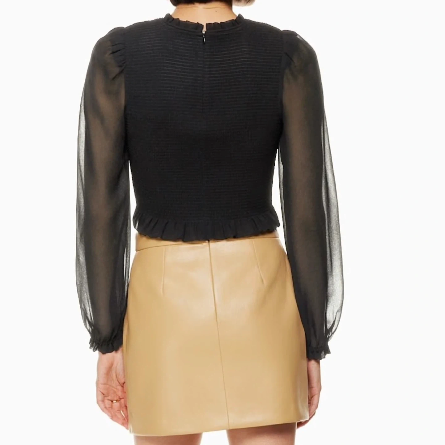 This is a smocked (very stretchy) blouse with sheer puff sleeves and a ruffle trim. It's cut from lightweight, semi-sheer fabric with an ethereal drape that’s made from 100% recycled materials. There's no staining or damage. It's clean and in excellent condition.