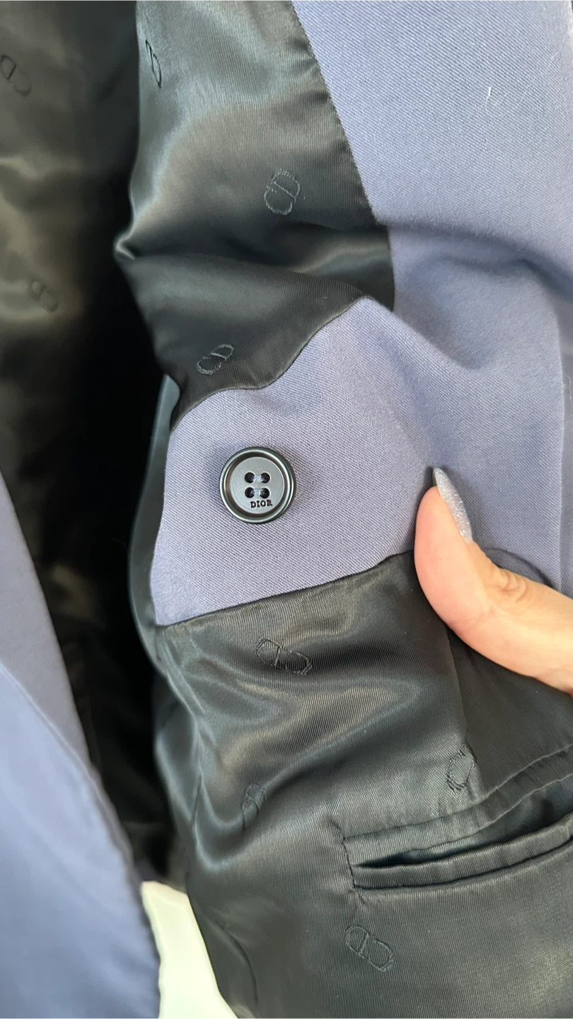Selling a beautiful Dior blazer in a lovely blue colour! The jacket features a sleek design with the Dior logo subtly incorporated into the lining and buttons. It's in great condition and ready to elevate your wardrobe!