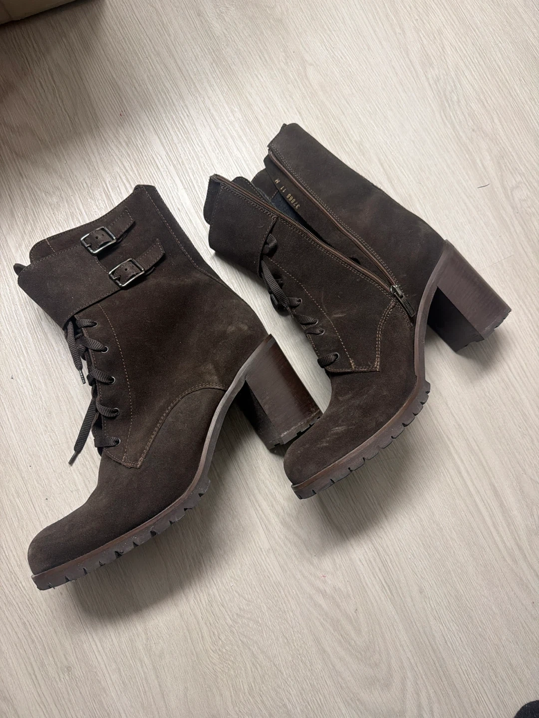 Here are some stylish brown suede heeled boots! They feature a lace-up design with buckle detailing and a convenient side zipper. The boots are in great condition and ready for a new owner. Size 11
