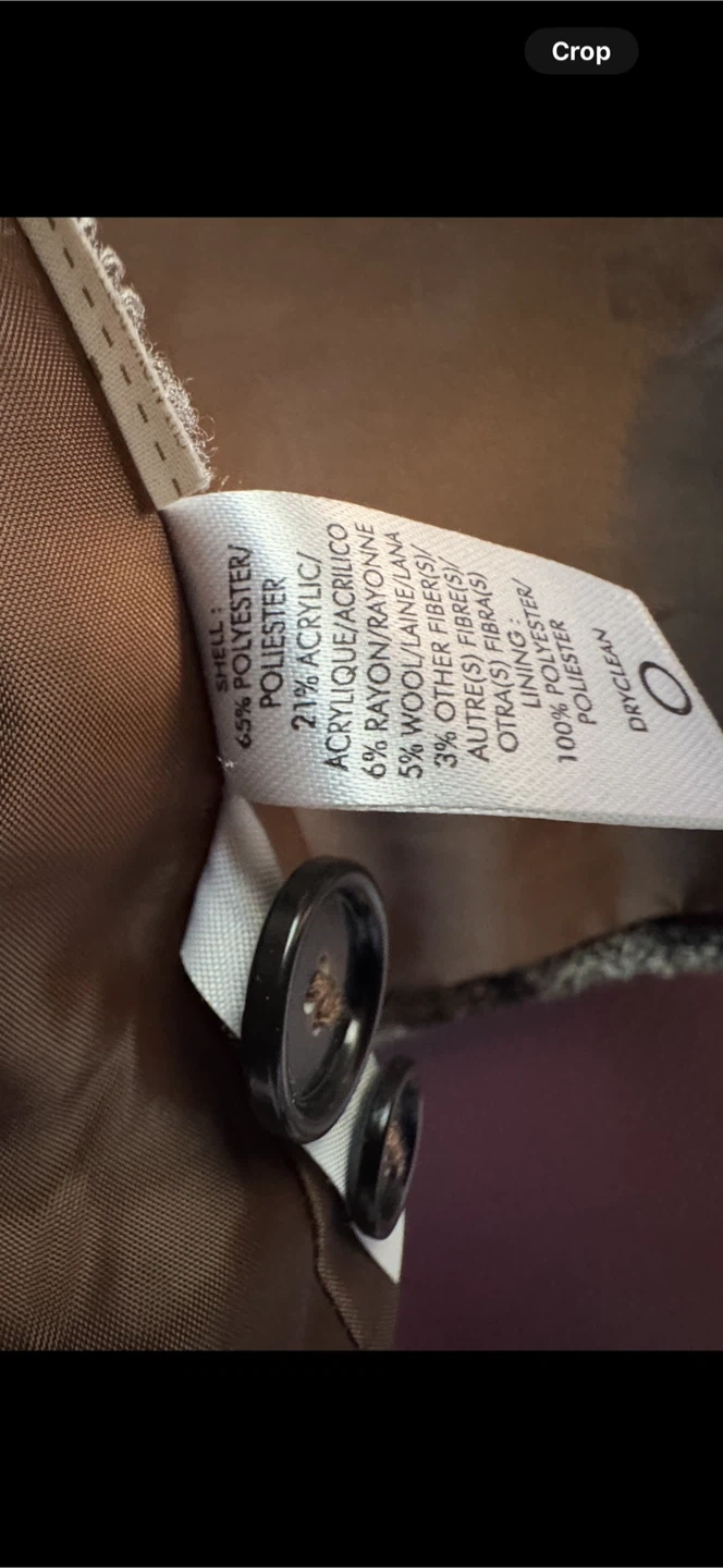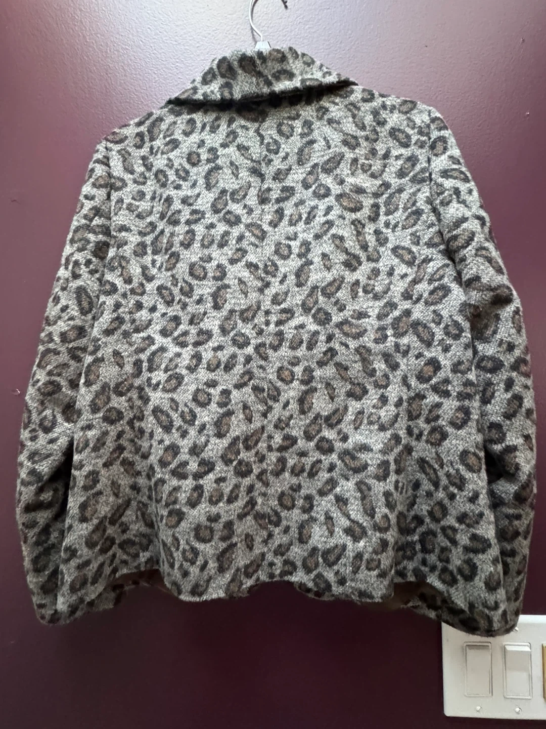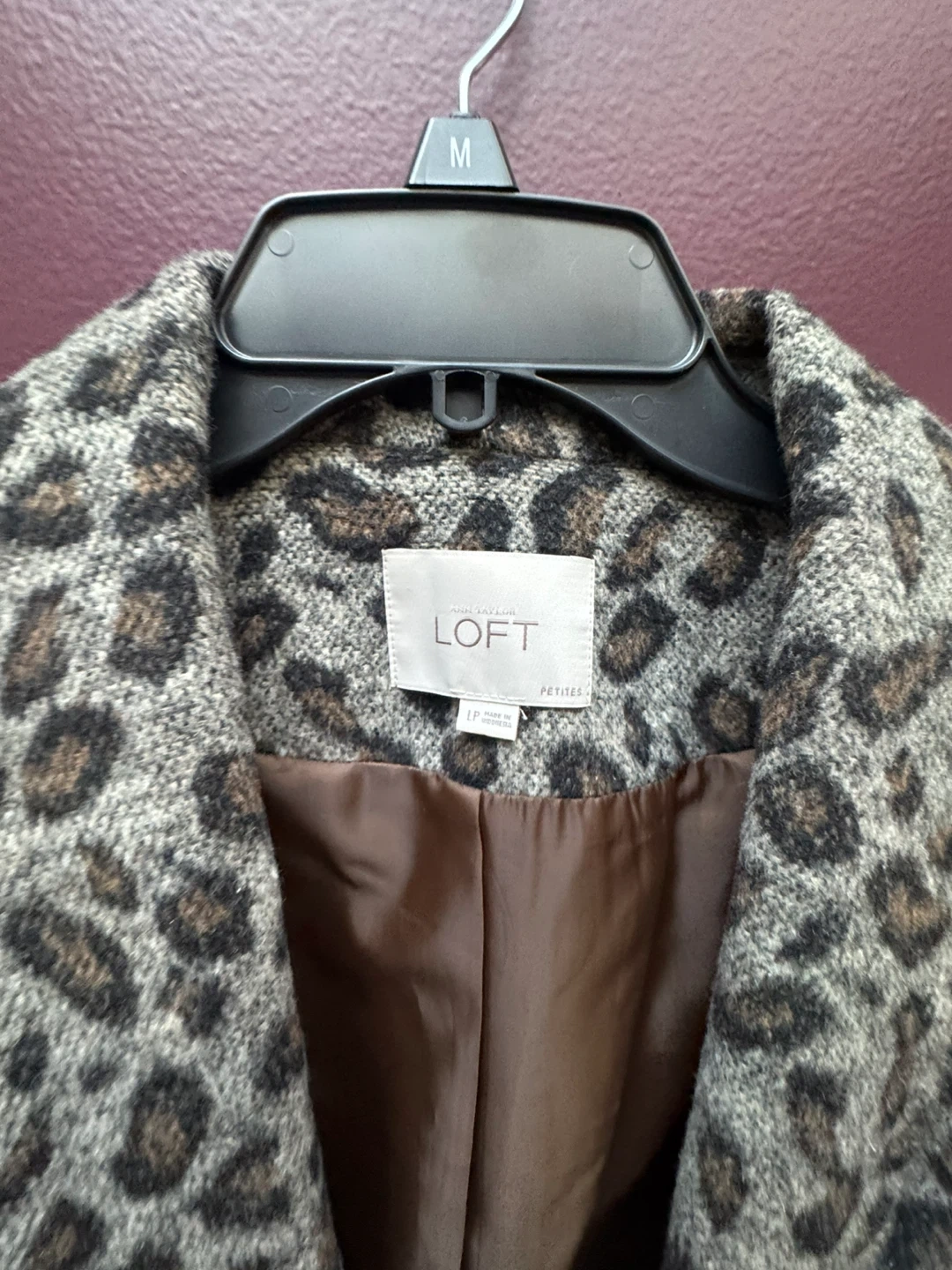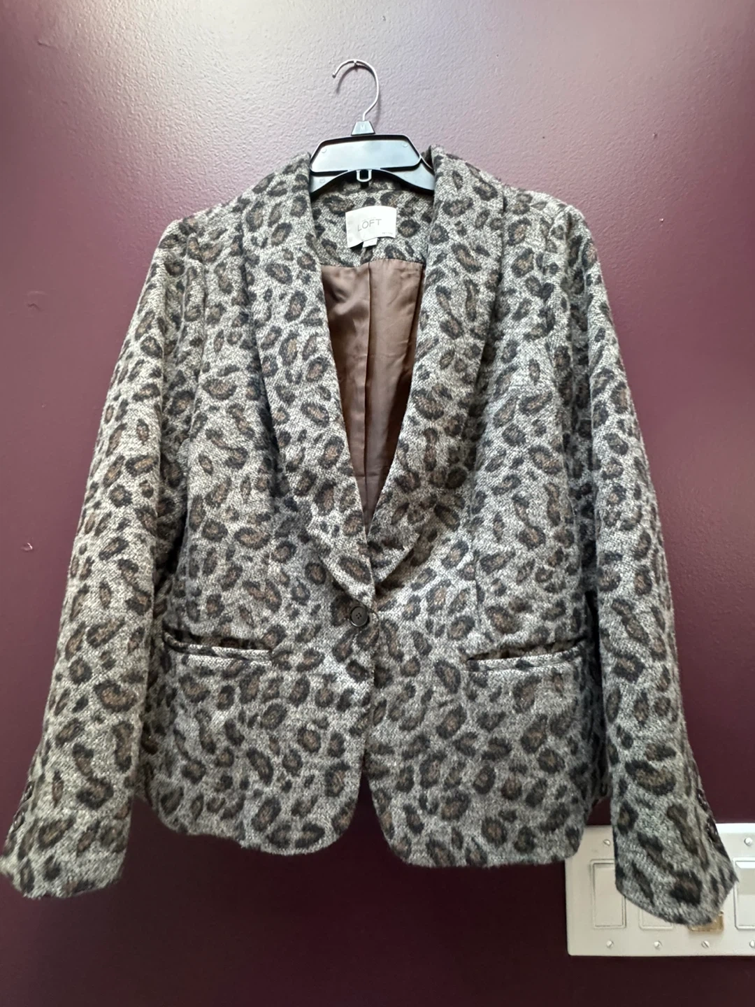 Selling a LOFT blazer with a fun leopard print! It's a size Large Petite. The outer shell is made of a blend of polyester, acrylic, rayon, and wool, while the lining is 100% polyester