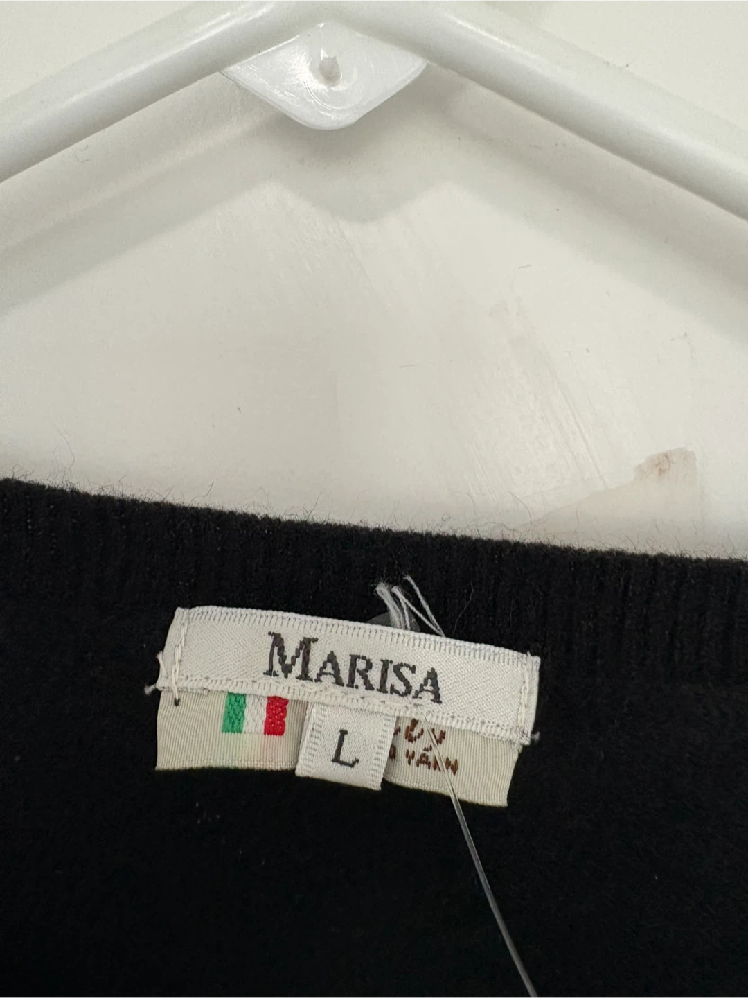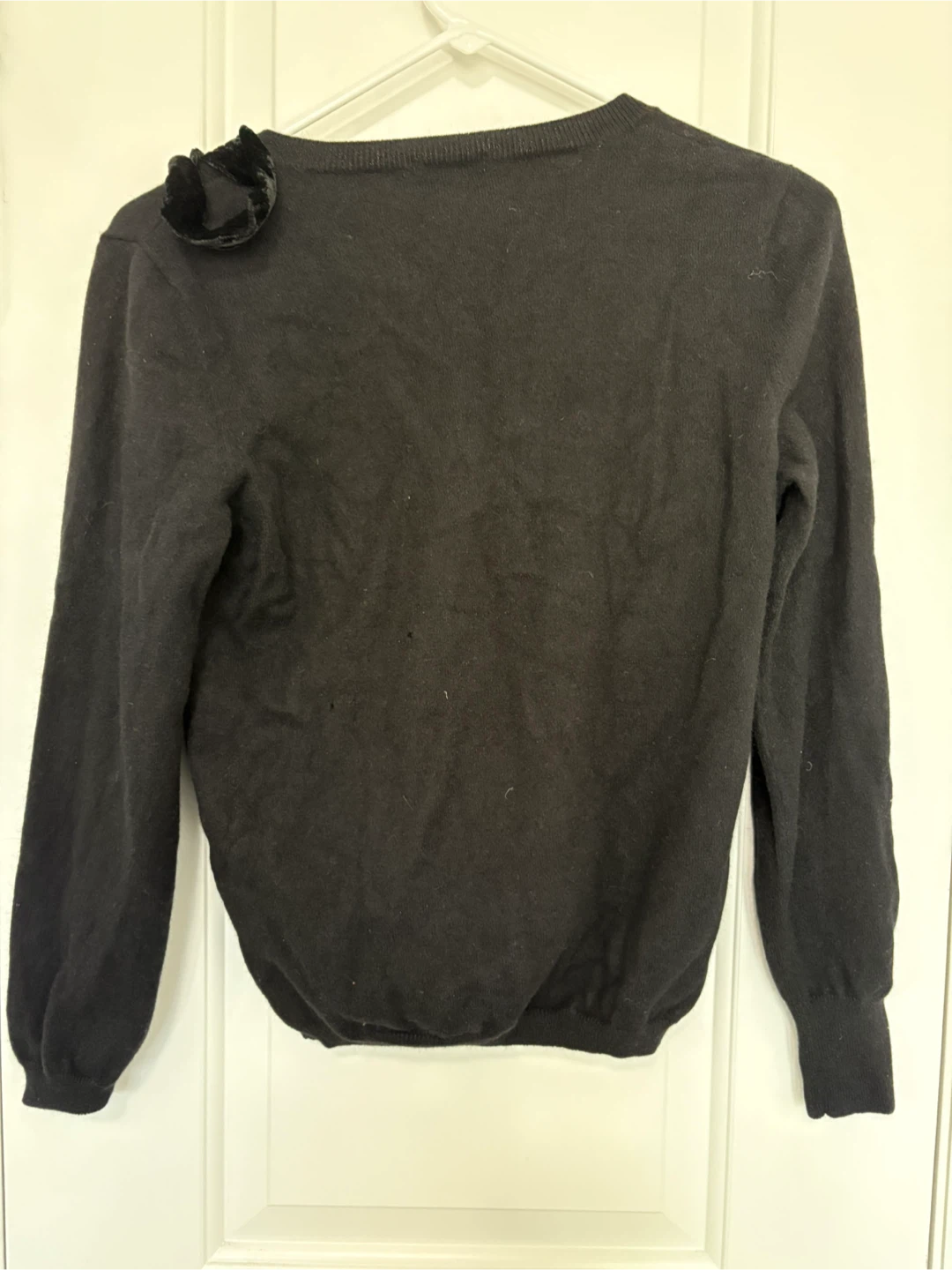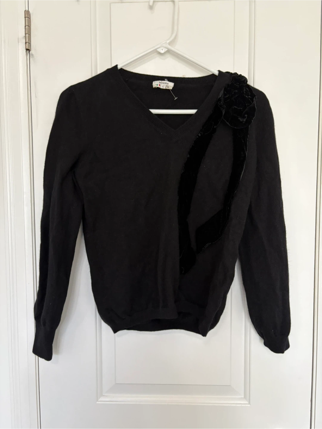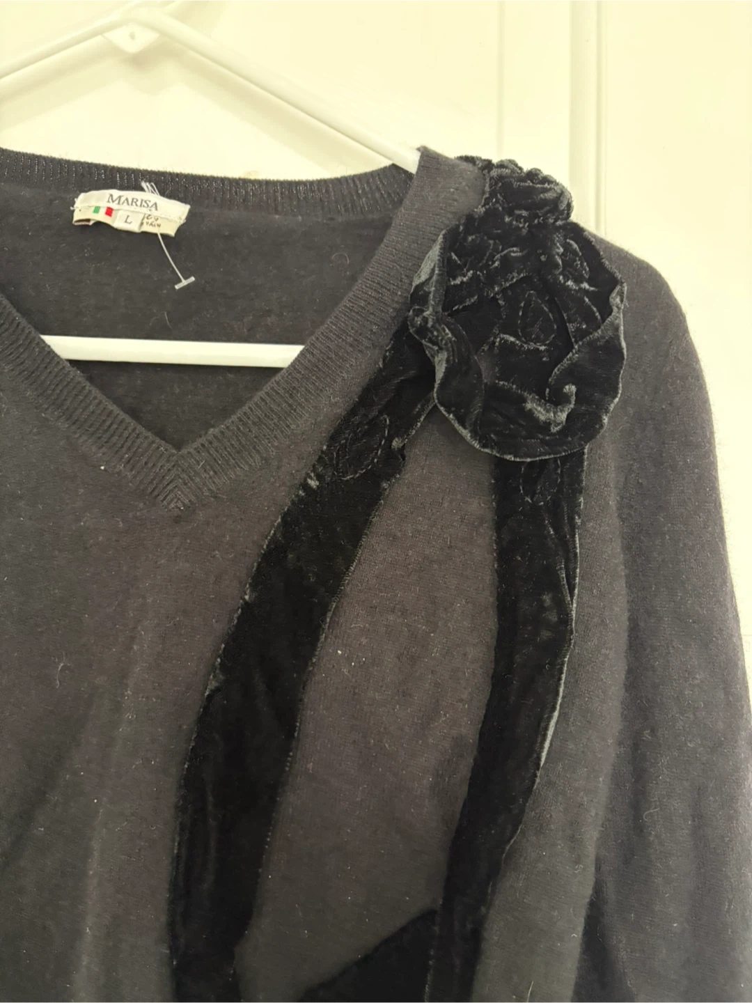 Vintage sweater made of 68% wool and 32% angora. Tagged as a size large but fits more like a medium. Black with a black velvet detail on the left side. Made in Italy. Two very small moth holes are on the back and that’s why it is $5. With a black shirt underneath they wouldn’t be noticeable. Pickup near Sherbourne St and Adelaide Street East or sometimes at some TTC stations. Thanks
