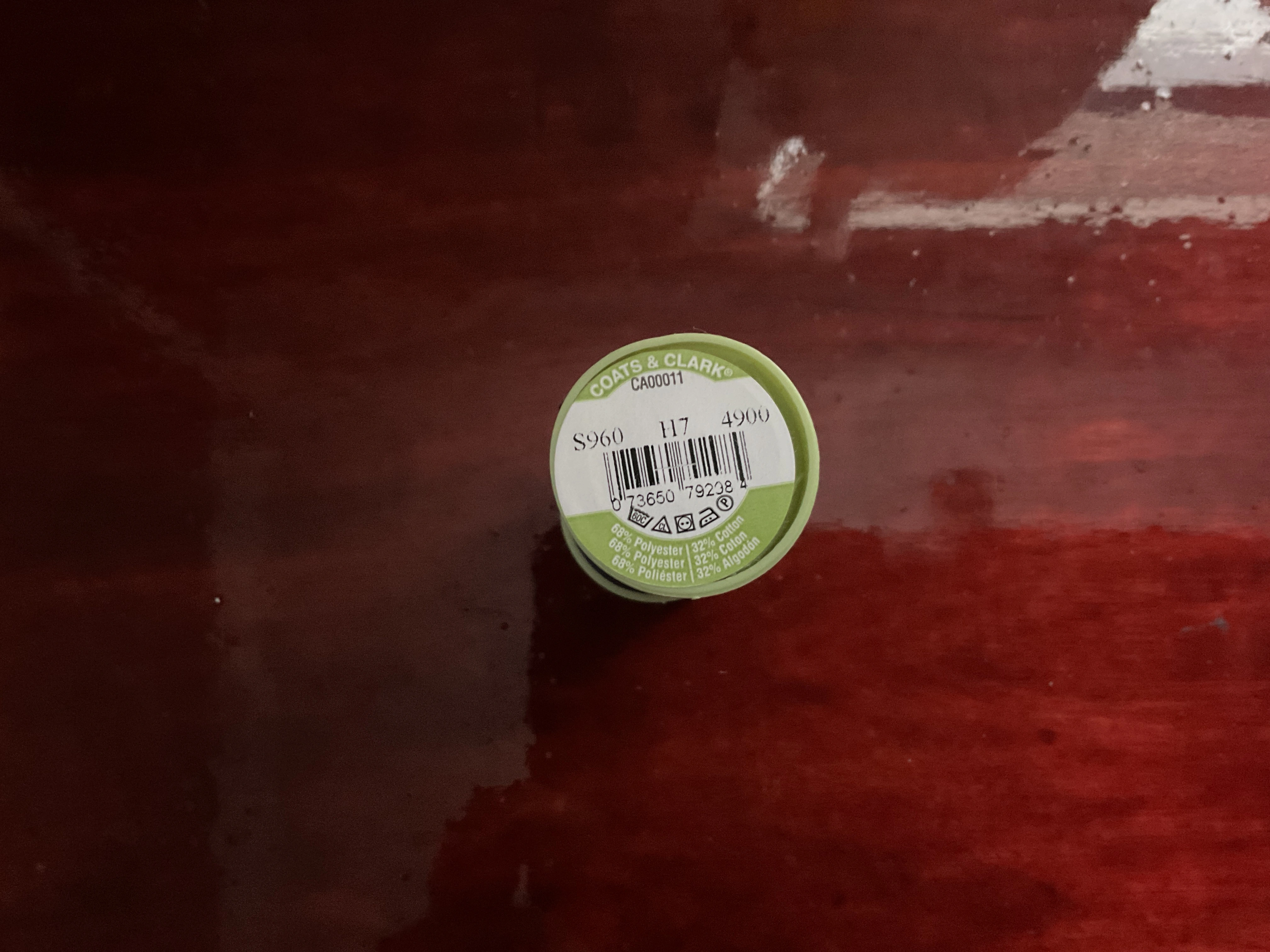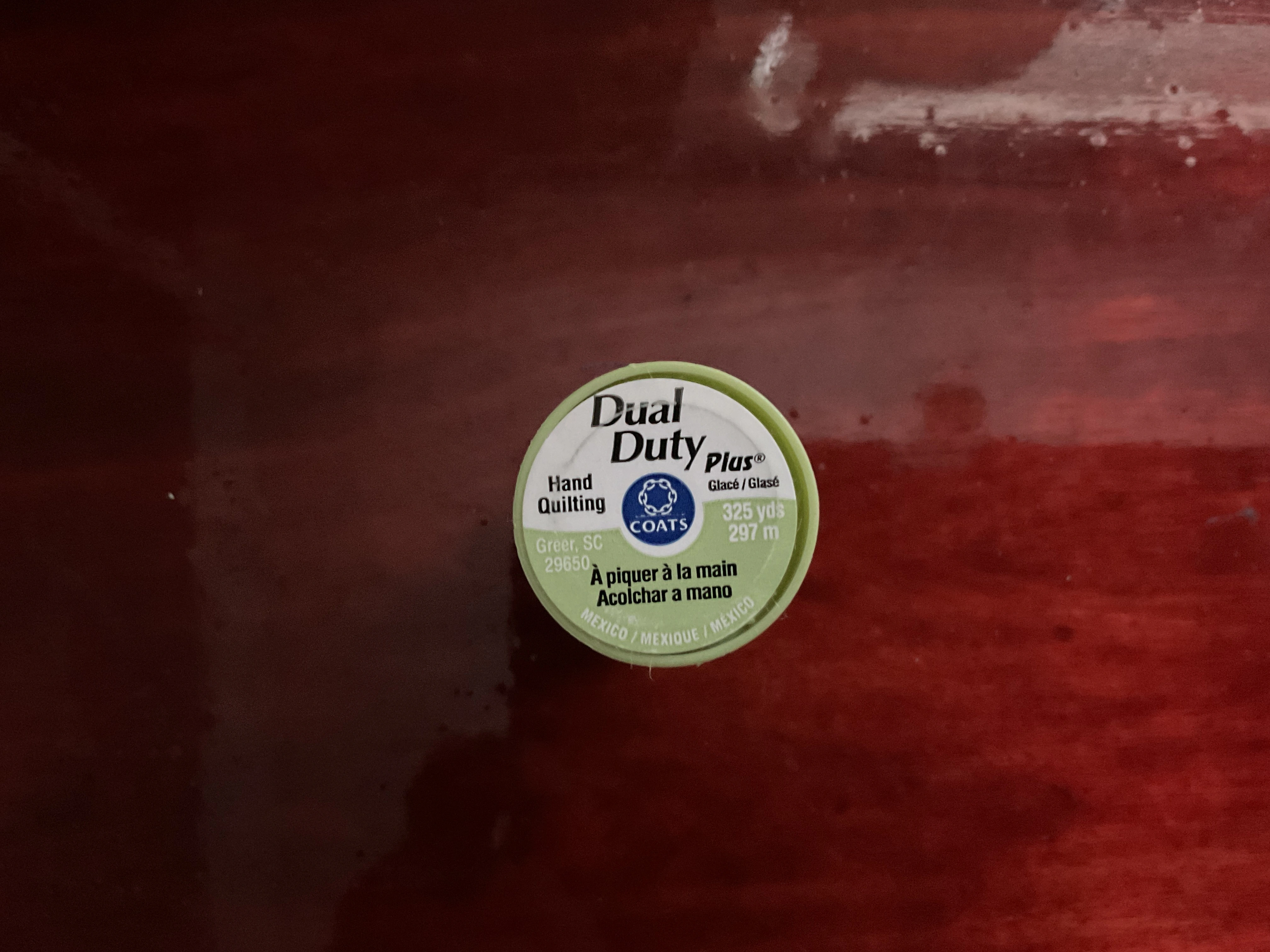 Selling a spool of Coats Dual Duty Plus hand quilting thread. It's blue and contains 325 yards or 297 meters of thread. The thread is made of 68% polyester and 32% cotton.