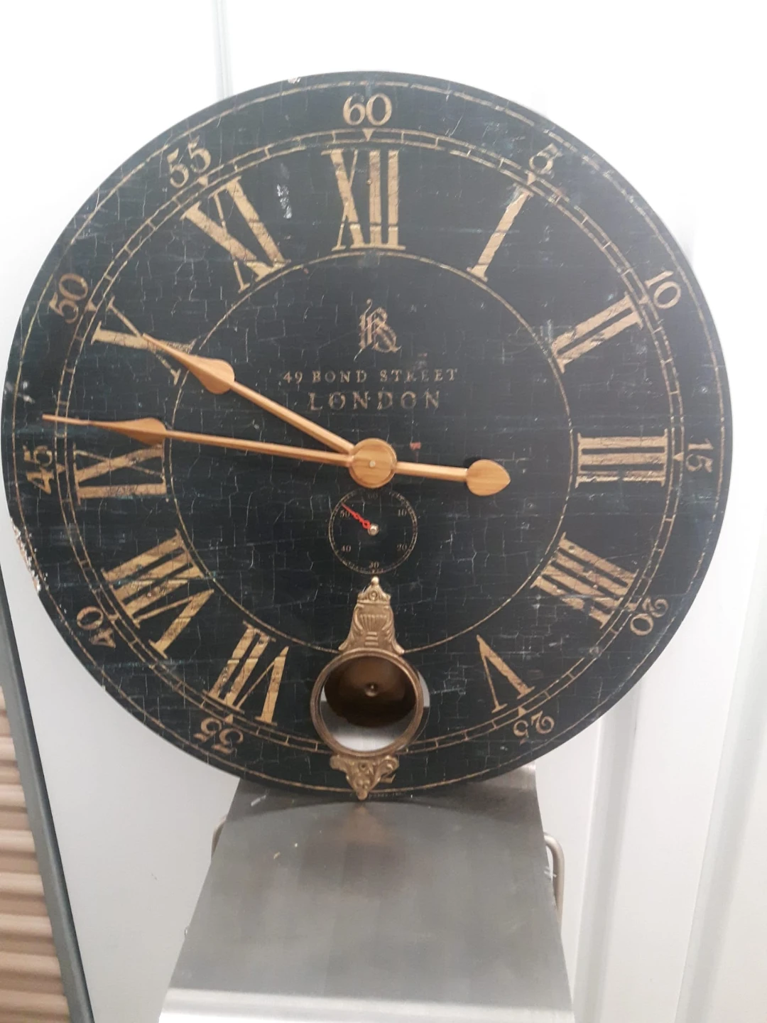 Selling a decorative wall clock from 49 Bond Street London. It features Roman numerals and a pendulum. Has a little wear and tear please see pictures. Diameter 29 inches. Pick up in Scarborough at Morningside and Sheppard Ave E
