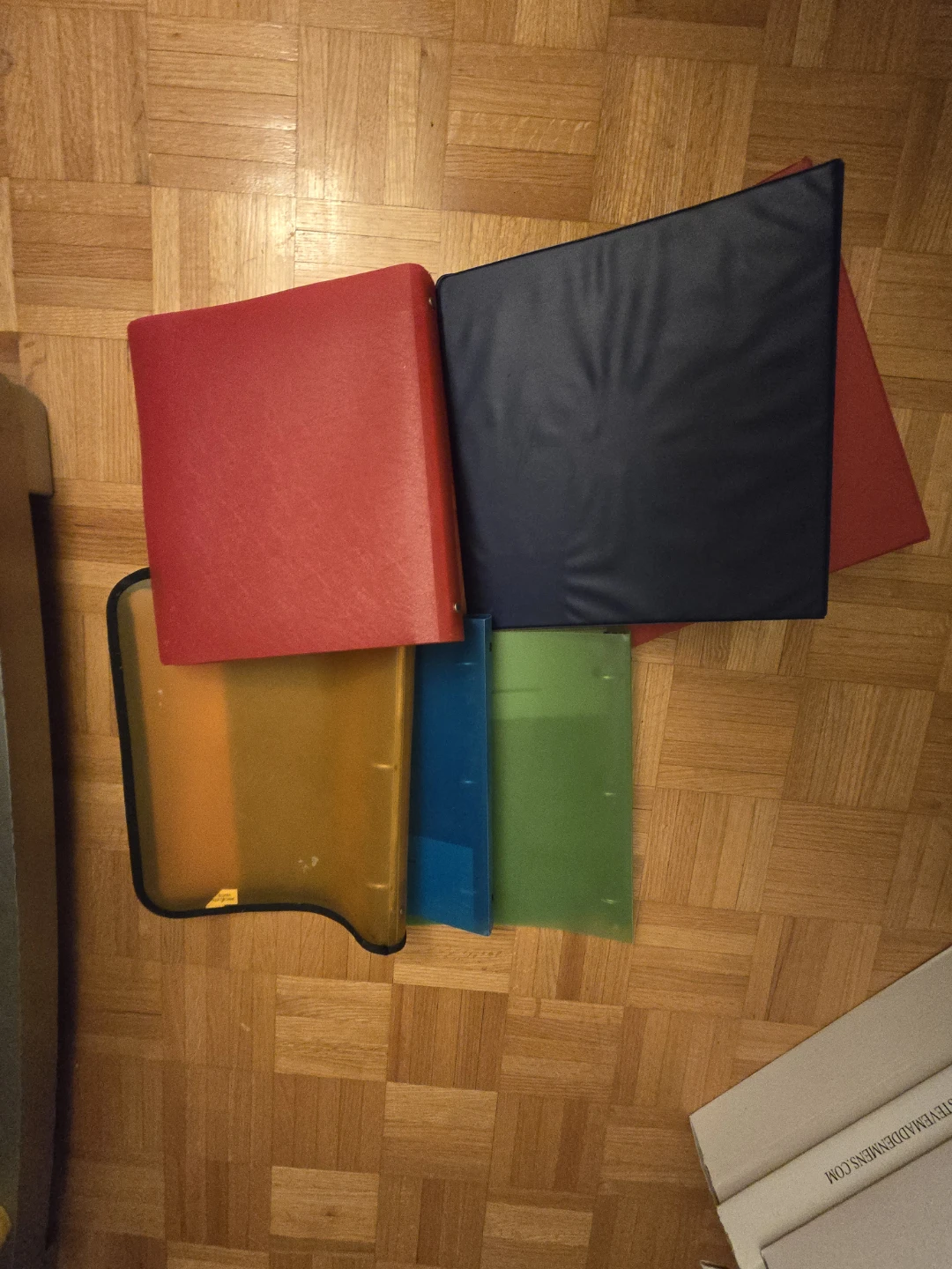 Selling a lot of 5 binders in various colours! You'll get one each in red, blue, yellow, and green. Perfect for organizing your documents or schoolwork