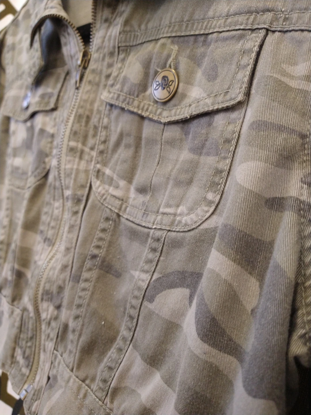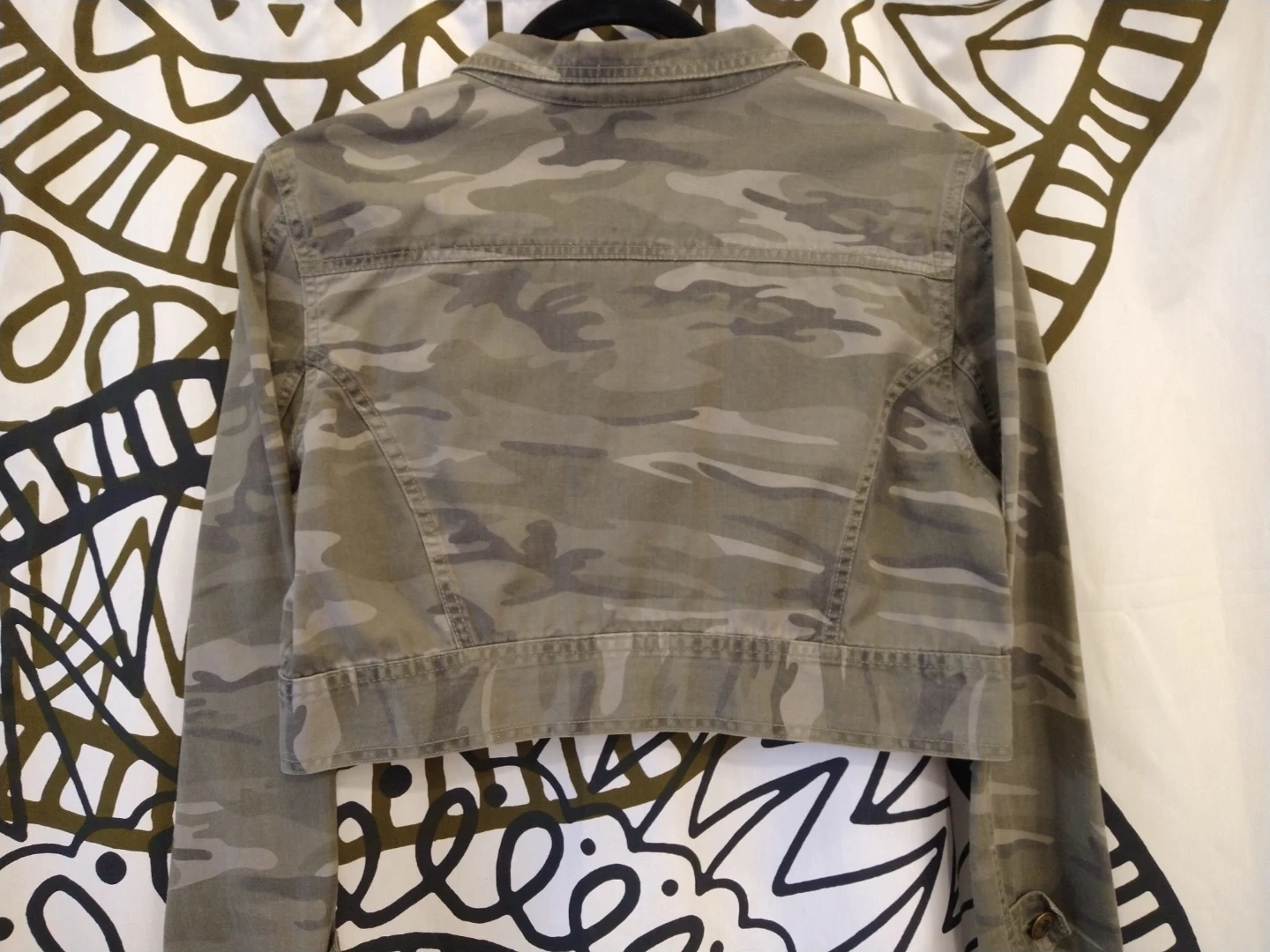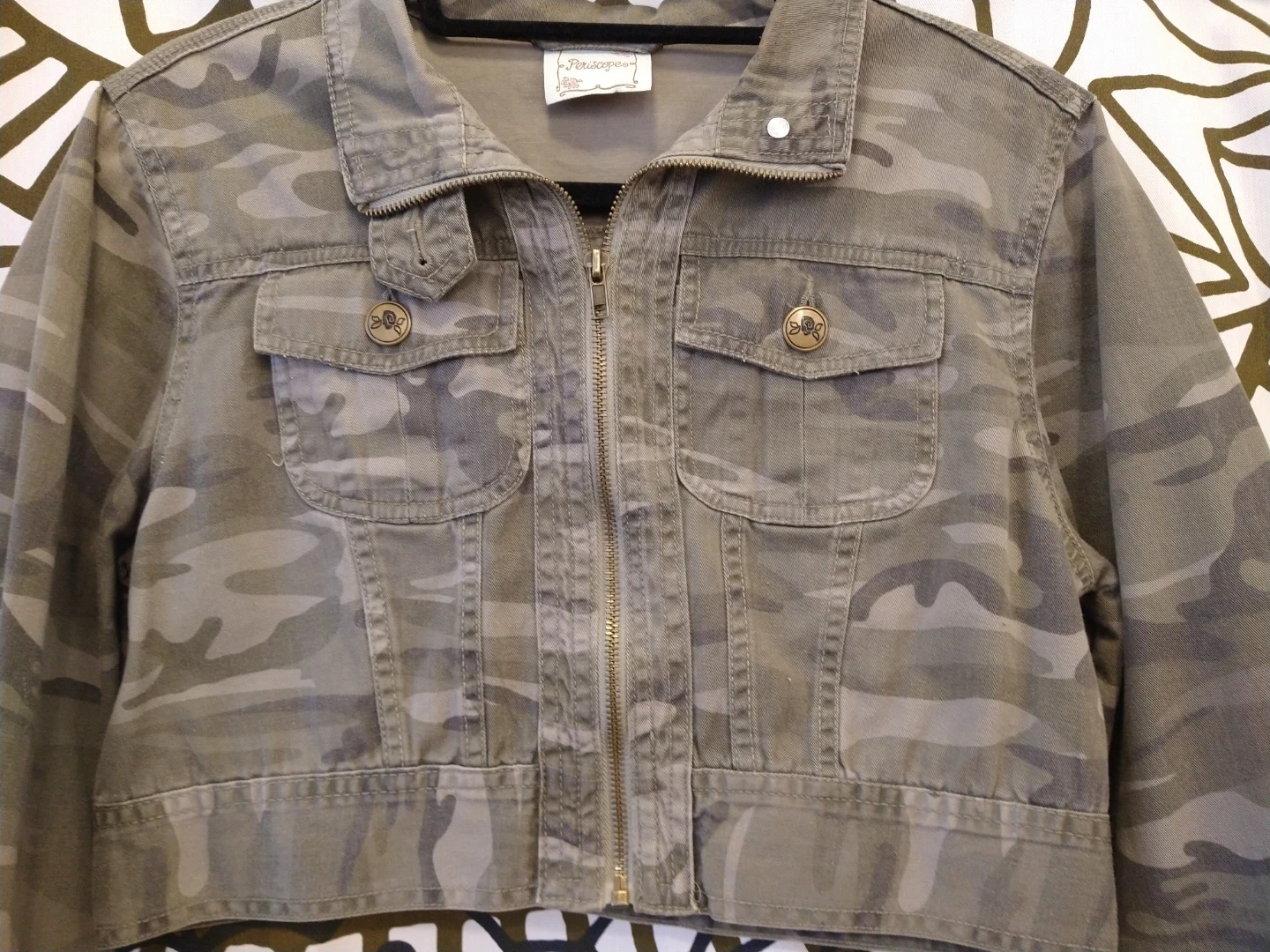 Here's a cute Periscope cropped jacket with a cool camo pattern! It's perfect for adding a bit of edge to any outfit. The jacket features a zip-up front and functional pockets, making it both stylish and practical