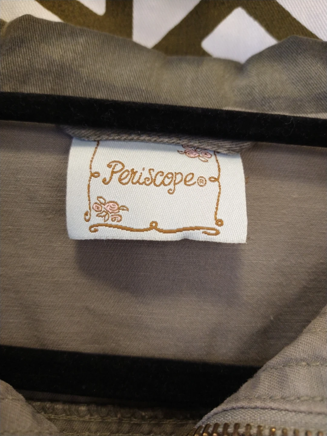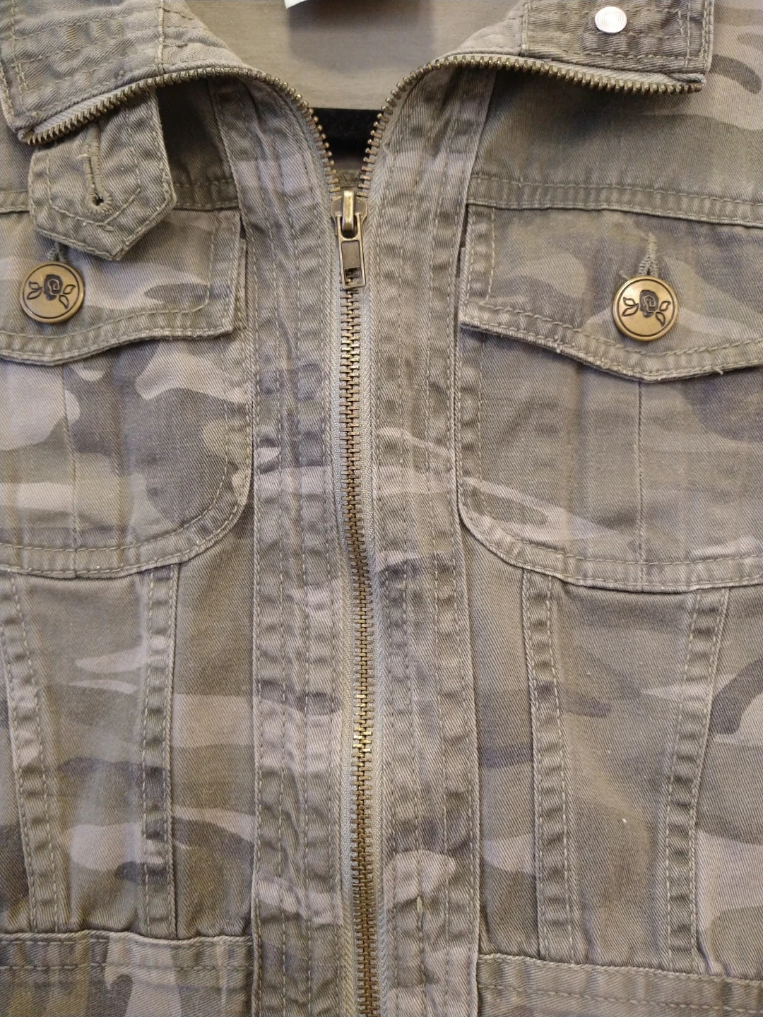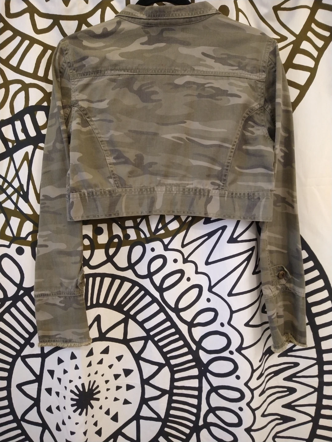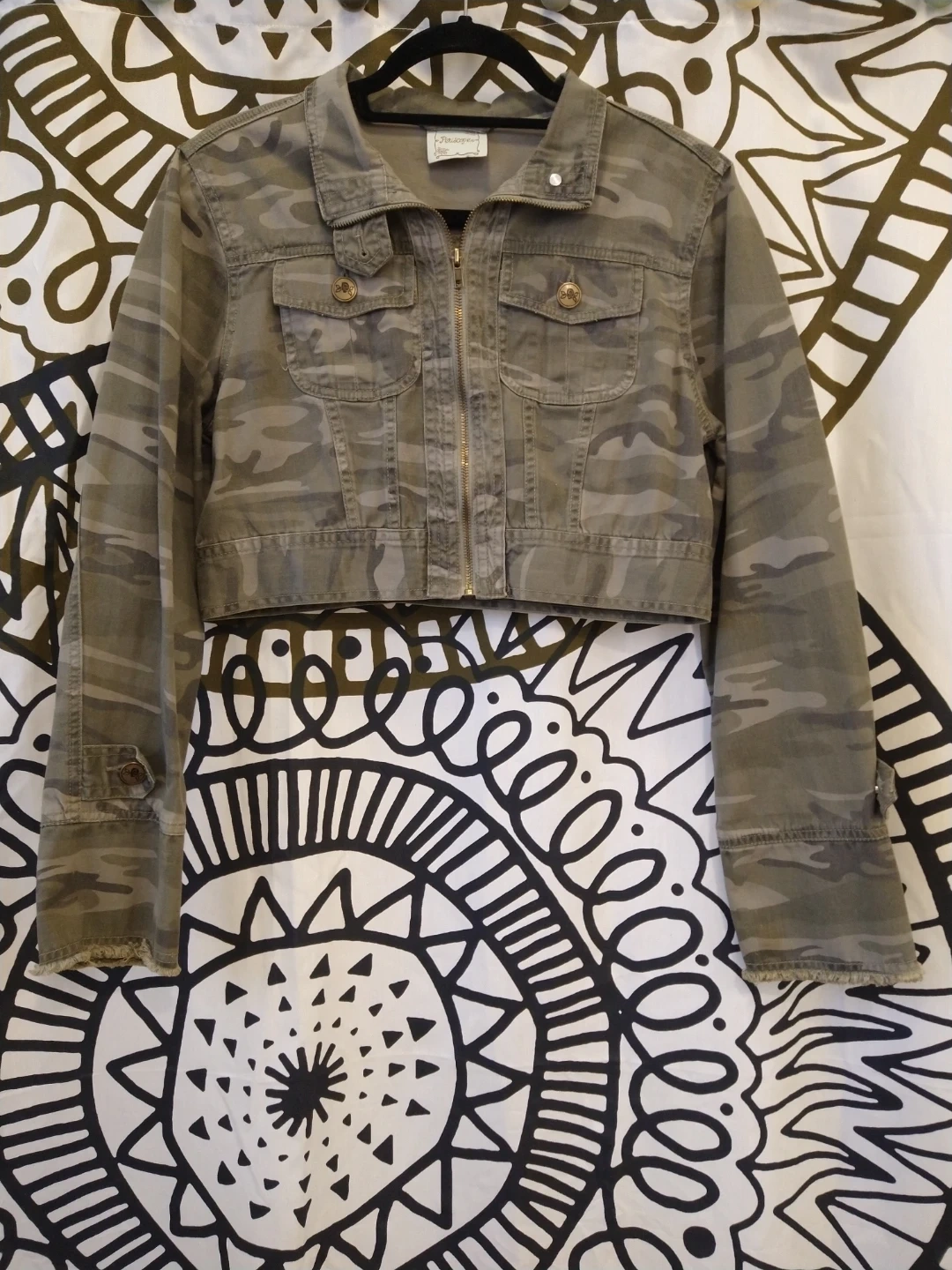 Here's a cute Periscope cropped jacket with a cool camo pattern! It's perfect for adding a bit of edge to any outfit. The jacket features a zip-up front and functional pockets, making it both stylish and practical