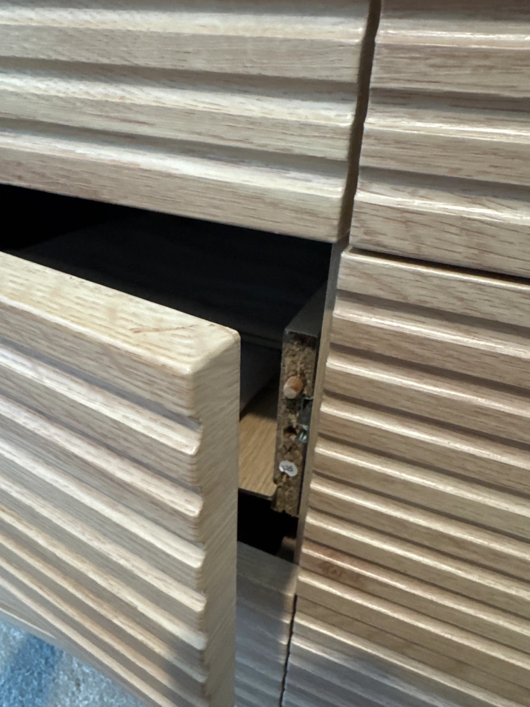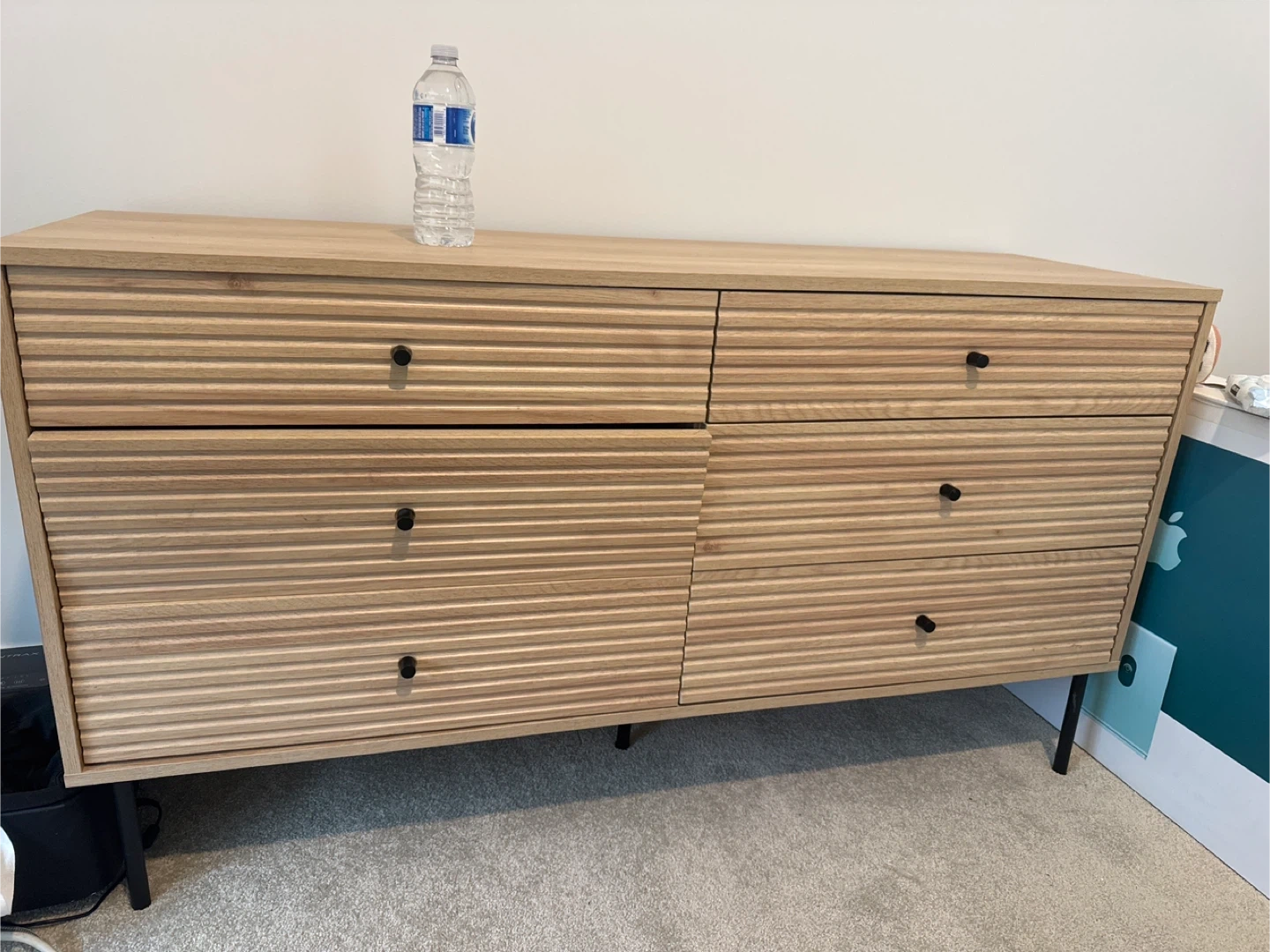 There is some damage under the dresser as the movers broke it but its been fixed witj super glue and its steady. Some drawers are a bit lose and need to be fixed with super glue as well. Otherwise it looks as good as new