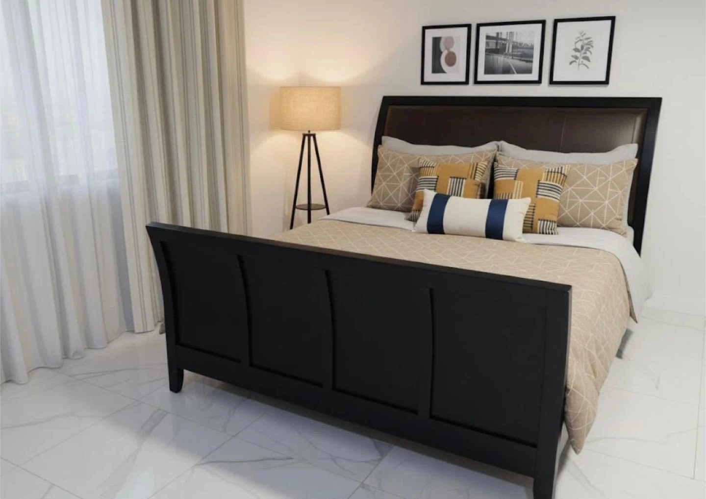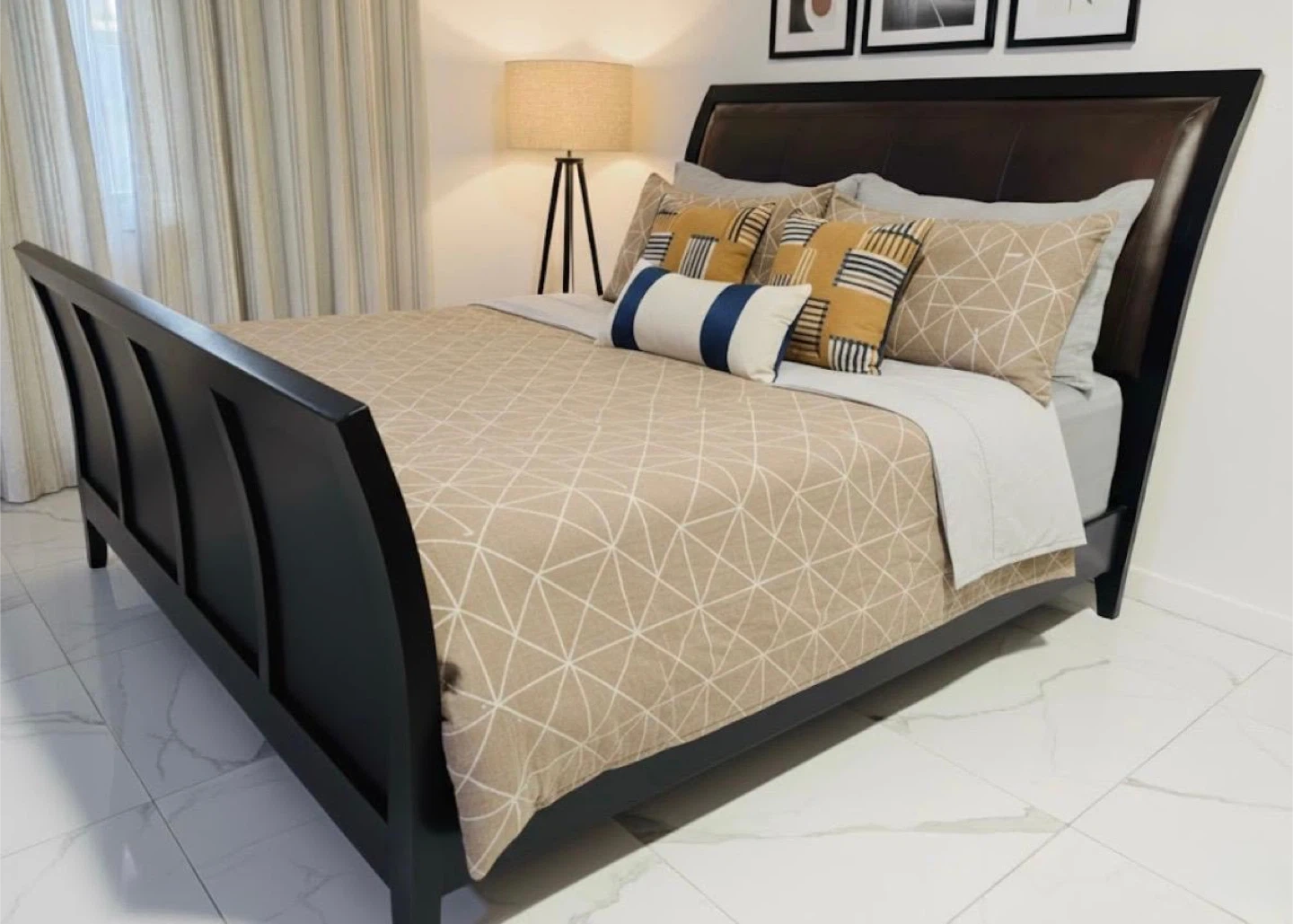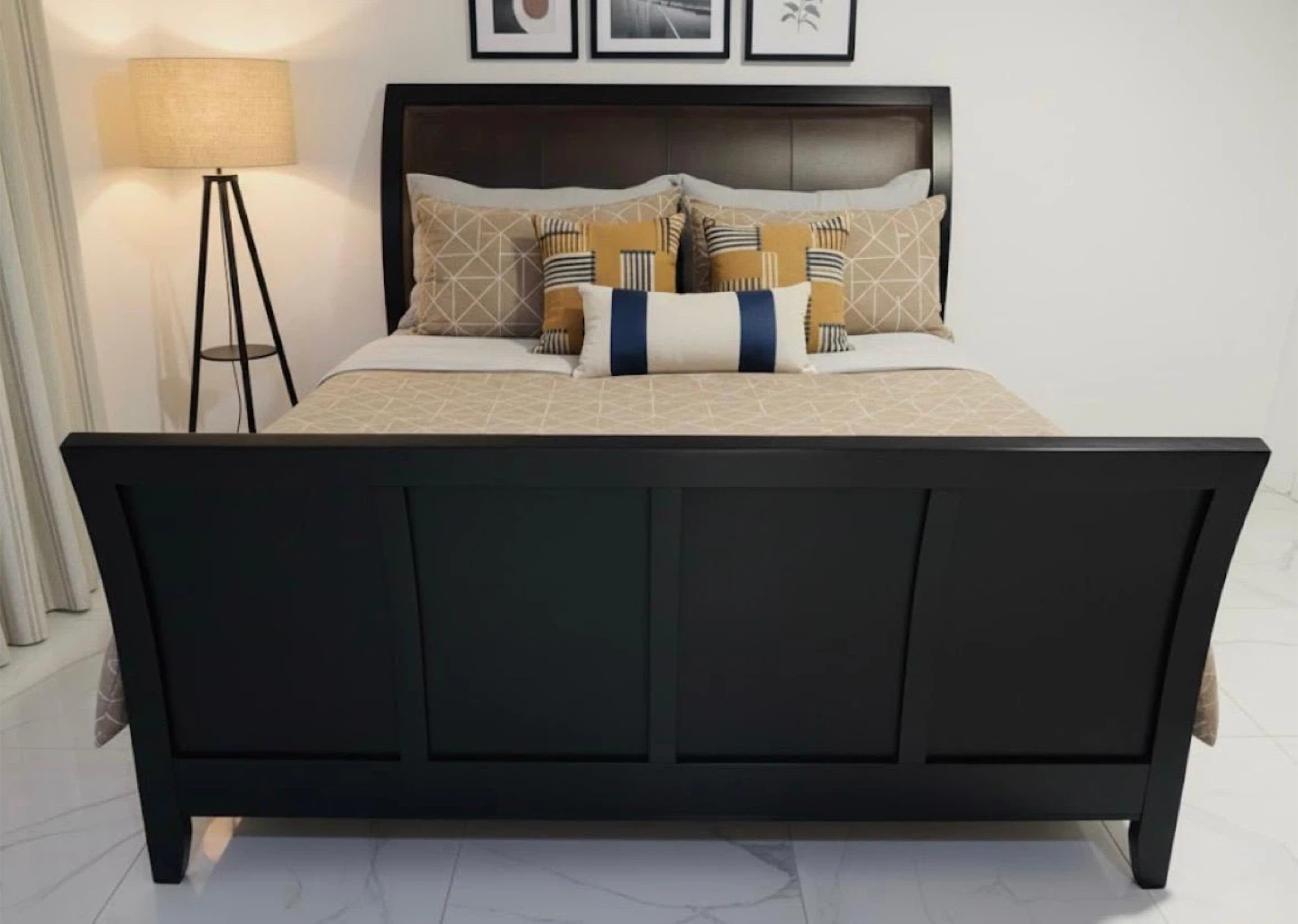 Selling a beautiful sleigh bed frame! It's in great condition and would be a lovely addition to any bedroom. The dark finish gives it a modern and sophisticated look. No include mattress