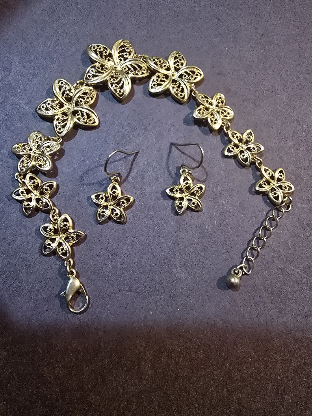 Beautiful gold-tone flower bracelet and earring set! This set is in great condition and features a delicate floral design. Perfect for adding a touch of elegance to any outfit