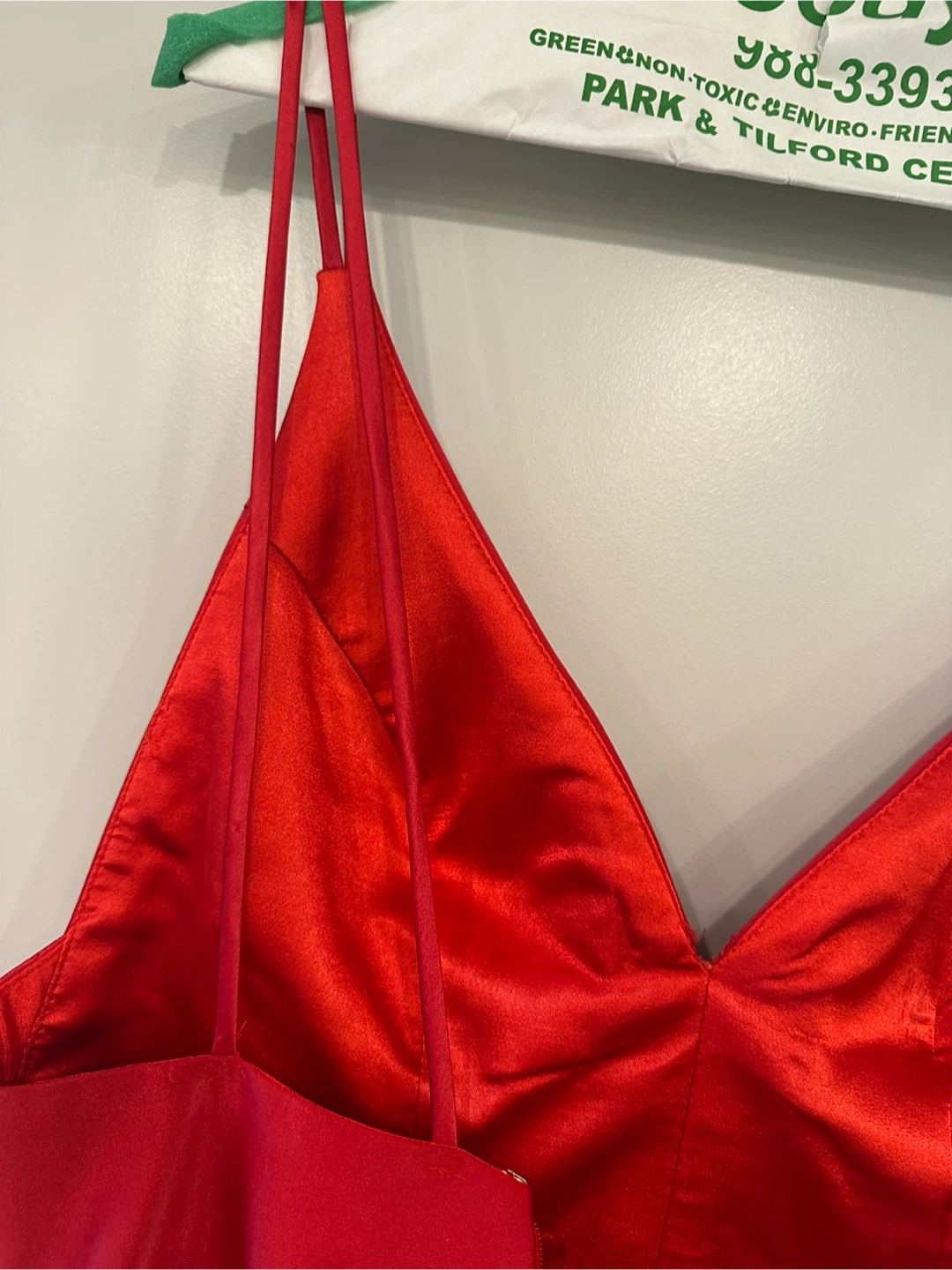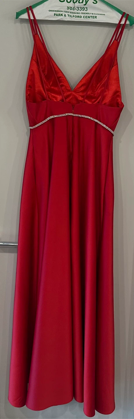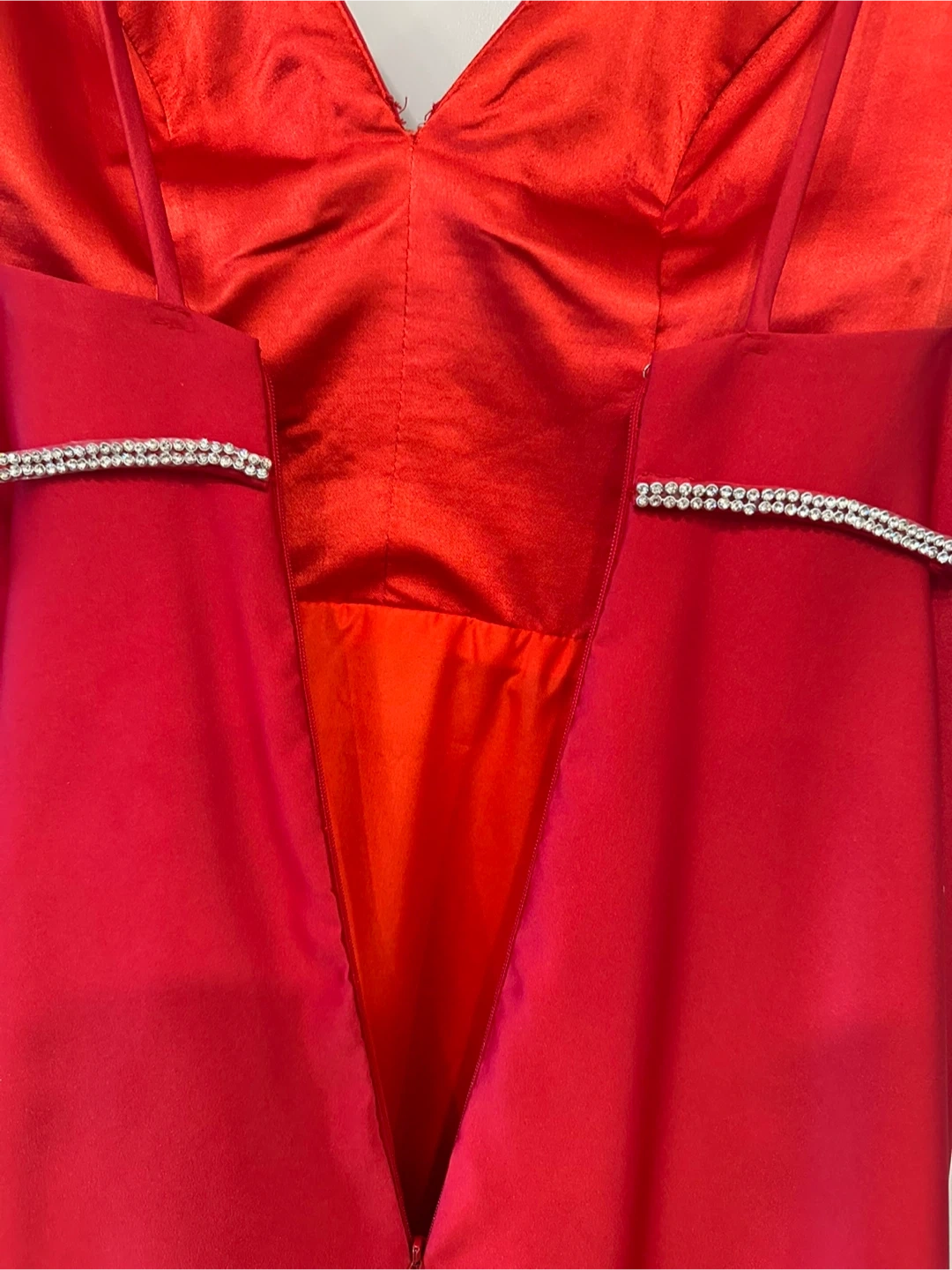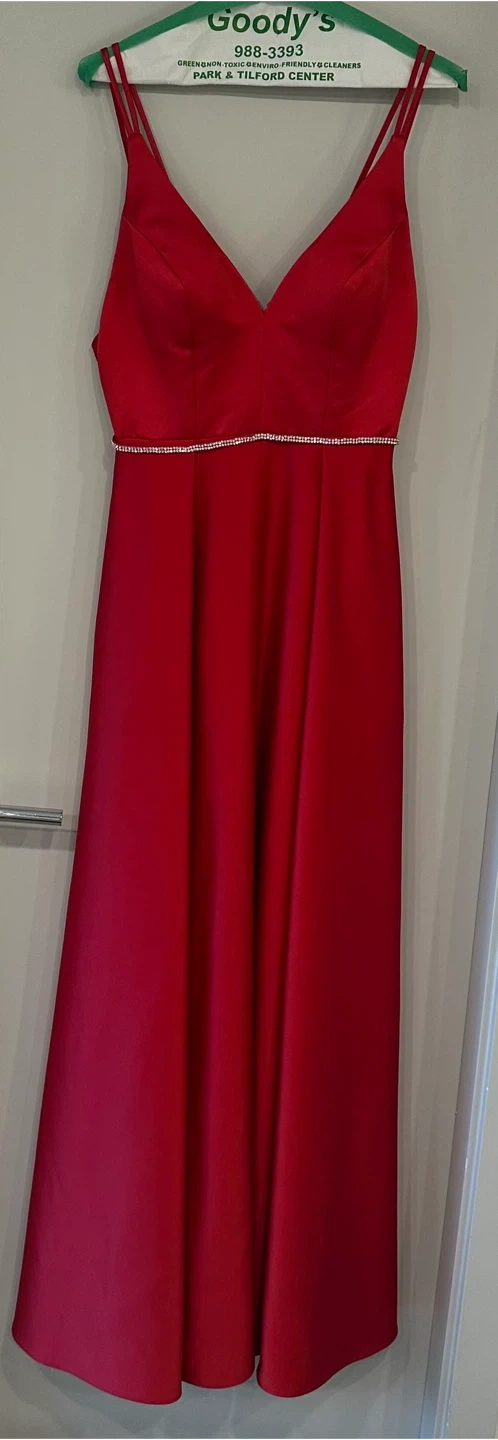 Selling a stunning red satin formal gala grad dress! It's in great condition and freshly dry cleaned. The dress has a touch of sparkle with a rhinestone accent belt at the waist. It has a V-neck and spaghetti straps.