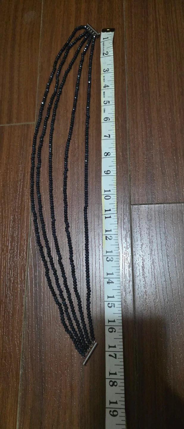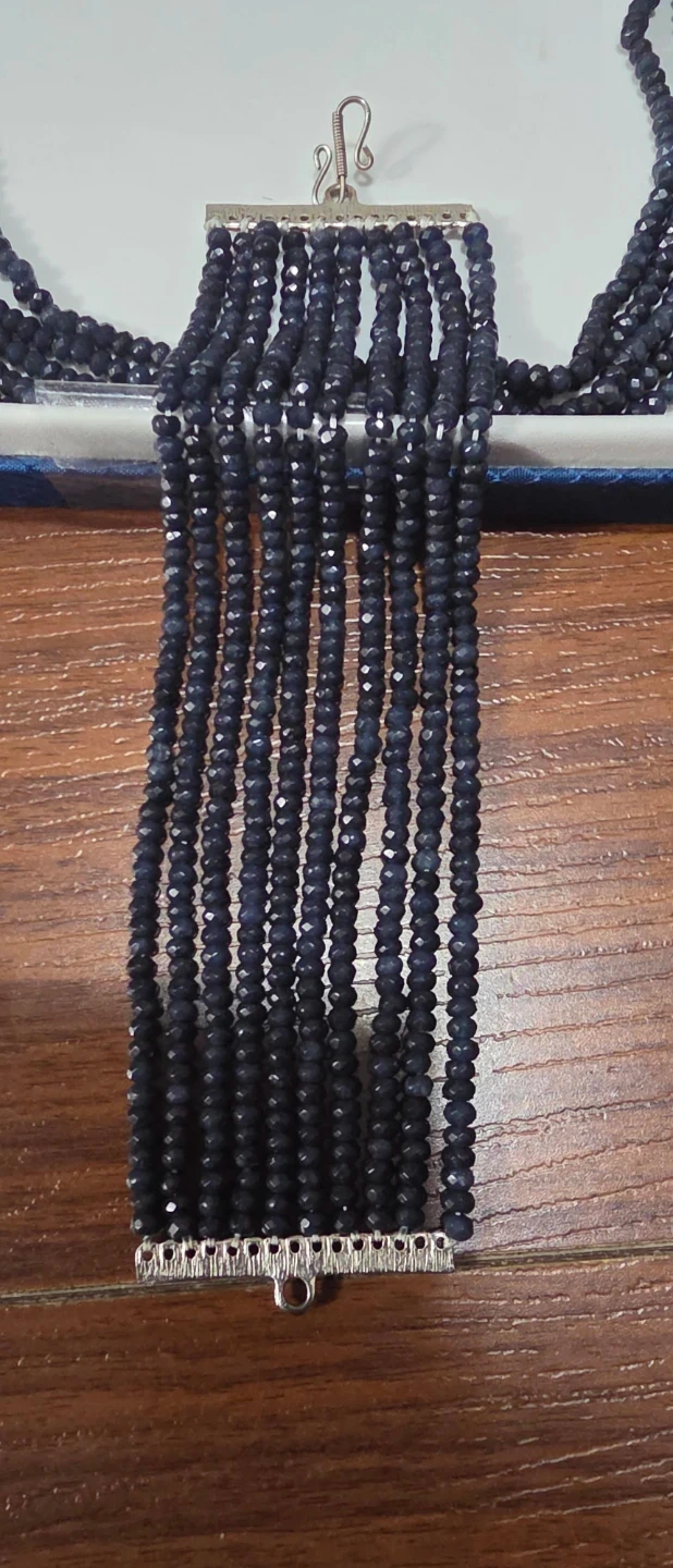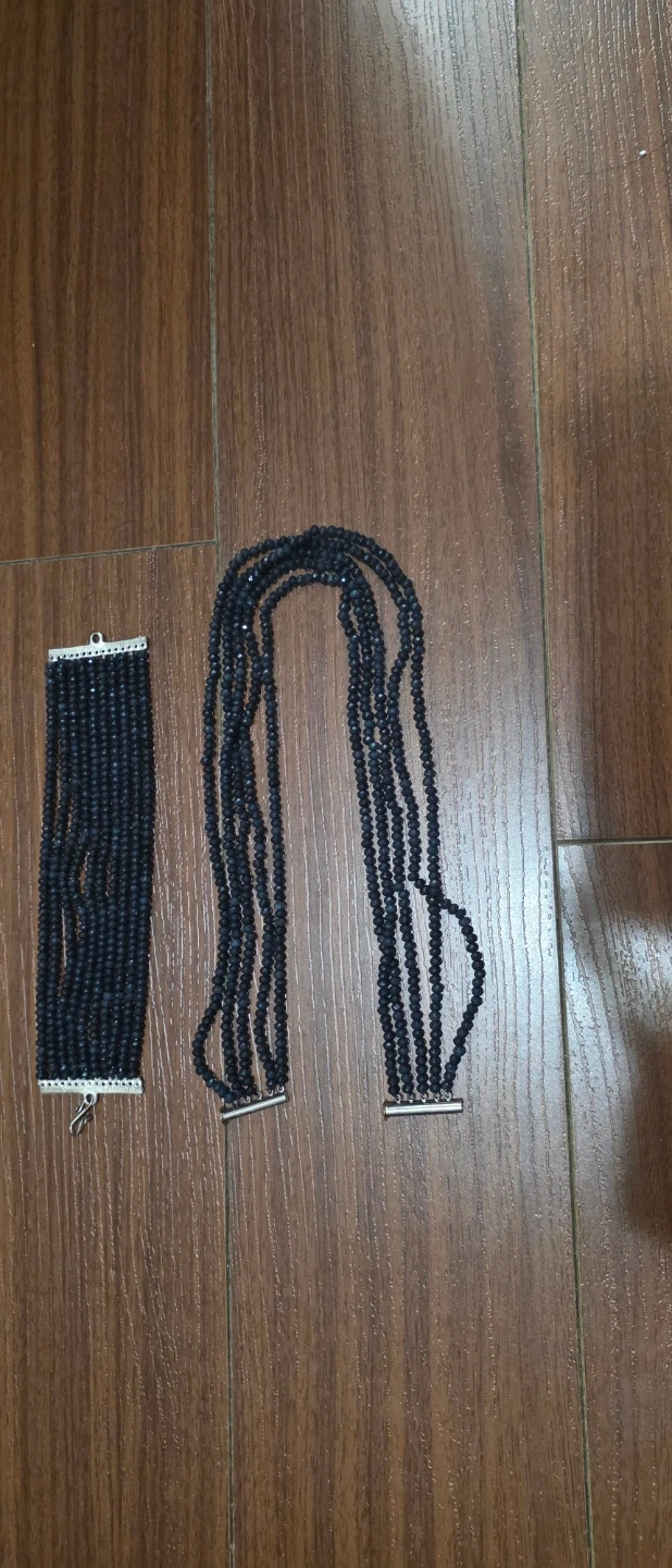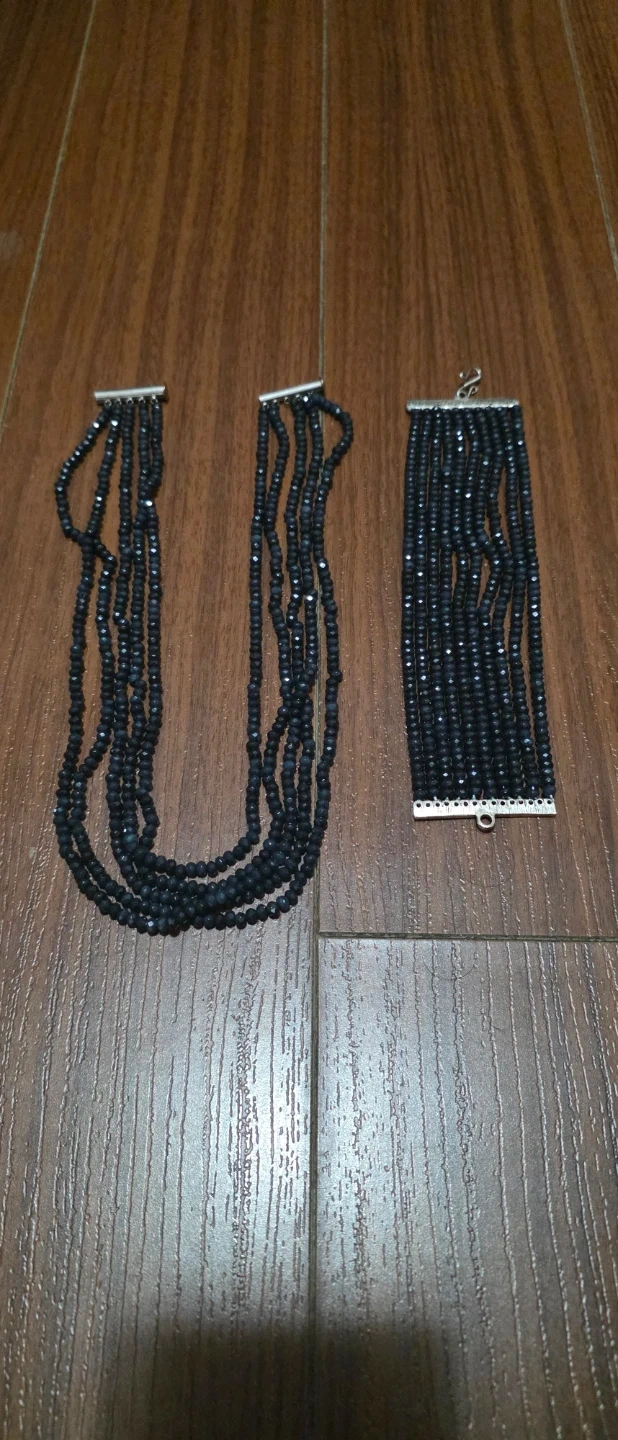 Selling a lovely beaded necklace and bracelet set! The necklace features multiple strands of charcoal beads, and the matching bracelet complements it perfectly. Comes in a box for safekeeping.
