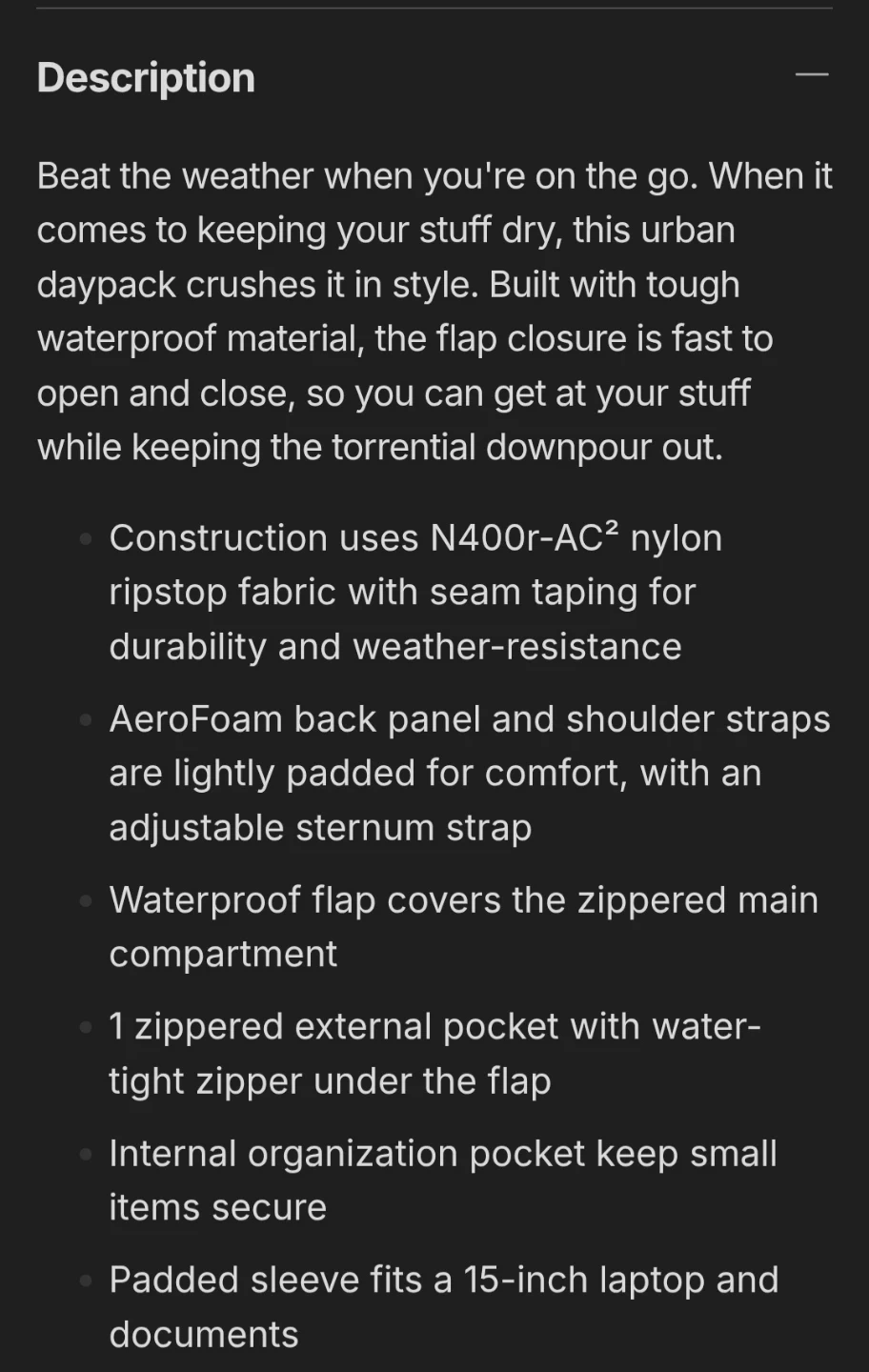 Selling a used Arc'teryx Granville 25 backpack in black. It's in great shape and ready for your next adventure! This urban daypack is built with tough waterproof material, perfect for keeping your stuff dry on the go. The AeroForm back panel and shoulder straps are lightly padded for comfort, and it has a padded sleeve that fits a 15-inch laptop and documents. Shown tiny white spots in the picture above. But over all ĺts in good shape.