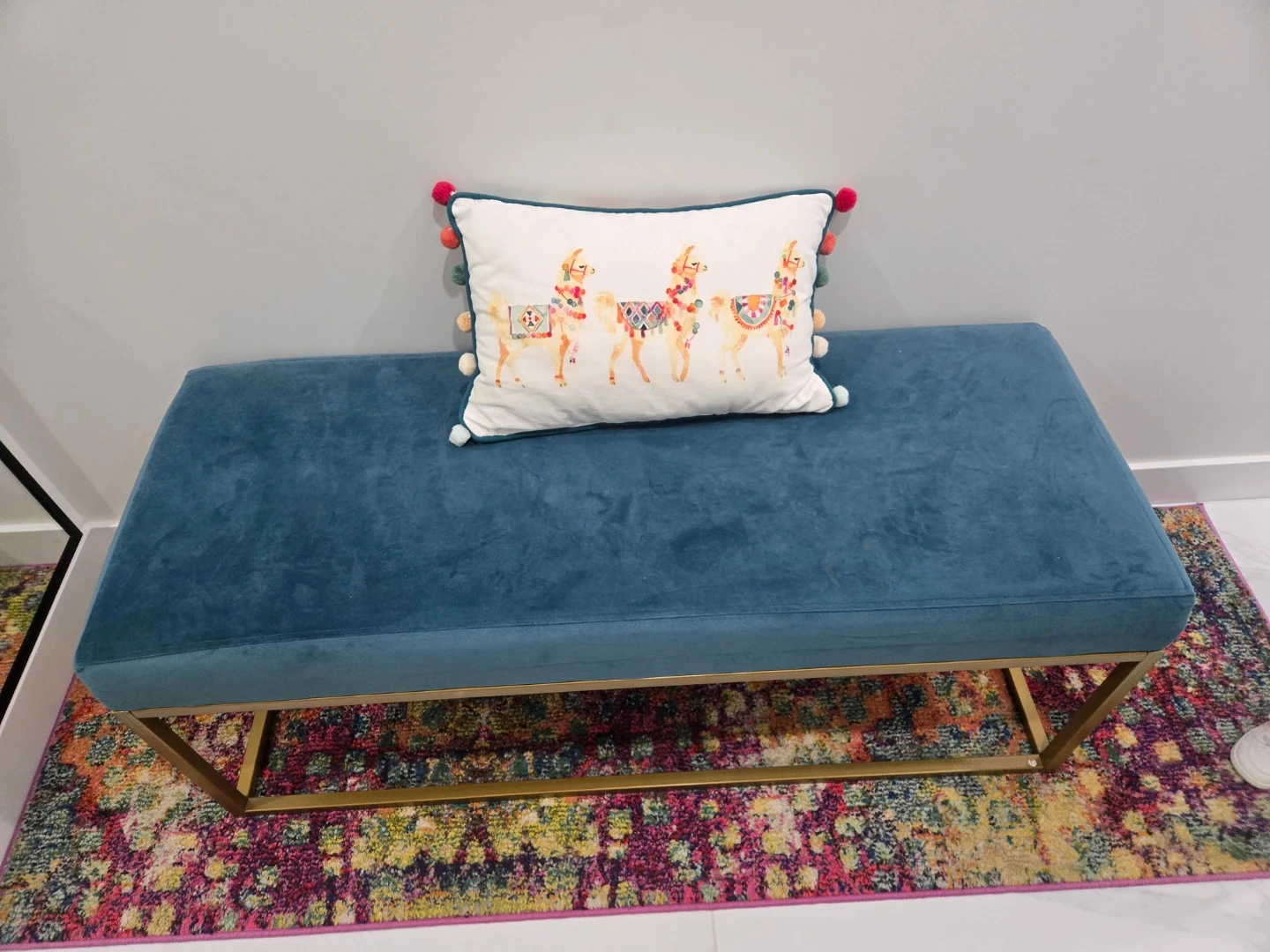 Selling a beautiful blue velvet ottoman bench! It's in great condition and would look lovely in any home. The bench features a gold-colored metal frame and a soft velvet cushion. It also comes with a cute llama pillow!