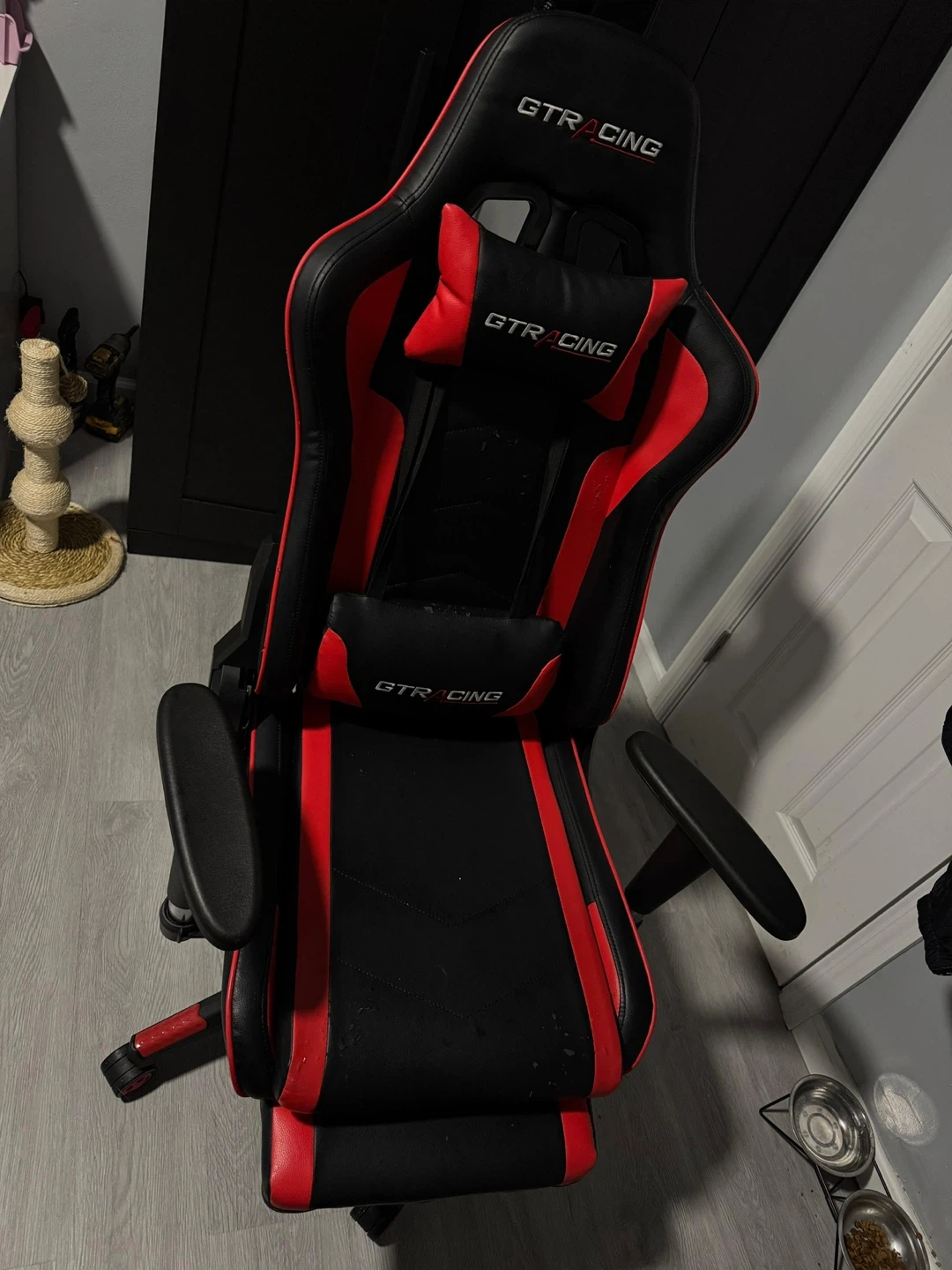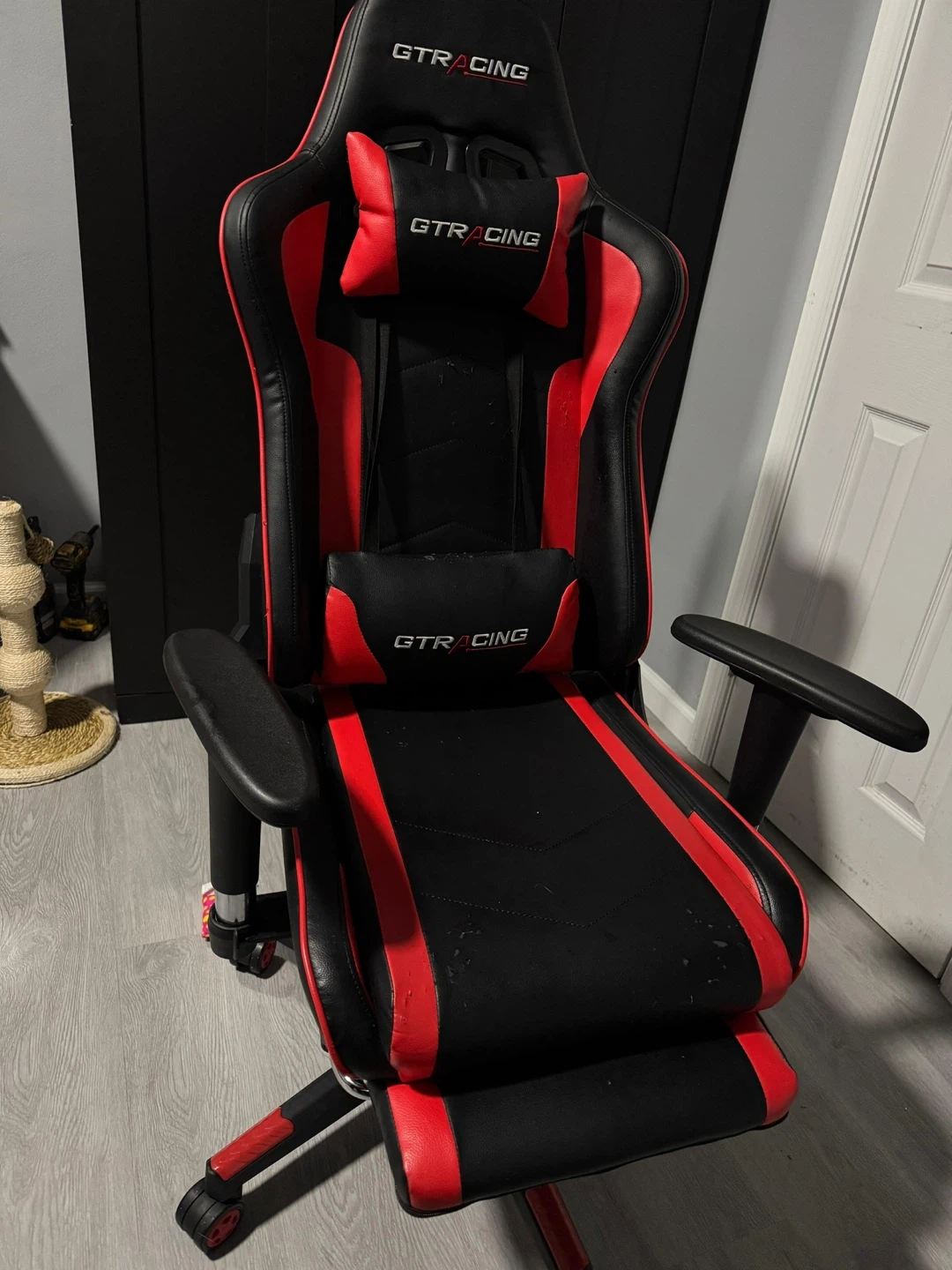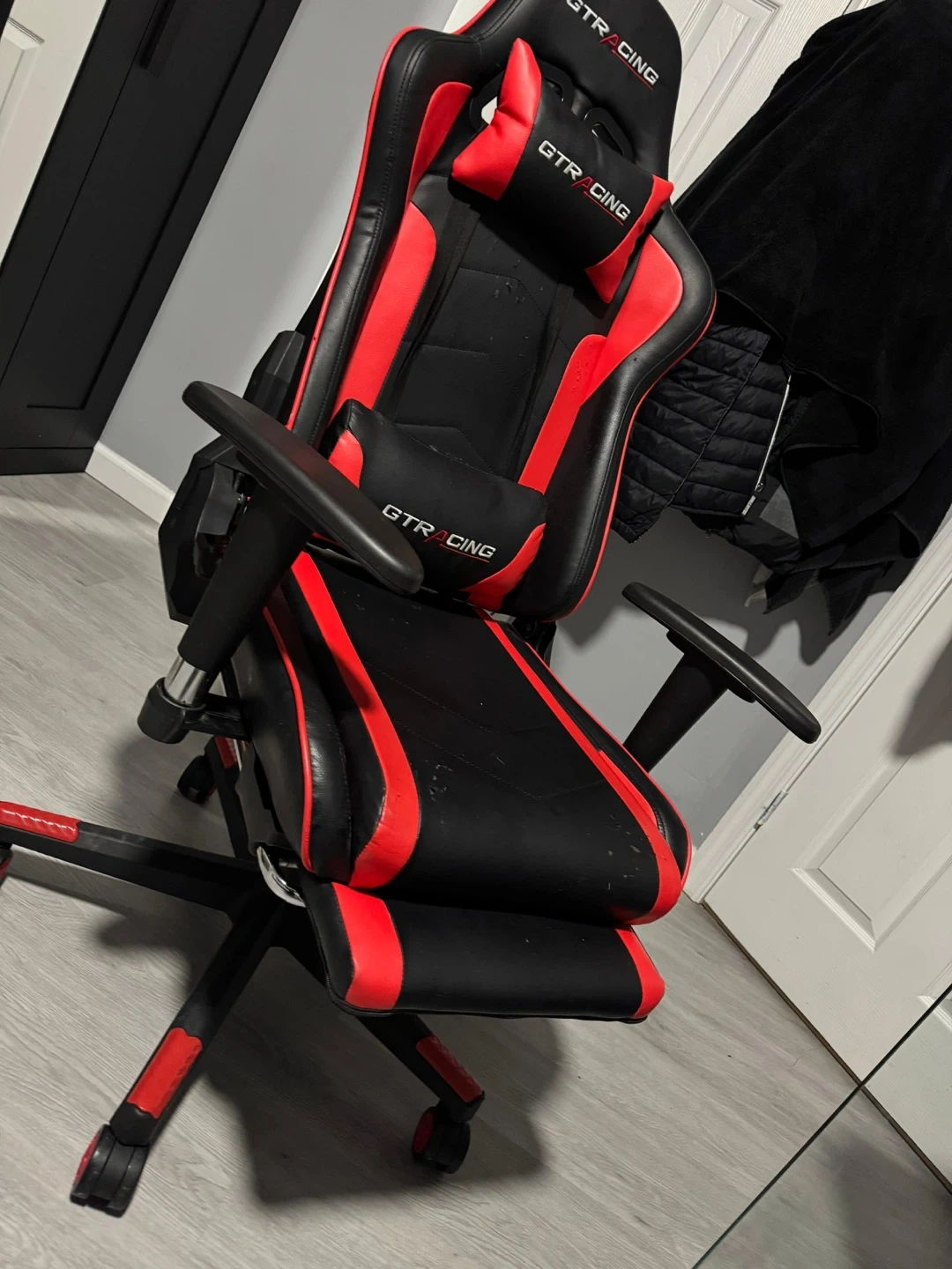 Selling a GTRACING gaming chair in red and black. It's in good condition and ready for a new gamer! This chair features a headrest and lumbar support for those long gaming sessions. It's a great addition to any setup