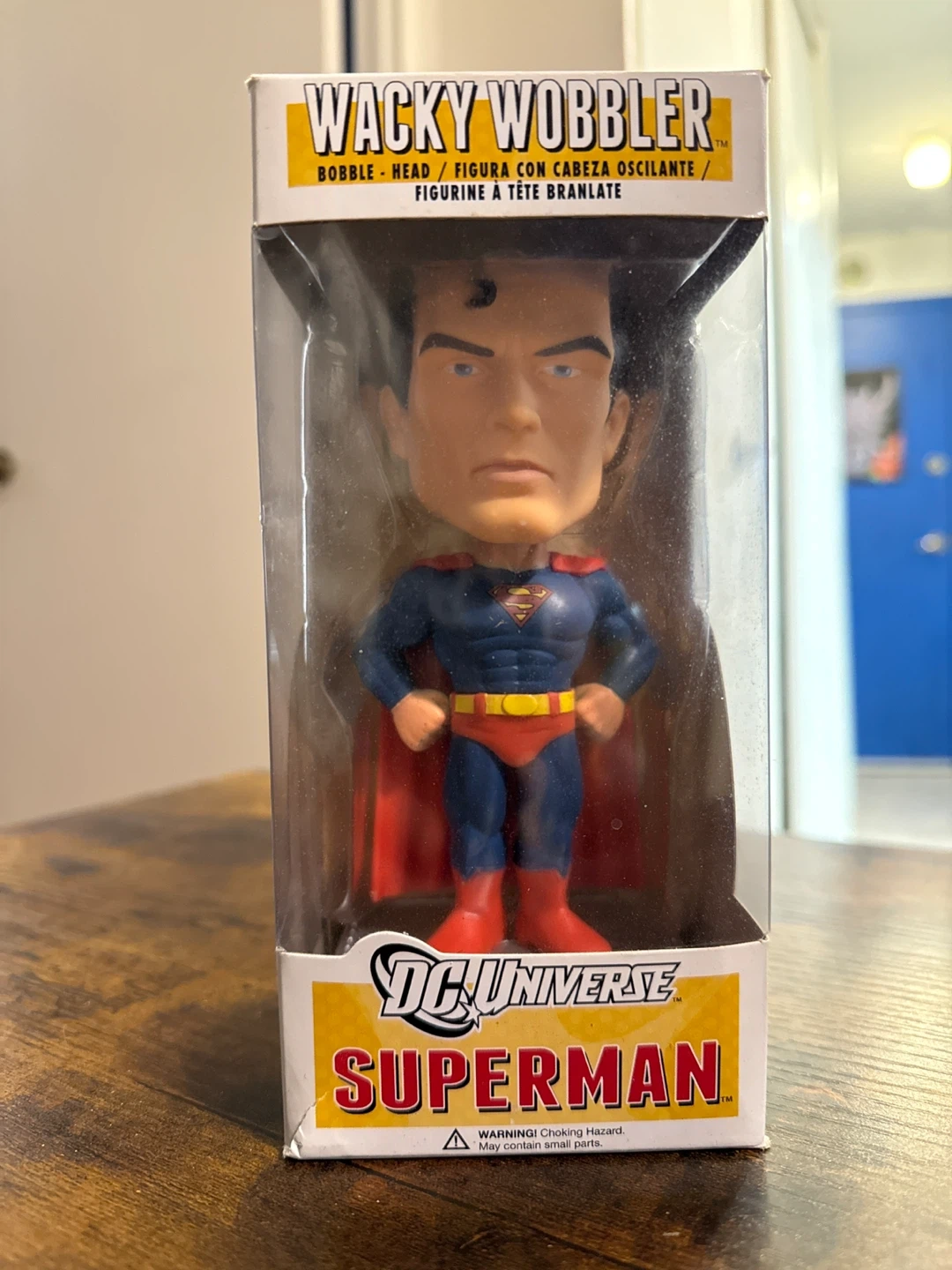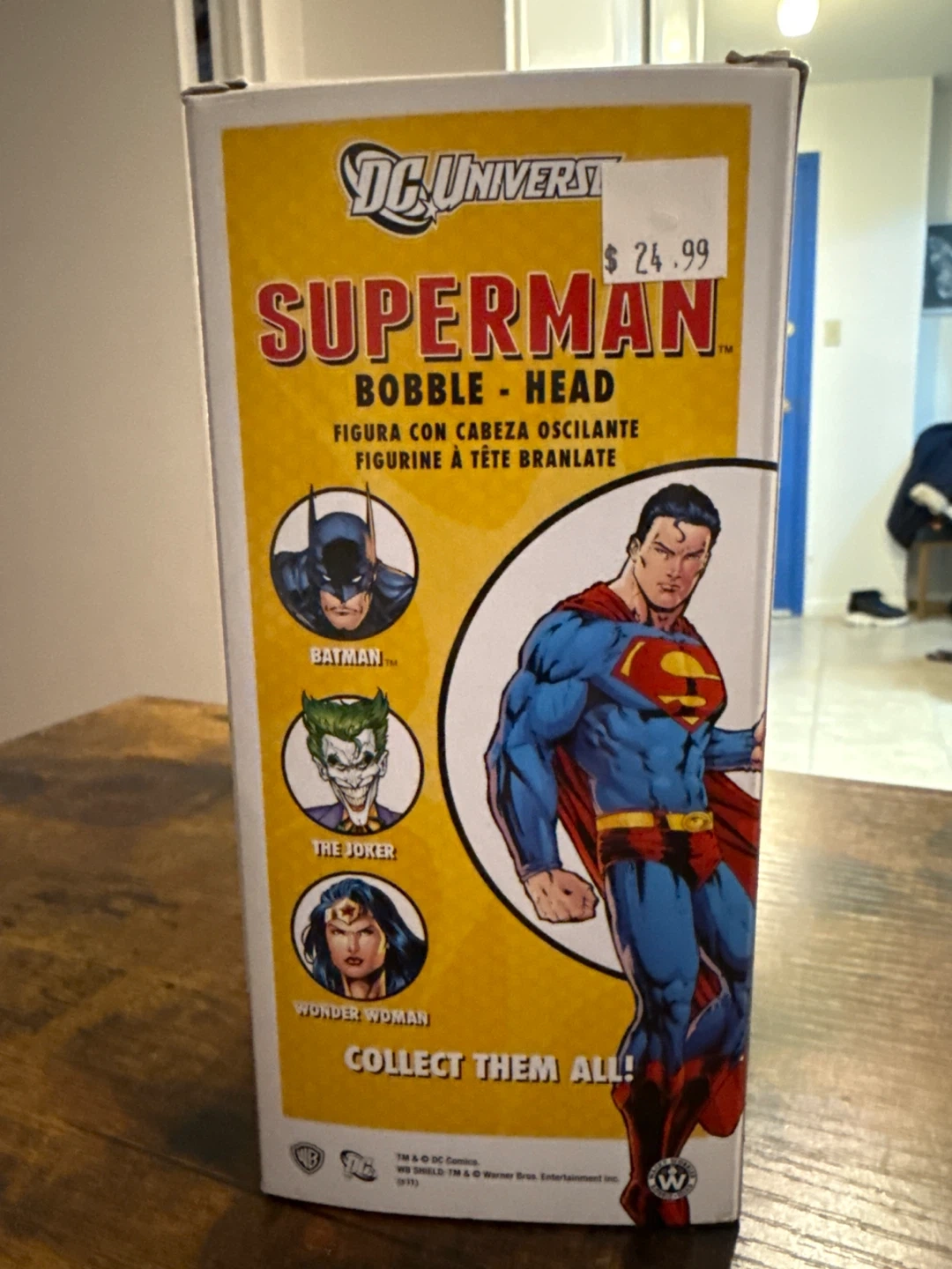 Selling a brand new DC Universe Superman bobblehead, still in its original box! This Wacky Wobbler is a fun collectible featuring Superman, and the box also shows Batman, The Joker, and Wonder Woman. Originally priced at $24.99, it's a great addition to any DC collection
