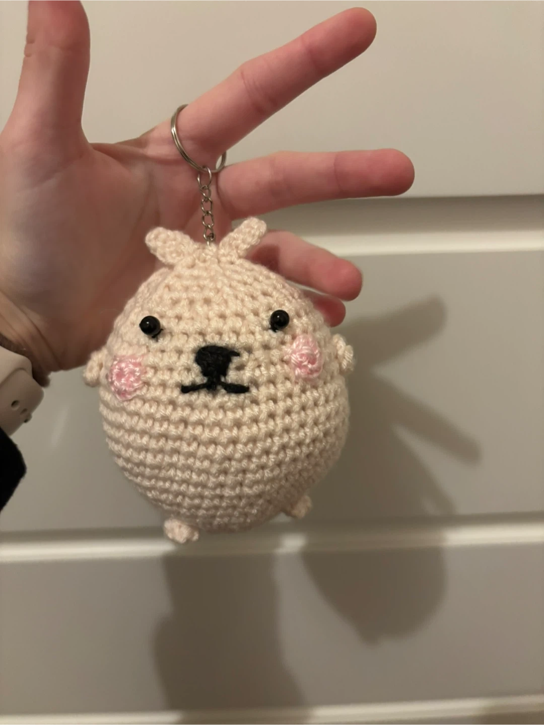 This is a handmade crochet keychain! It's in great condition and ready to add a bit of cuteness to your keys or bag. The keychain is light beige with pink accents on the cheeks.