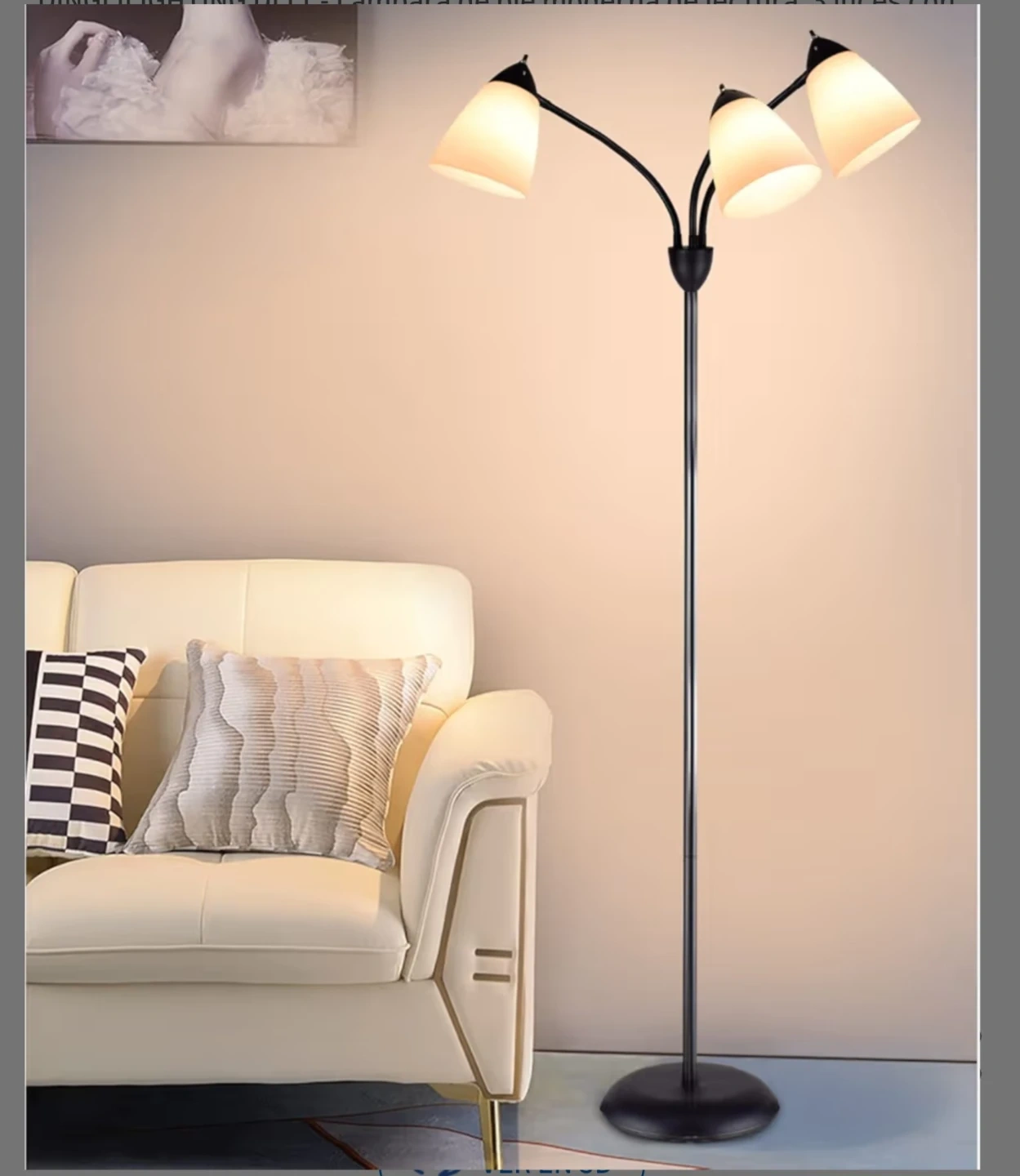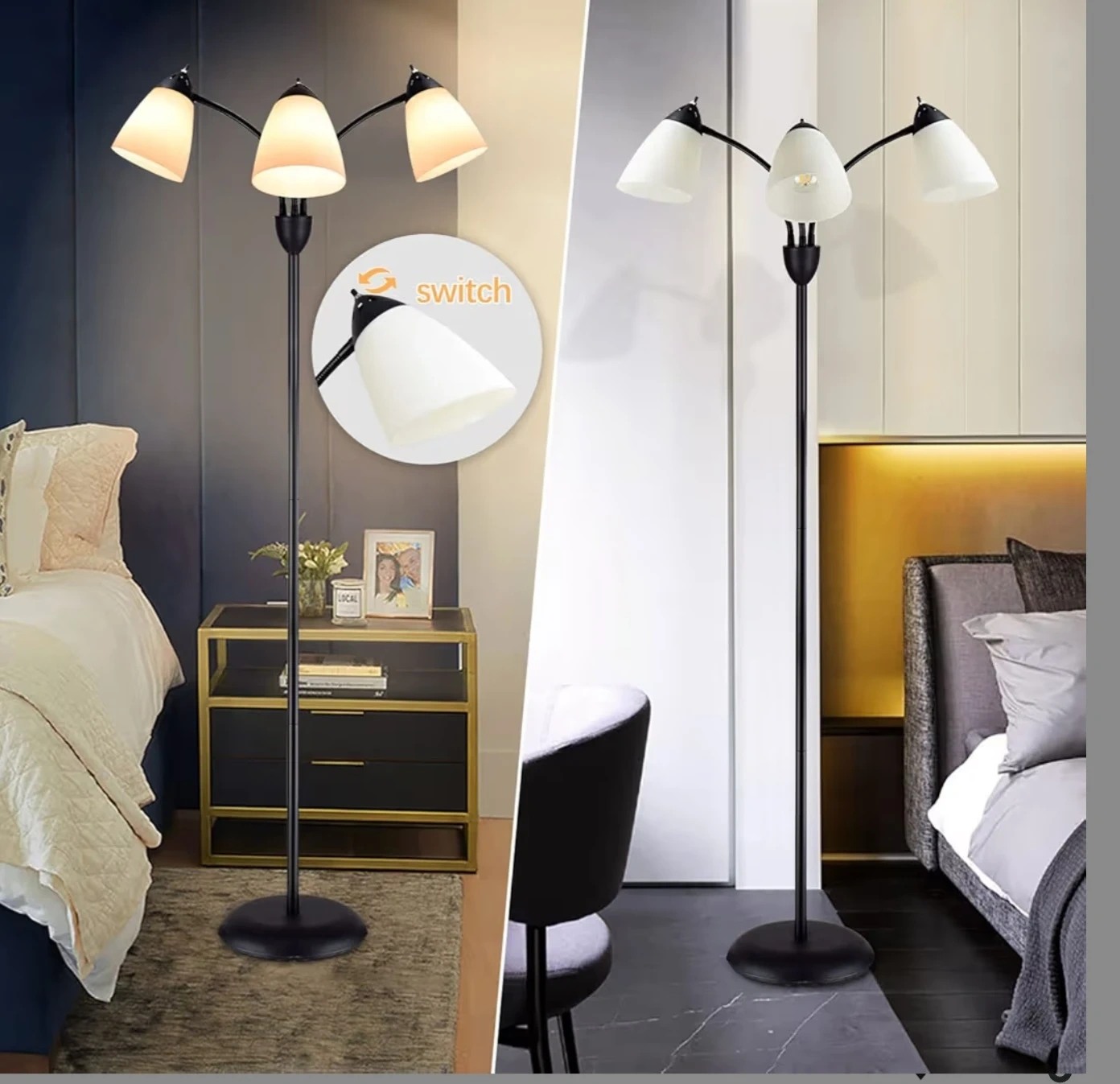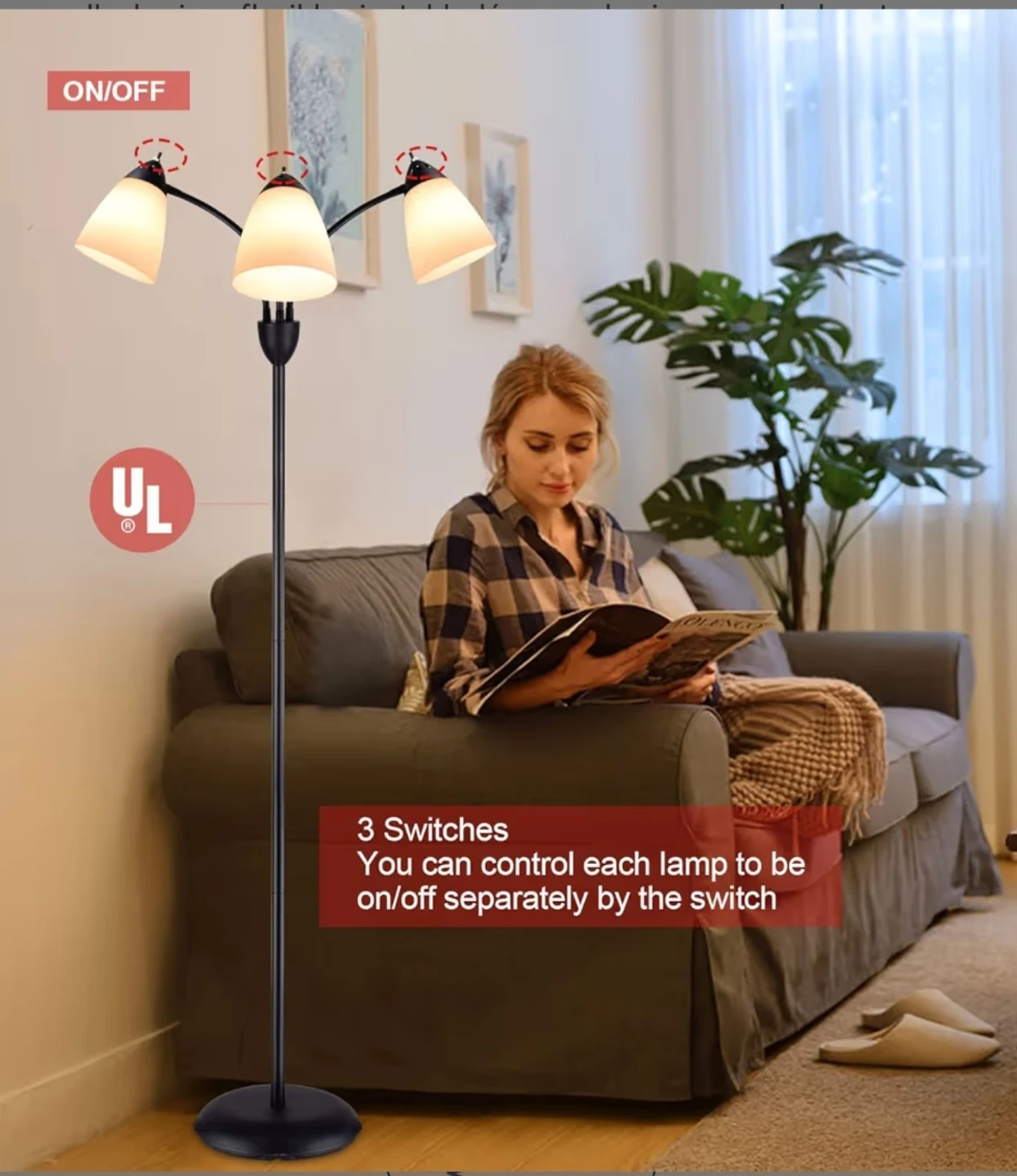 This is a stylish 3-light tree floor lamp with a black finish. It stands at approximately 61.8 inches tall. The lampshades have a unique design, and the lamp provides ample lighting for any room