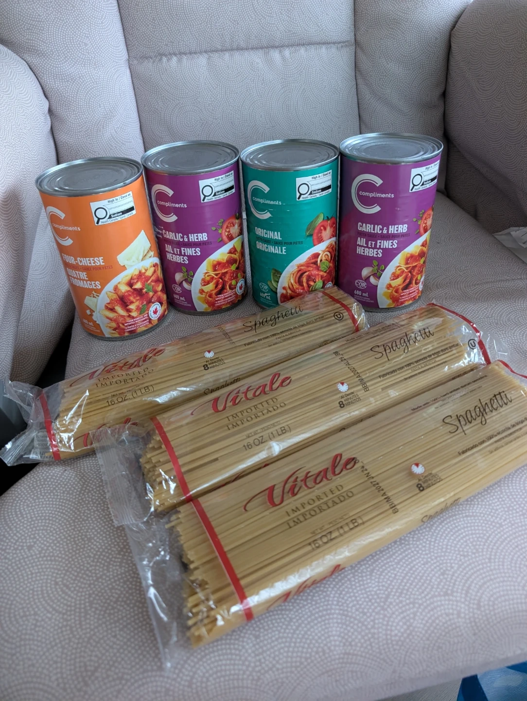 Selling a collection of Compliments pasta sauces and Vitale spaghetti. There are four cans of pasta sauce, including four-cheese, garlic & herb, and original flavours. Also included are four packages of Vitale spaghetti.