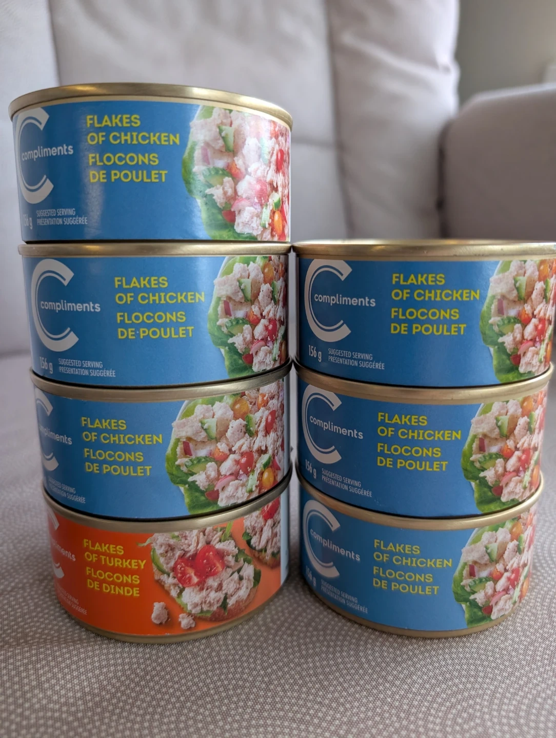 Selling cans of Compliments Flakes of Chicken and Turkey.
