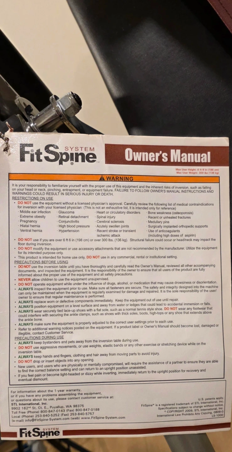 Selling a FitSpine System inversion table. It's in good condition and ready to use. The owner's manual is included to help you familiarize yourself with the proper use of this equipment and the inherent risks of inversion.