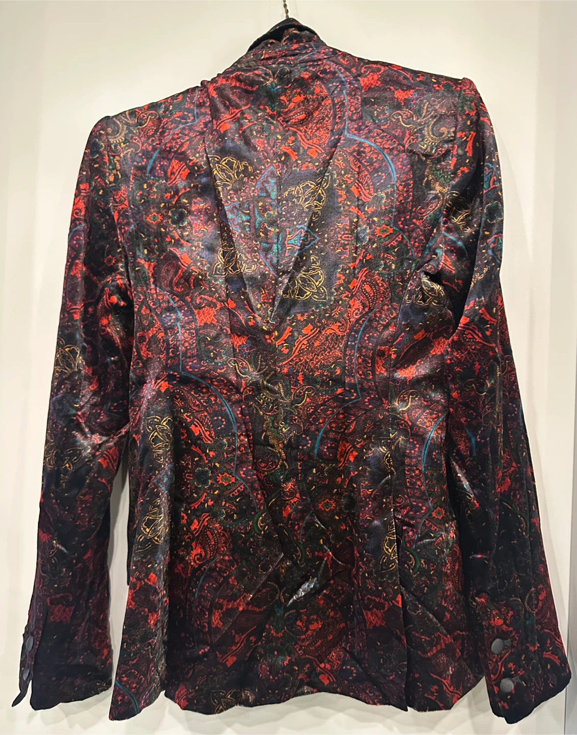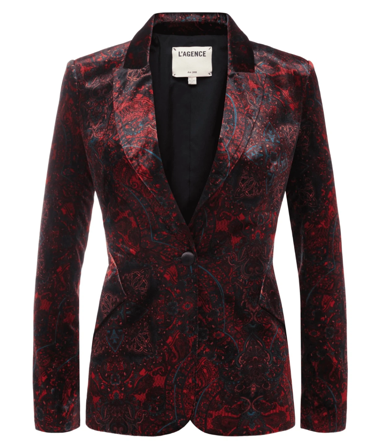 Authentic ❗️expertly tailored Chamberlain Blazer from L'Agence is back for the holidays in a luxurious velvet with a dramatic medallion-paisley print with red, amethyst, and sapphire hues. Strong shoulders and tapered waist emphasize hourglass proportions. F