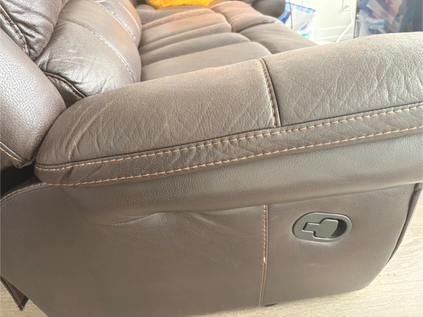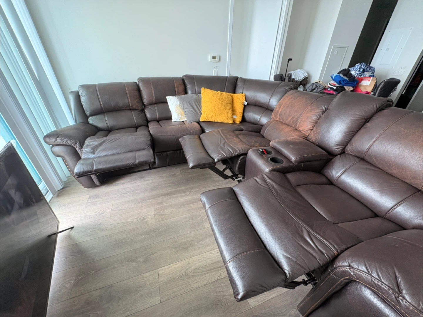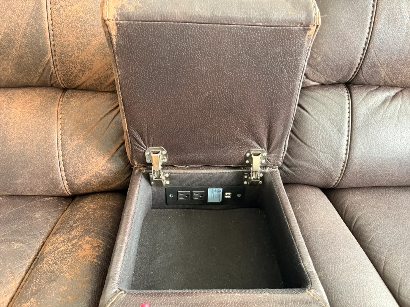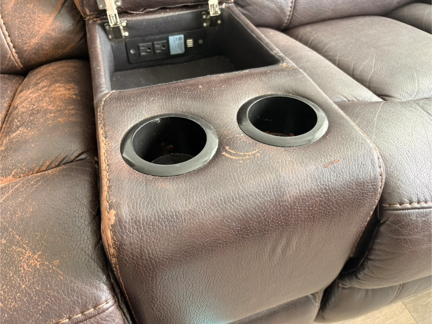 Selling a brown leather sectional recliner sofa. It features built-in cup holders and a storage console with USB and power outlets. It shows some signs of wear. Leather can be repaired as desired.