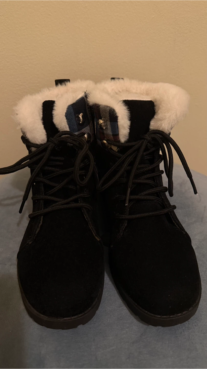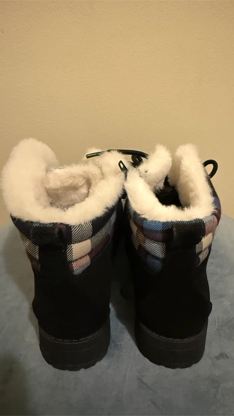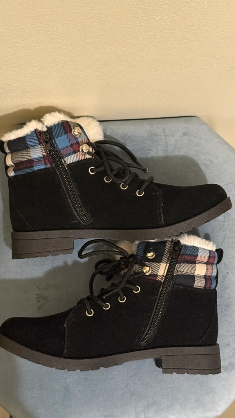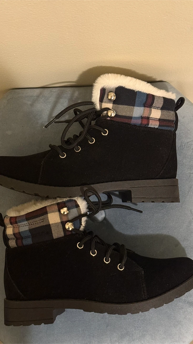 Cute black ankle boots in size 7, no box! They have a stylish plaid trim and cozy faux fur lining around the top. Perfect for adding a touch of style to your fall or winter outfits.