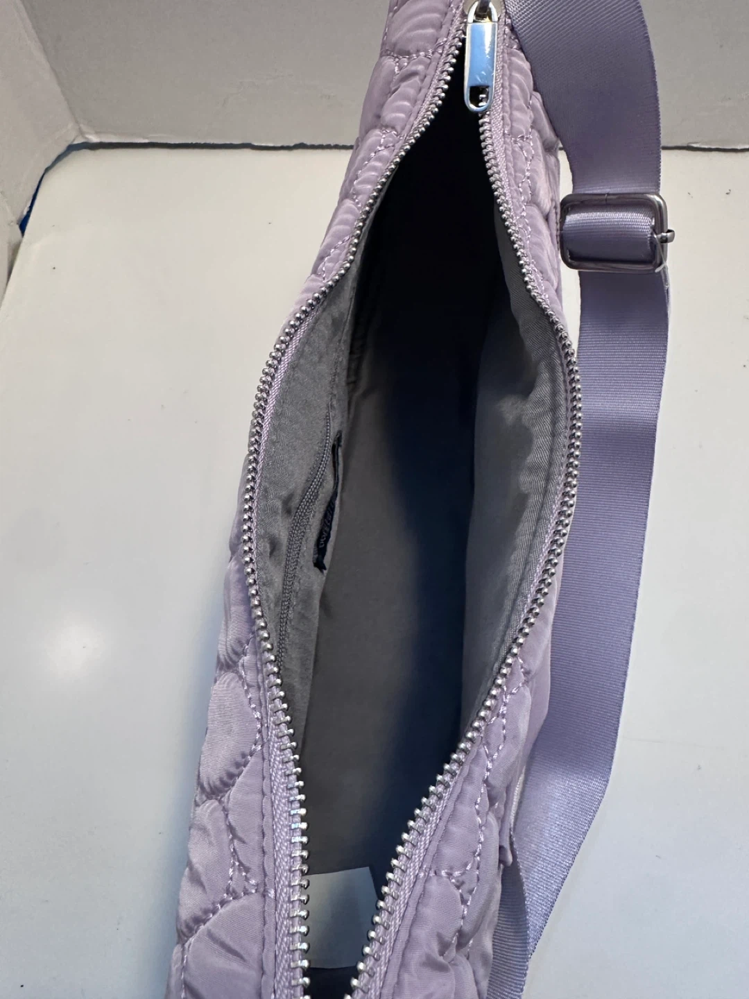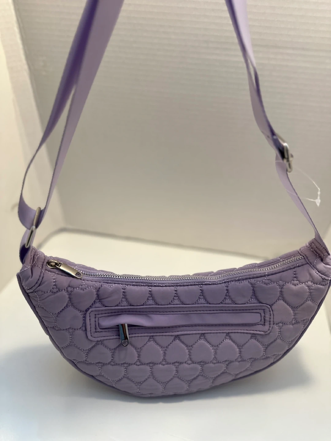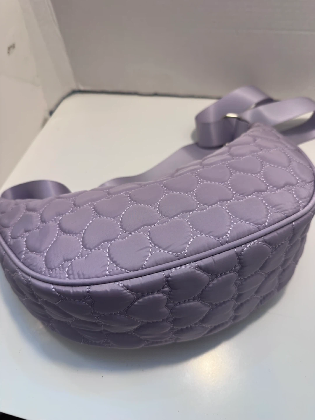 Here's a cute lavender crossbody bag featuring a quilted heart pattern! It's in great condition and ready for a new owner. It's a stylish and practical accessory for everyday use