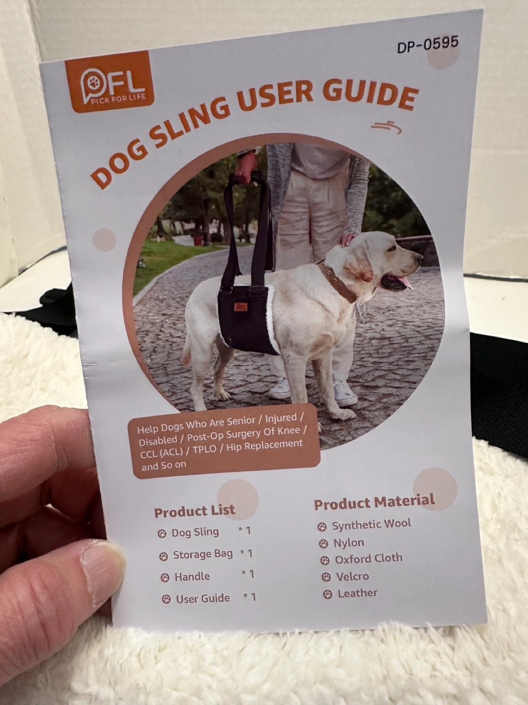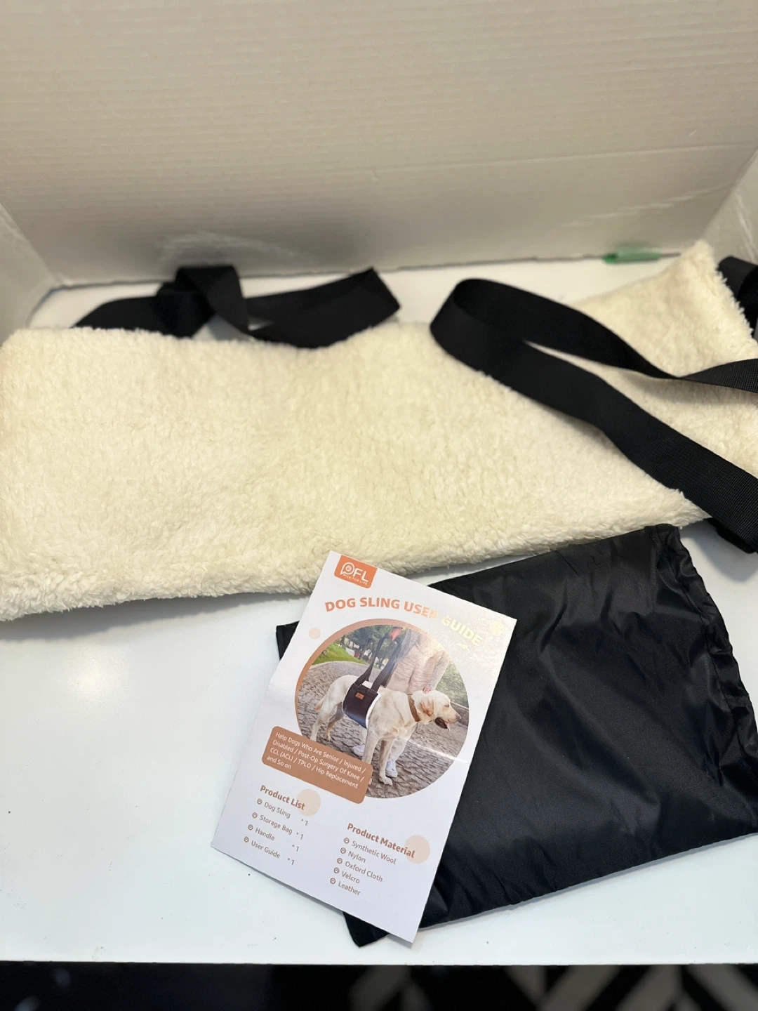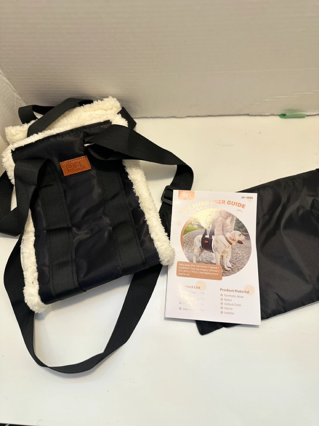 Selling a brand new Pick for Life (PFL) dog sling! It comes with the storage bag, handle, and user guide. It's made with synthetic wool, nylon, Oxford cloth, velcro, and leather. Perfect for helping senior, injured, or disabled dogs!