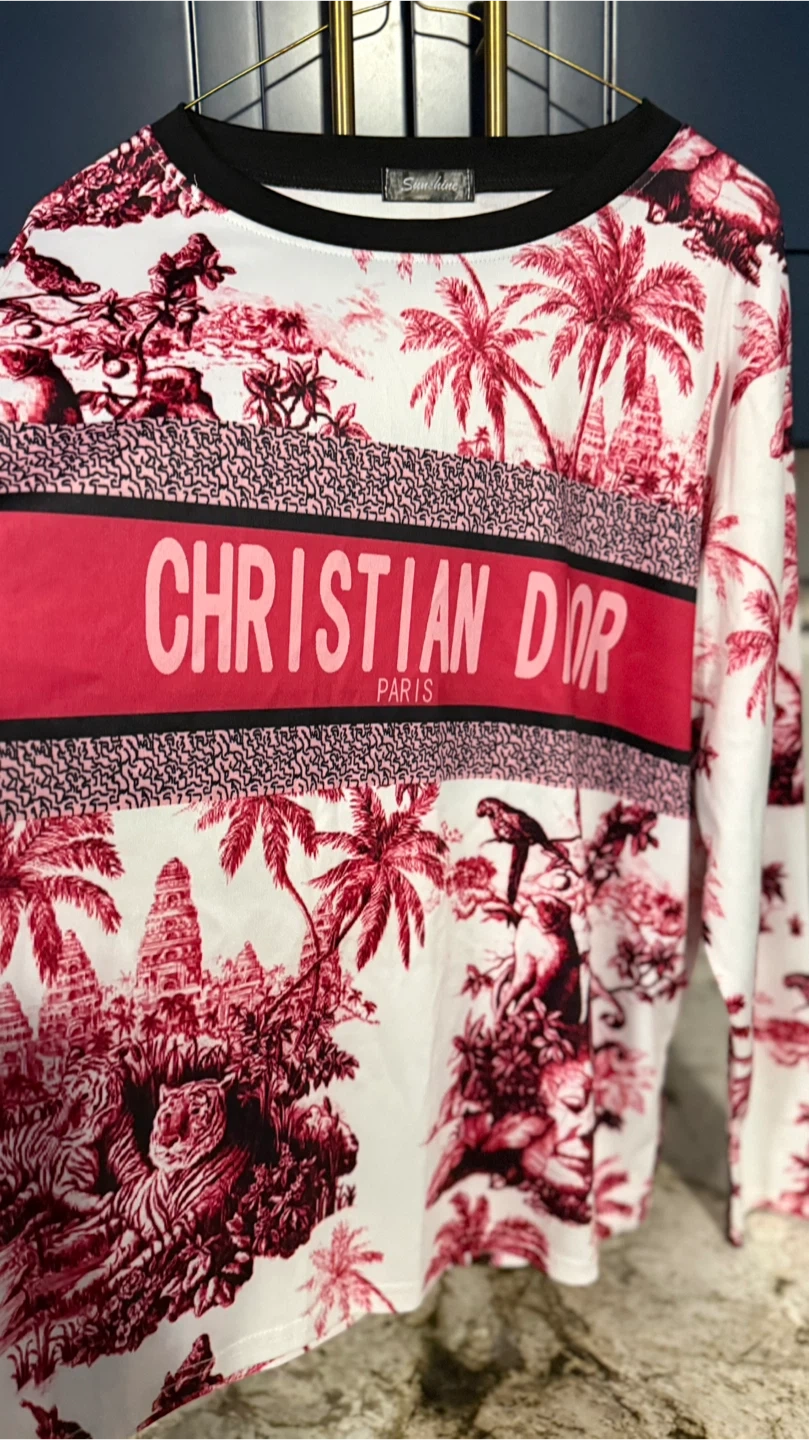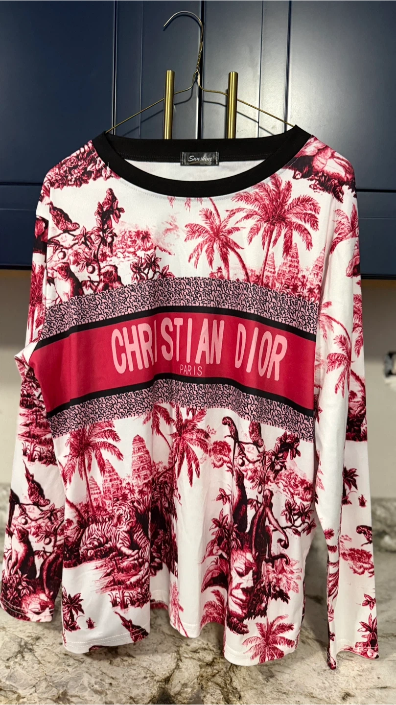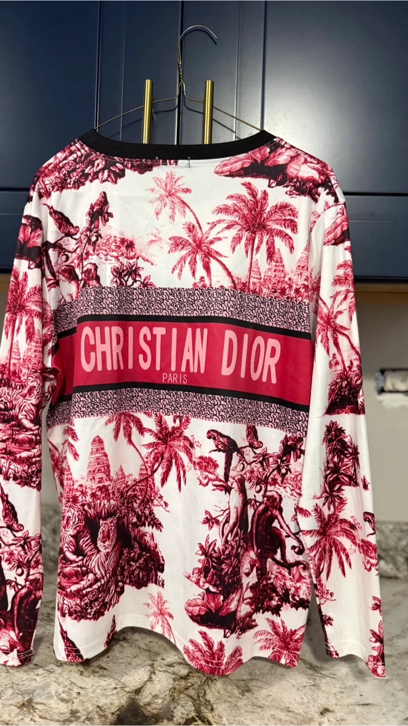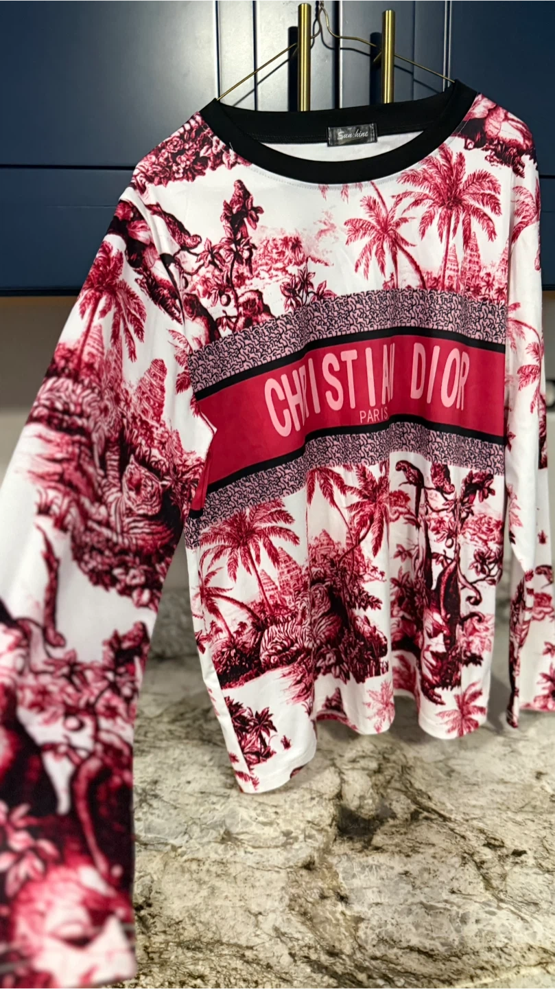 Like new It features a unique design with palm trees and various other elements in a red and white color scheme. This shirt is sure to make a statement!