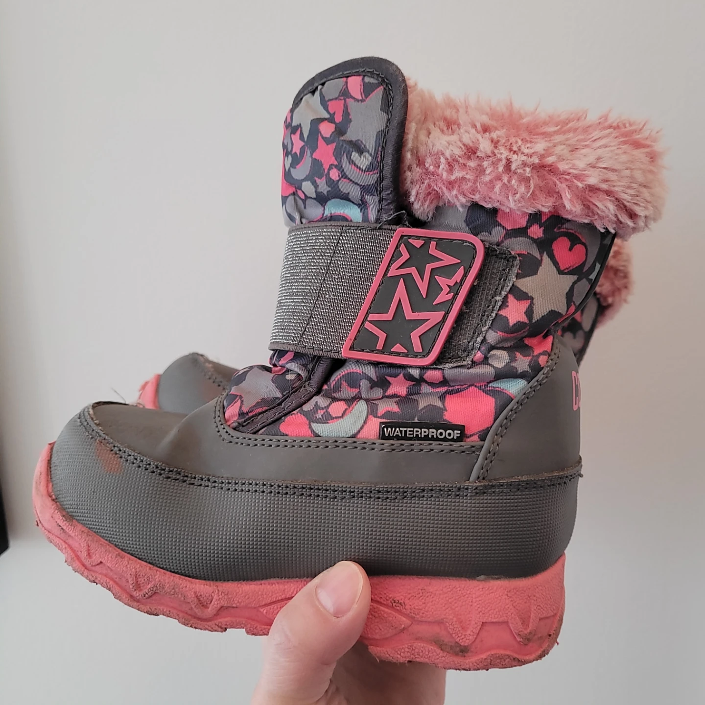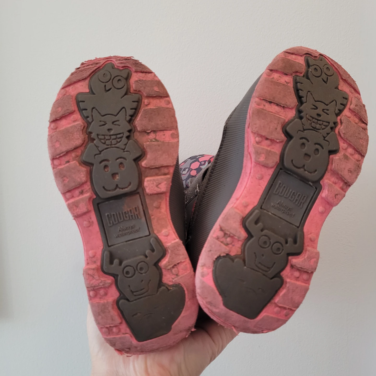 Selling a pair of Cougar kids' winter boots. They are waterproof and have a cute pink and grey floral pattern with stars and hearts. The soles have fun animal designs. Perfect for keeping little feet warm and dry this winter! Size 9C #toddler #kids #child