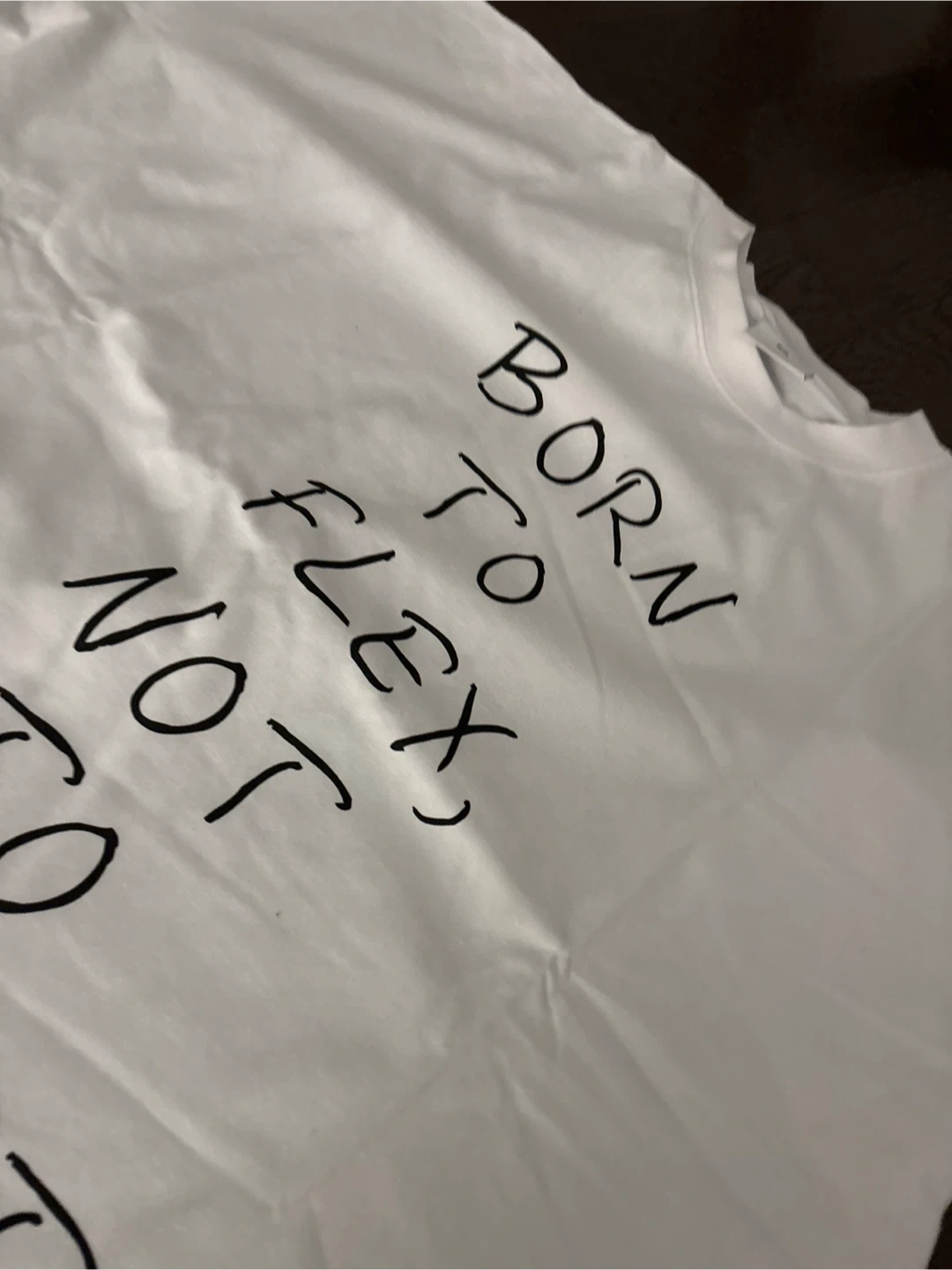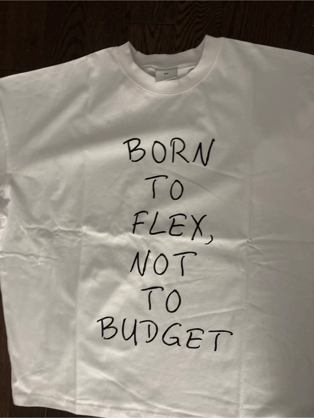 Selling a white t-shirt with the saying "Born to Flex, Not to Budget" printed on it. It's in great condition and ready for a new owner!