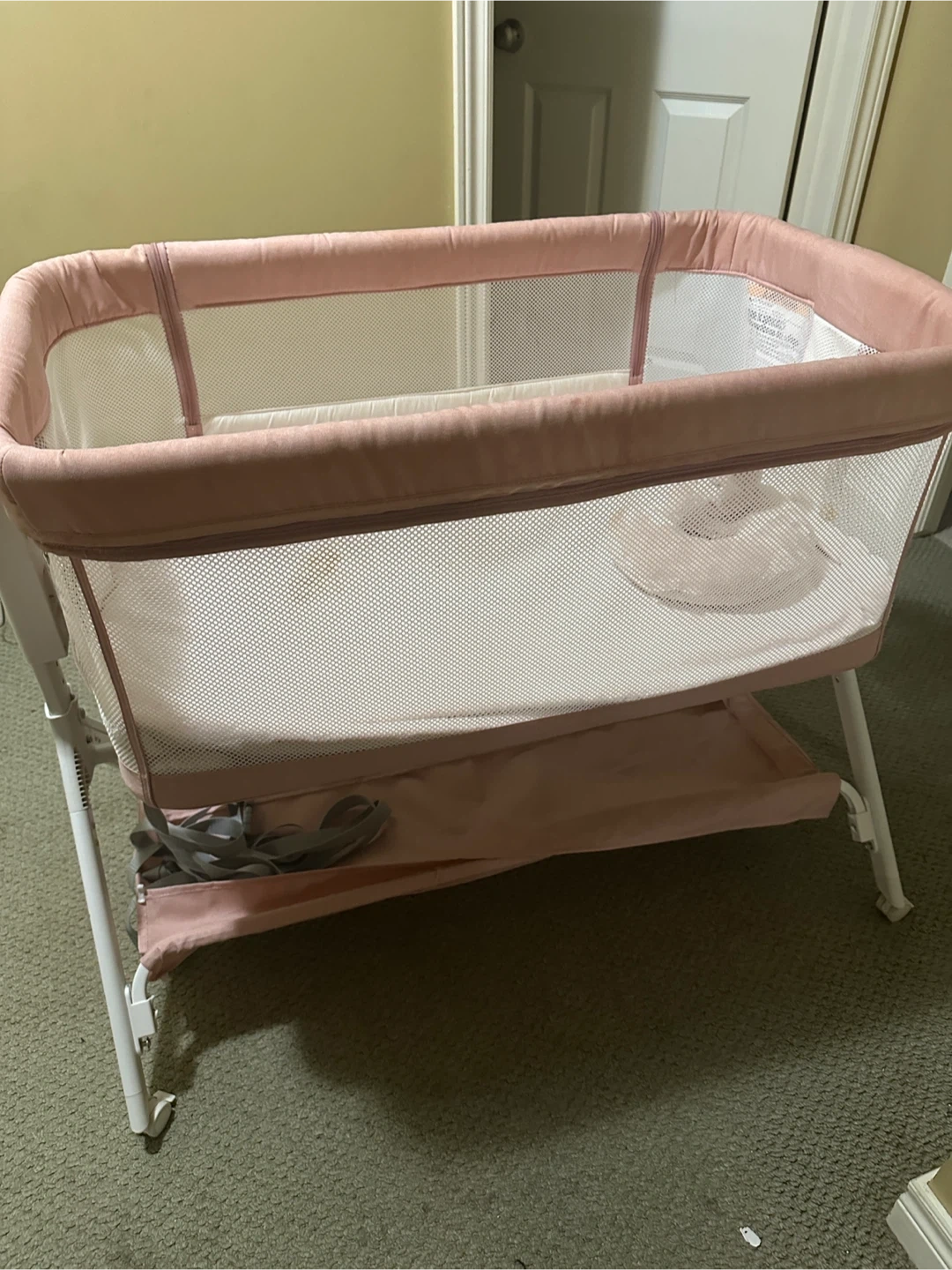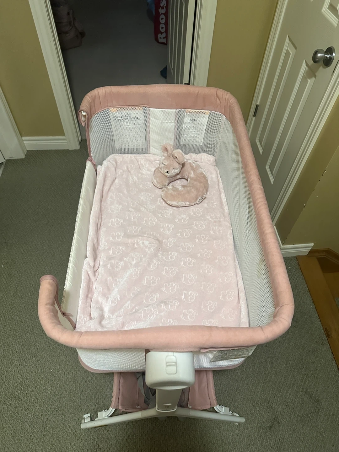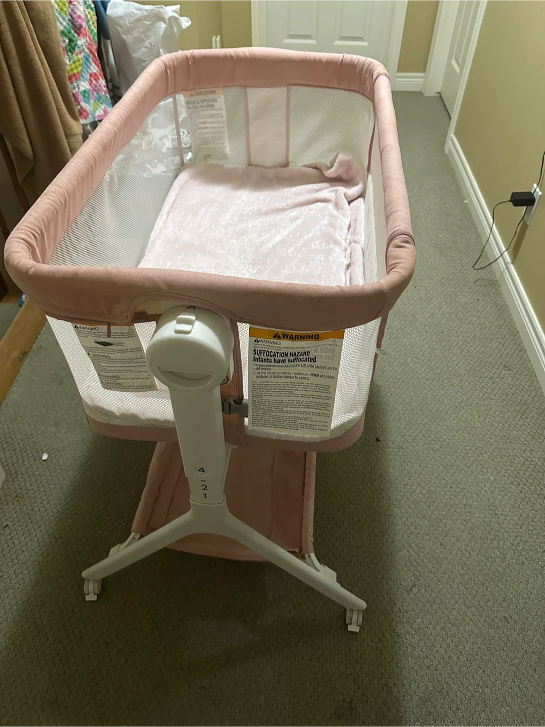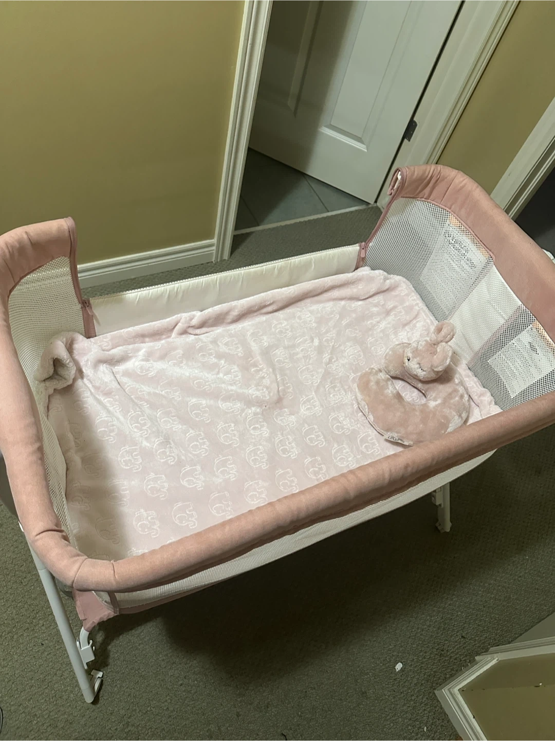 Selling a baby bassinet in pink. It's in great condition and ready for a new little one. Perfect for keeping your baby close by during those early months. It can fit with bed side. It has 6 levels. It is a rocking crib. It comes with free baby pillow and matching blanket