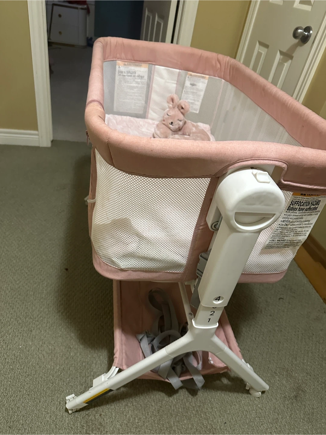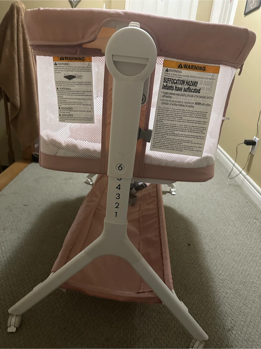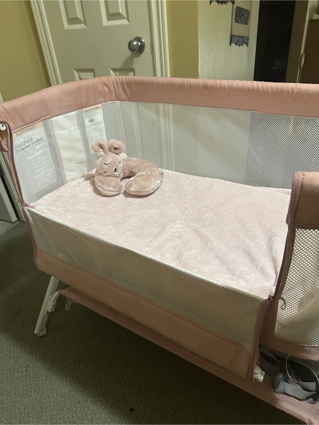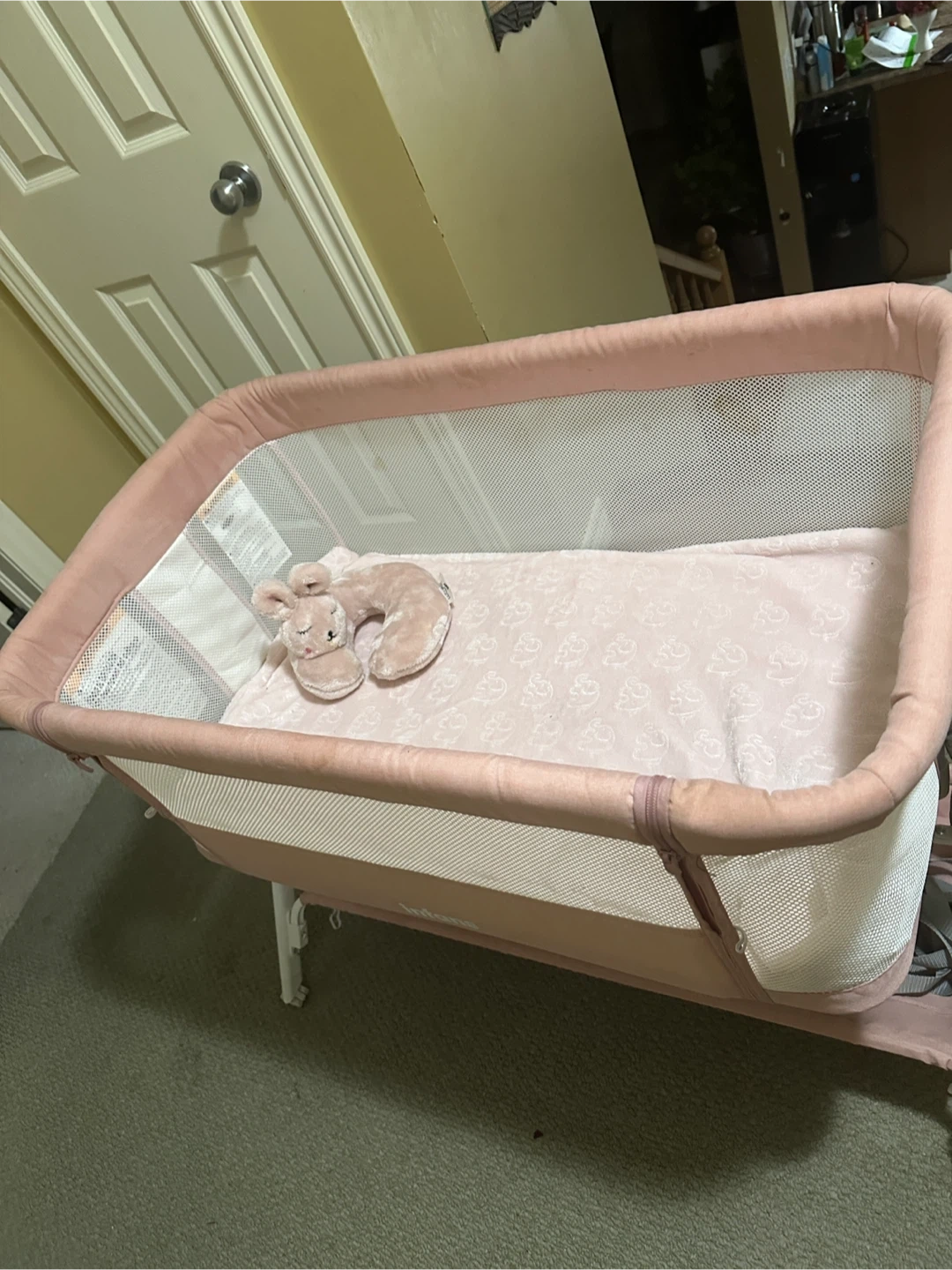 Selling a baby bassinet in pink. It's in great condition and ready for a new little one. Perfect for keeping your baby close by during those early months. It can fit with bed side. It has 6 levels. It is a rocking crib. It comes with free baby pillow and matching blanket