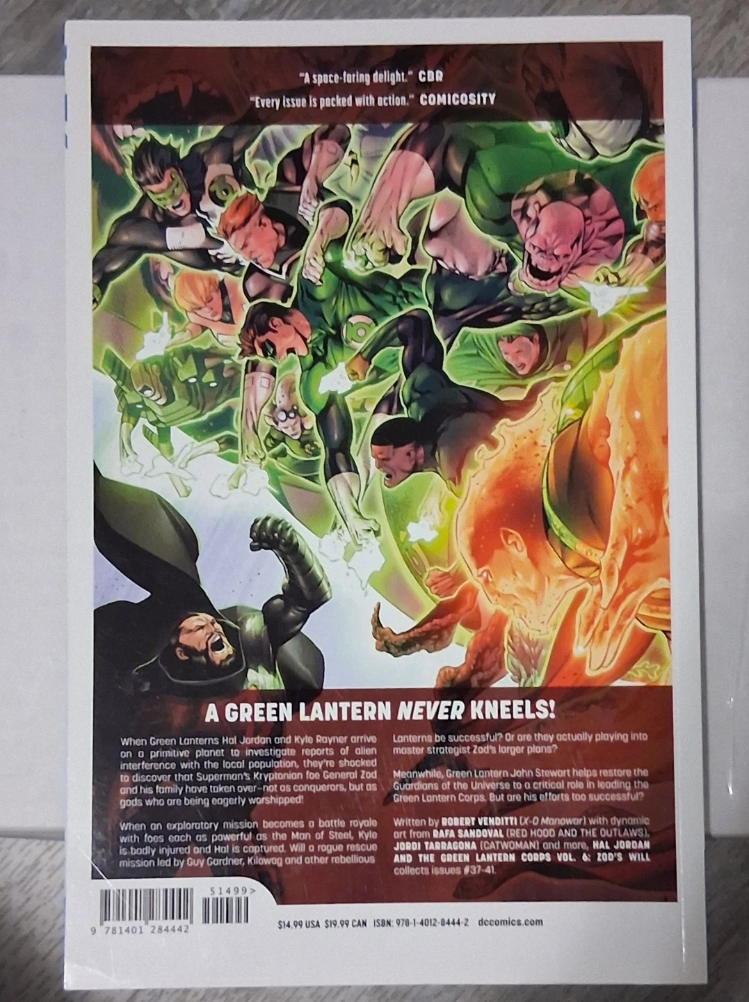 Selling Hal Jordan and the Green Lantern Corps Vol. 6: Zod's Will by Robert Venditti. It's a captivating story filled with action and intrigue! When Green Lanterns Hal Jordan and Kyle Rayner arrive on a primitive planet, they're shocked to discover that Superman's Kryptonian foe General Zod and his family have taken over. The book is packed with action and is a space-faring delight!