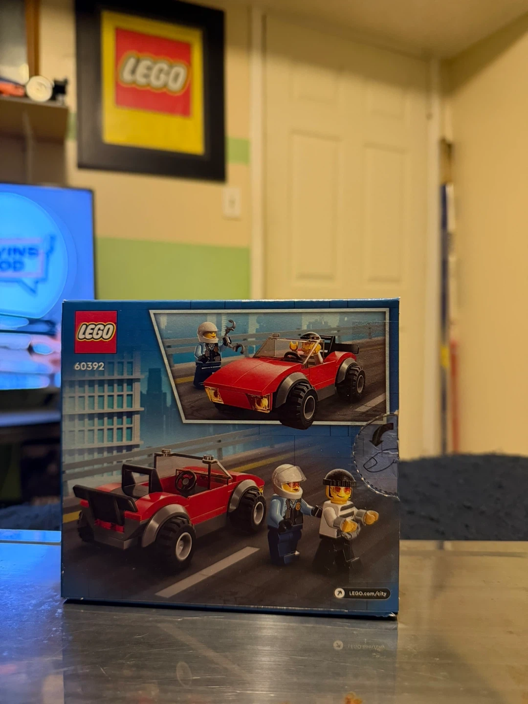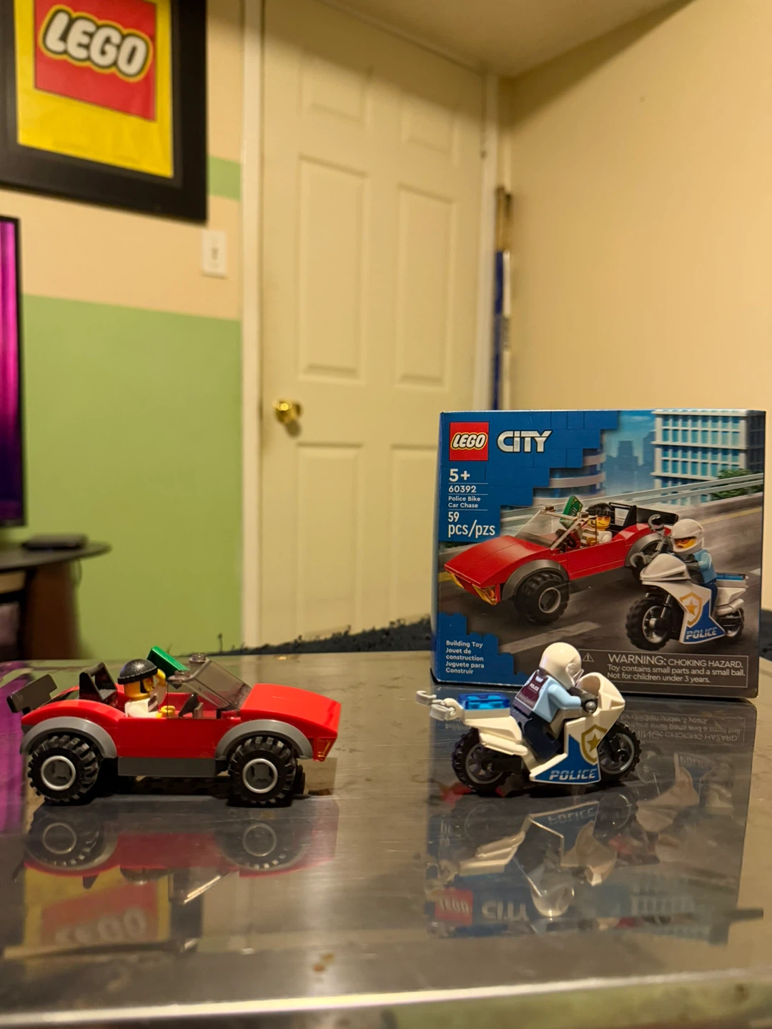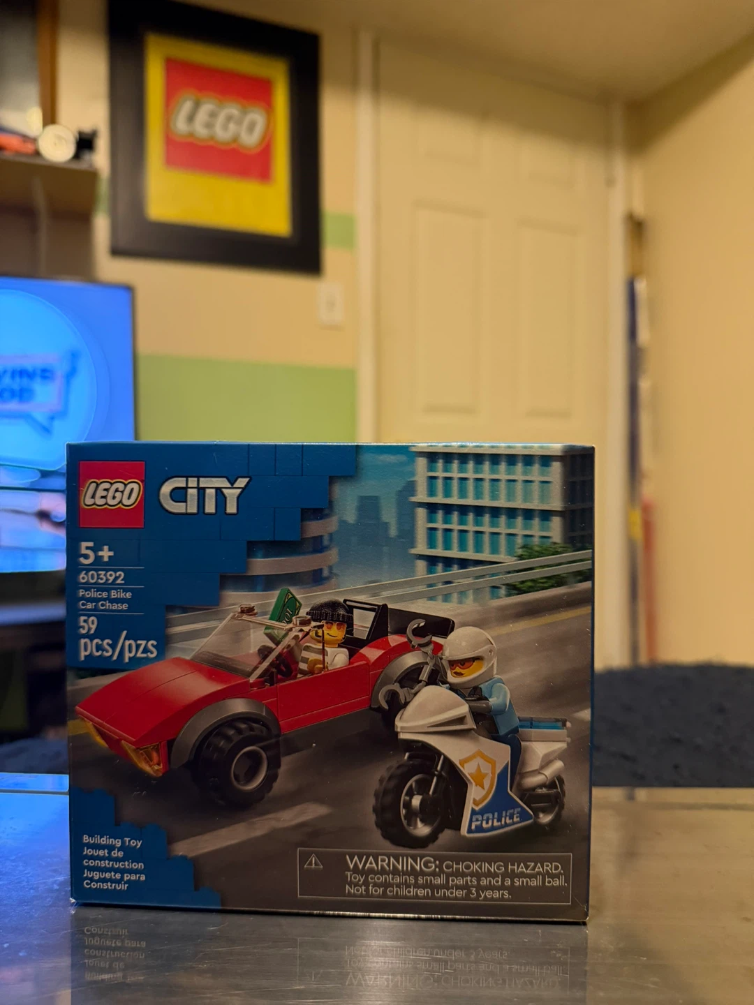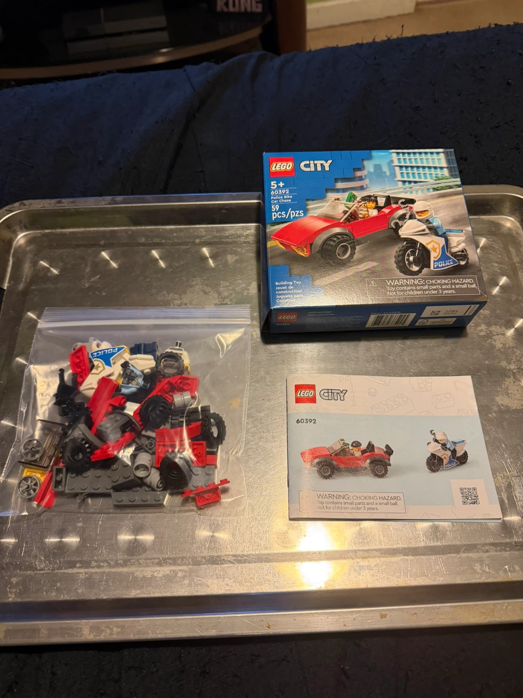 Selling a LEGO City Police Bike Chase set (60392), suitable for ages 5+. It's a fun building toy with 59 pieces to construct a police chase scene with a red car and a police bike. The box is included, along with the instruction booklet! #cleanout