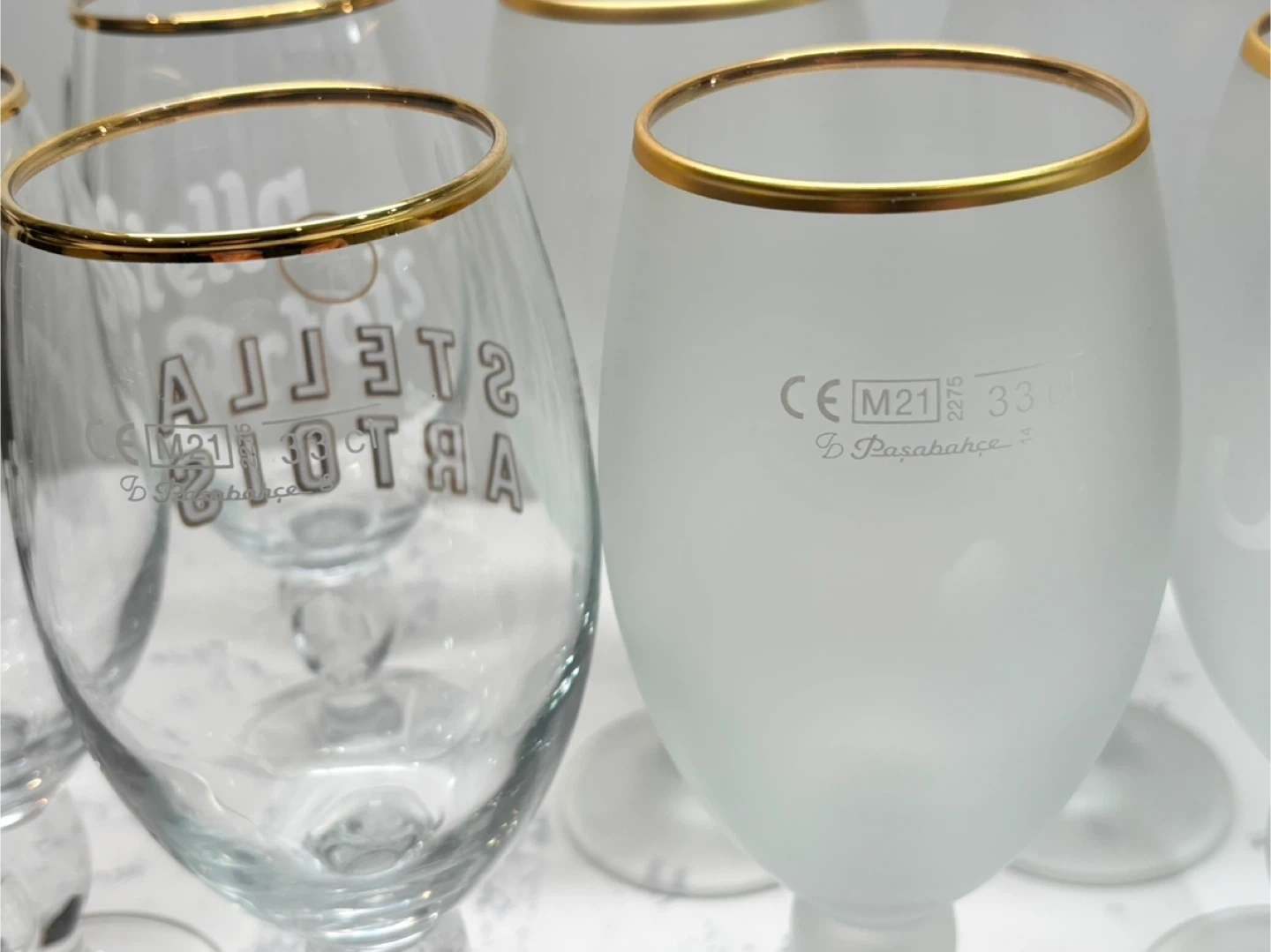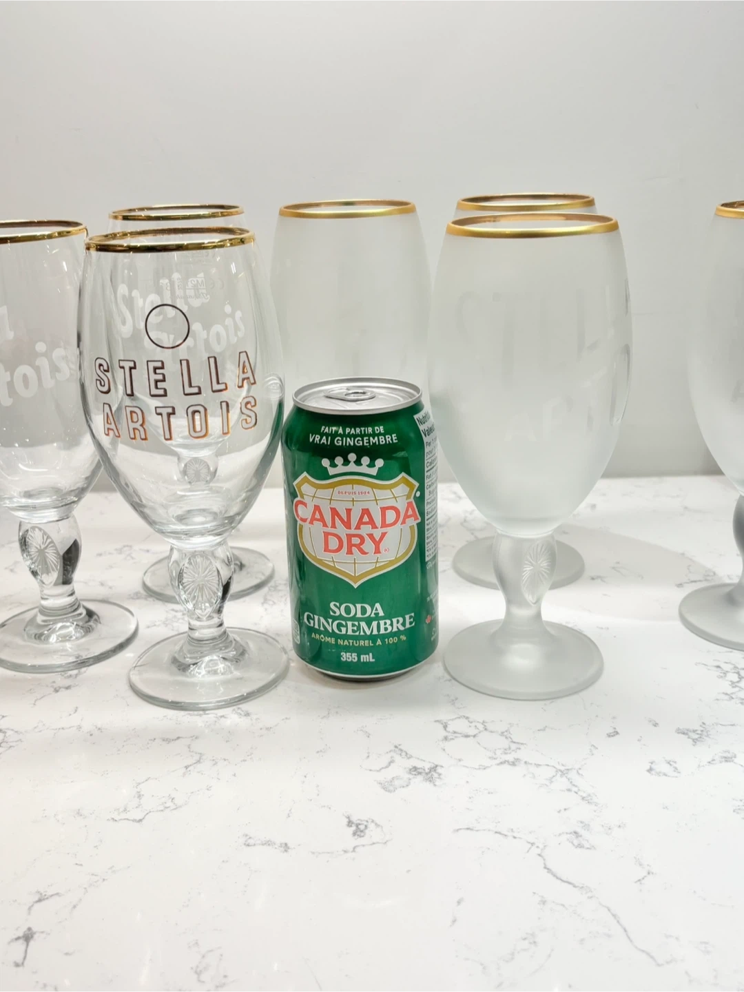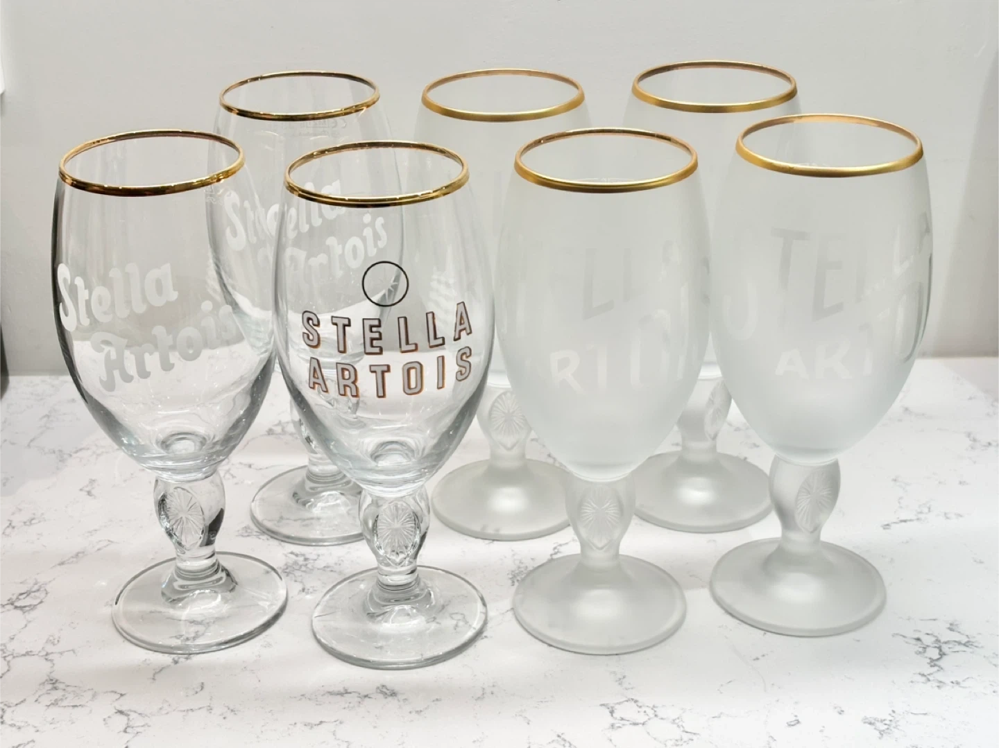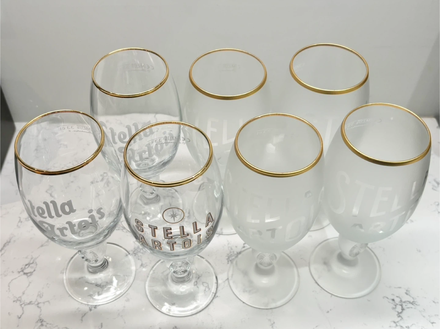Stella Artois beer glasses limited edition . They feature the Stella Artois logo and a gold rim. Perfect for enjoying your favourite brew!
