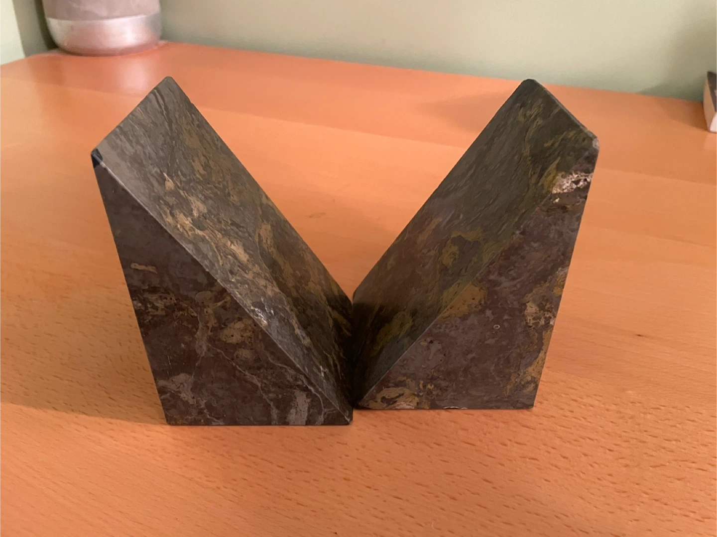 Here's a set of two marble bookends. They have a lovely natural stone pattern and are perfect for keeping your books organized on a shelf or desk! 5” tall