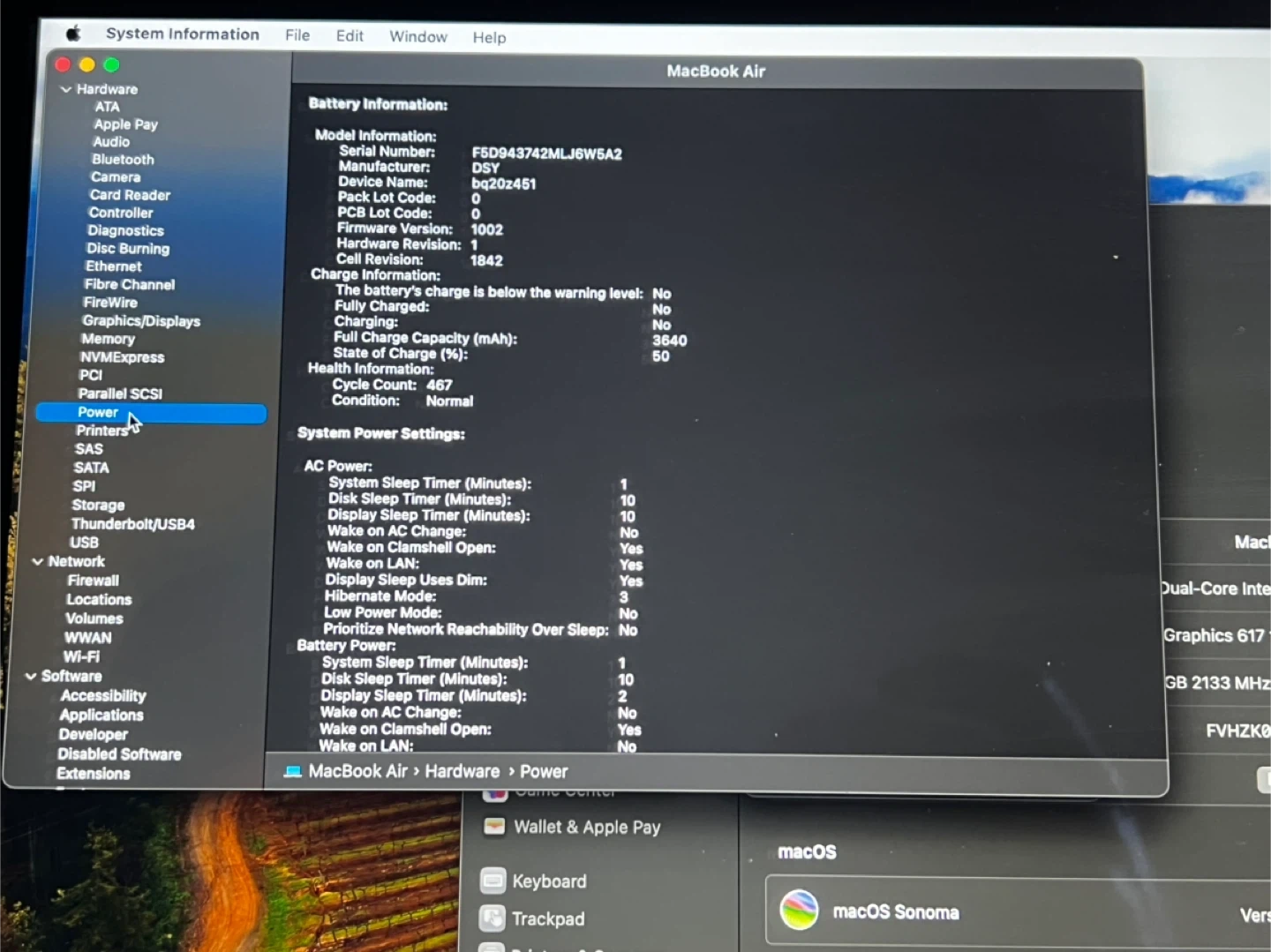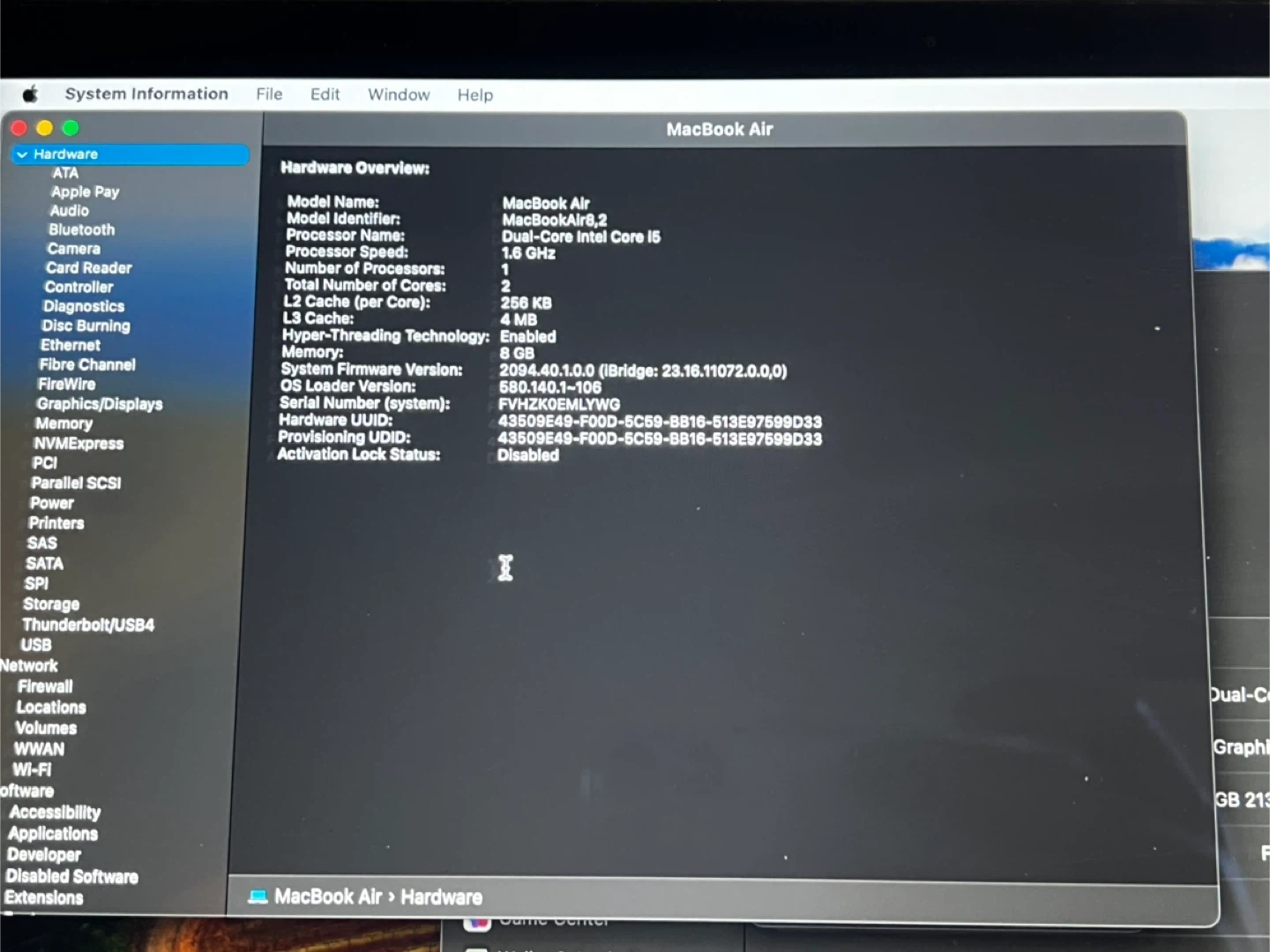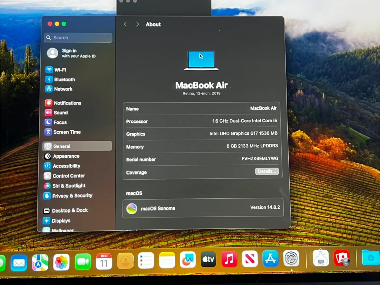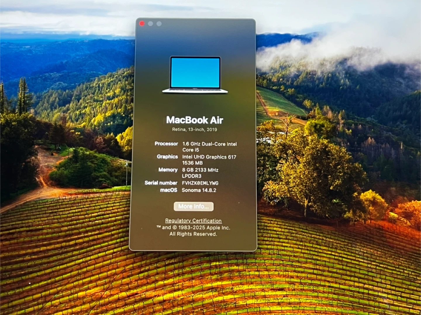 Selling a MacBook Air, 13-inch model from 2019. It has a 1.6 GHz Dual-Core Intel Core i5 processor and 8 GB of memory. The graphics card is an Intel UHD Graphics 617 1536 MB. Runs macOS Sonoma 14.8.2
