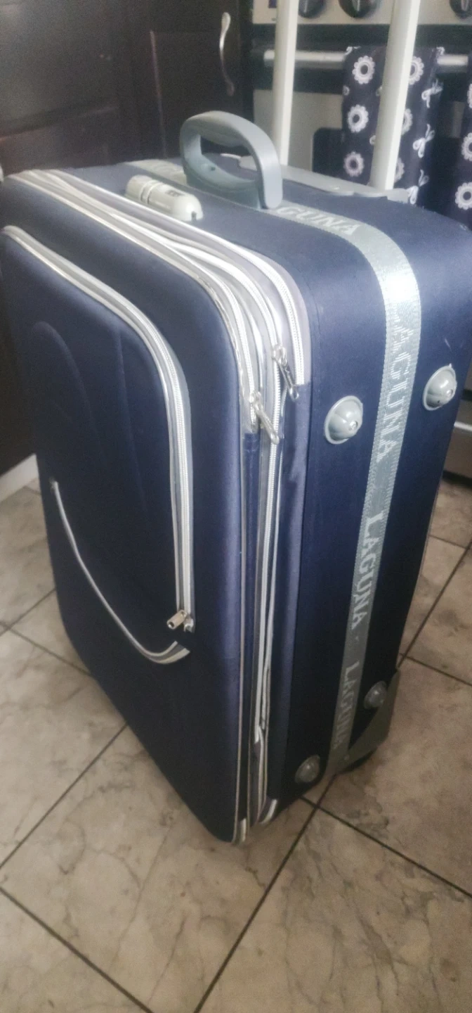 I'm selling a Laguna 28-inch suitcase in navy blue. It's expandable, so you can pack even more! It has a retractable handle and wheels for easy transport. Pickup near Harlem and Devon Chicago 60631